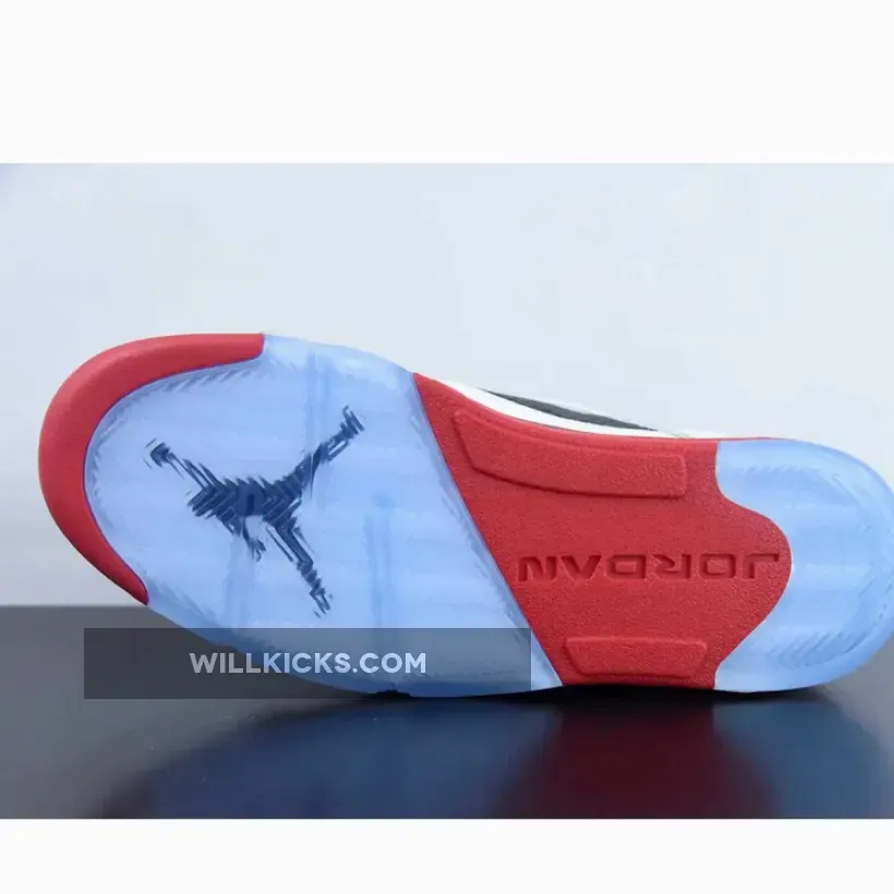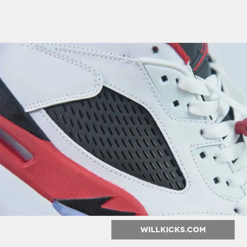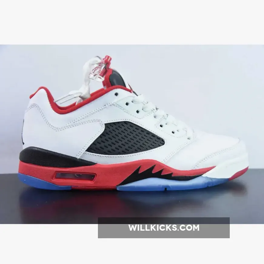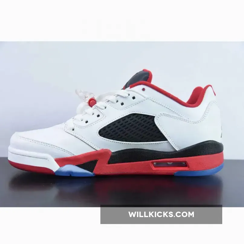 This “Fire Red” Air Jordan 5 Low is dressed in a White, Fire Red, and Black color scheme.