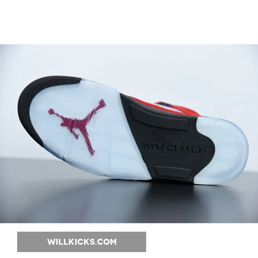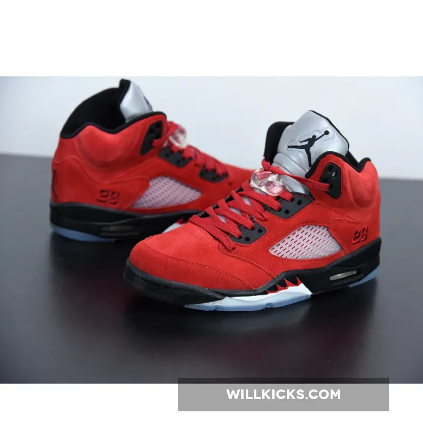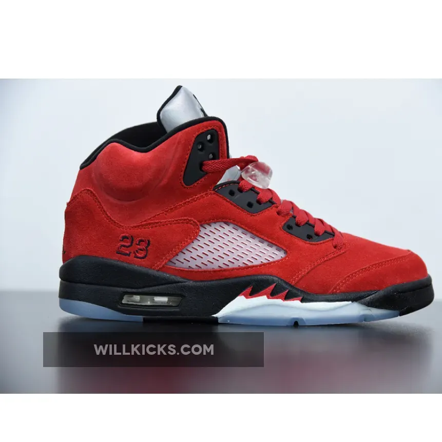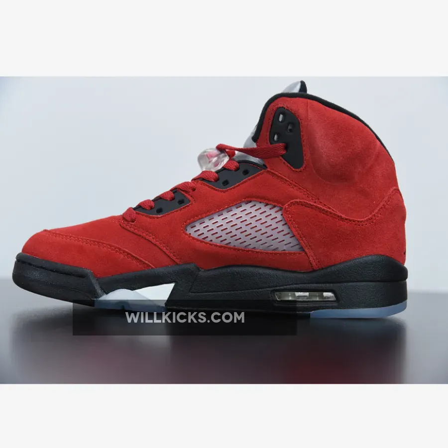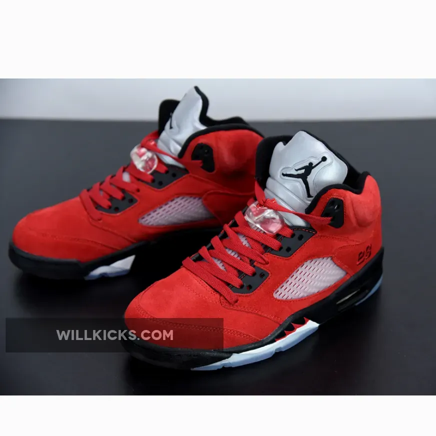 Air Jordan 5 ‘Raging Bull’ delivers! Premium suede uppers in Varsity Red & Black, alongside reflective tongues & icy translucent outsoles make for a striking look. Perfect blend of classic design & modern features. #AJ5 #RagingBull #Sneakers.