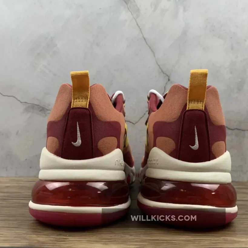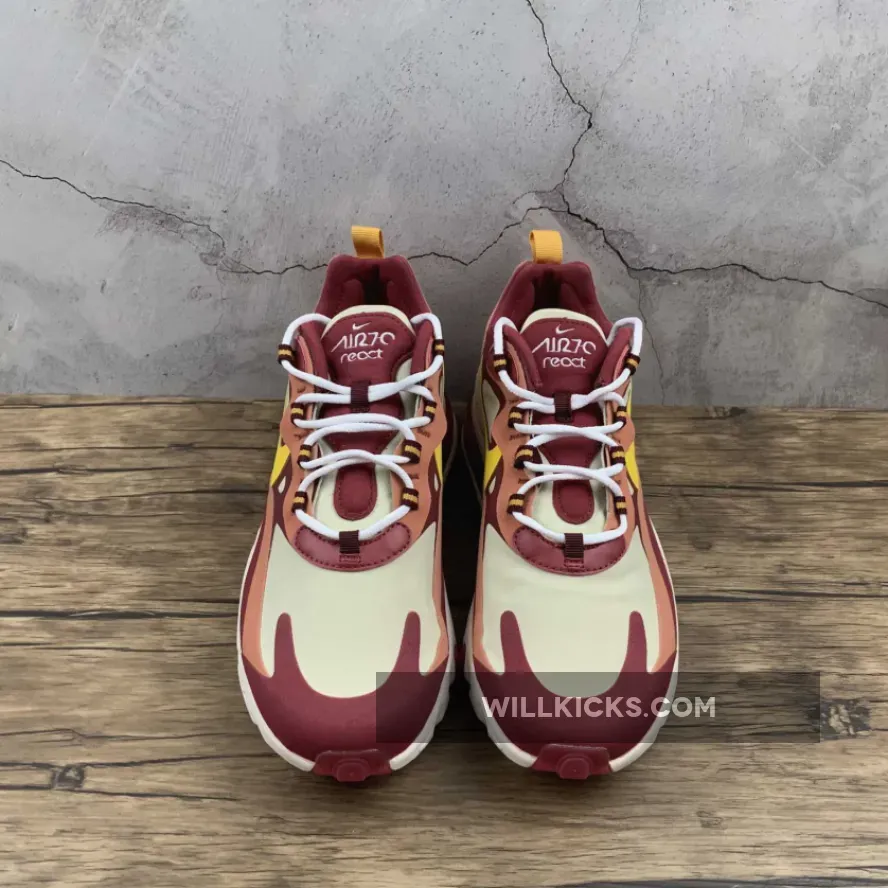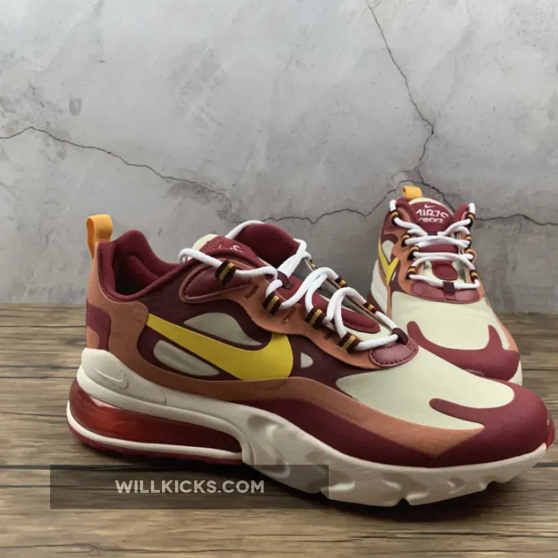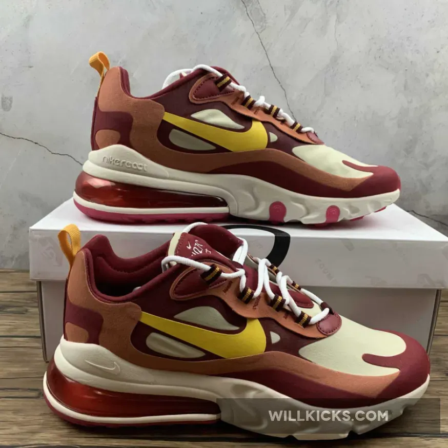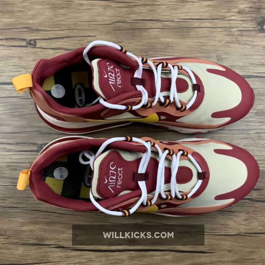 The brand new Nike Air Max 270 React Red Peach is fiery hot… Literally! The latest and greatest colourway to launch as part of the AM270R line, this high heat hybrid is a must cop for any sneaker collection. Made for those who want to inject a vibrant pop of colour into their autumn rotations, if that sounds a bit like you, then this shoe has your name written all over it!Featuring the revolutionary no-sew upper that caught the imaginations of sneakerheads earlier this year, the Air Max 270 React Red Peach is painted in various shades of red and touched up with cream accents across the laterals, medials and the toe box. A striking yellow Swoosh shoots across the side panels, and this is complemented by the eyestays that help tie the shoe together.Now, you can’t talk about this new shoe without mentioning its innovative silhouette. With React foam at the front, the heel is made from an Air bubble for twice the comfort and response. This is lined with a cherry red rubber outsole, finalising the design.October 21st is the date you need to remember if you want the Nike Air Max 270 React Red Peach in your personal collection! While it may not sell out instantly, these popular sizes are going to fly off the shelves, so make sure you grab yours while it’s in stock!