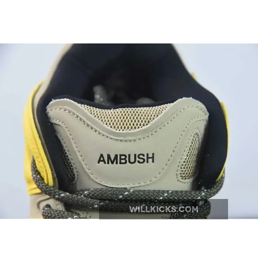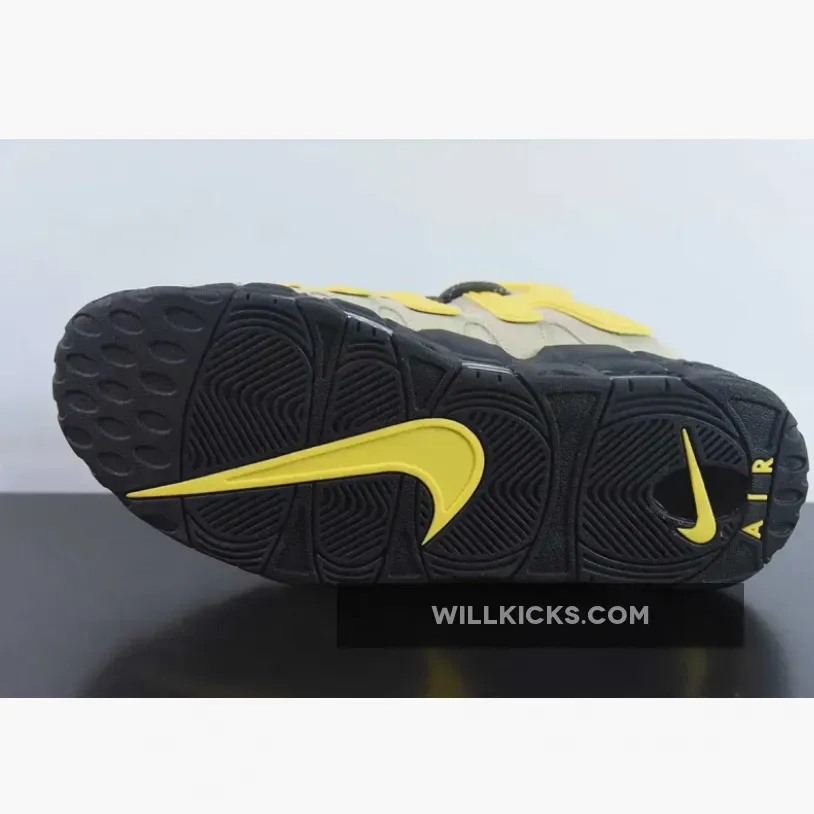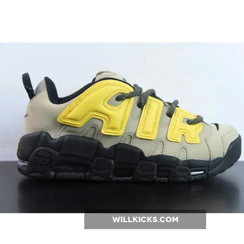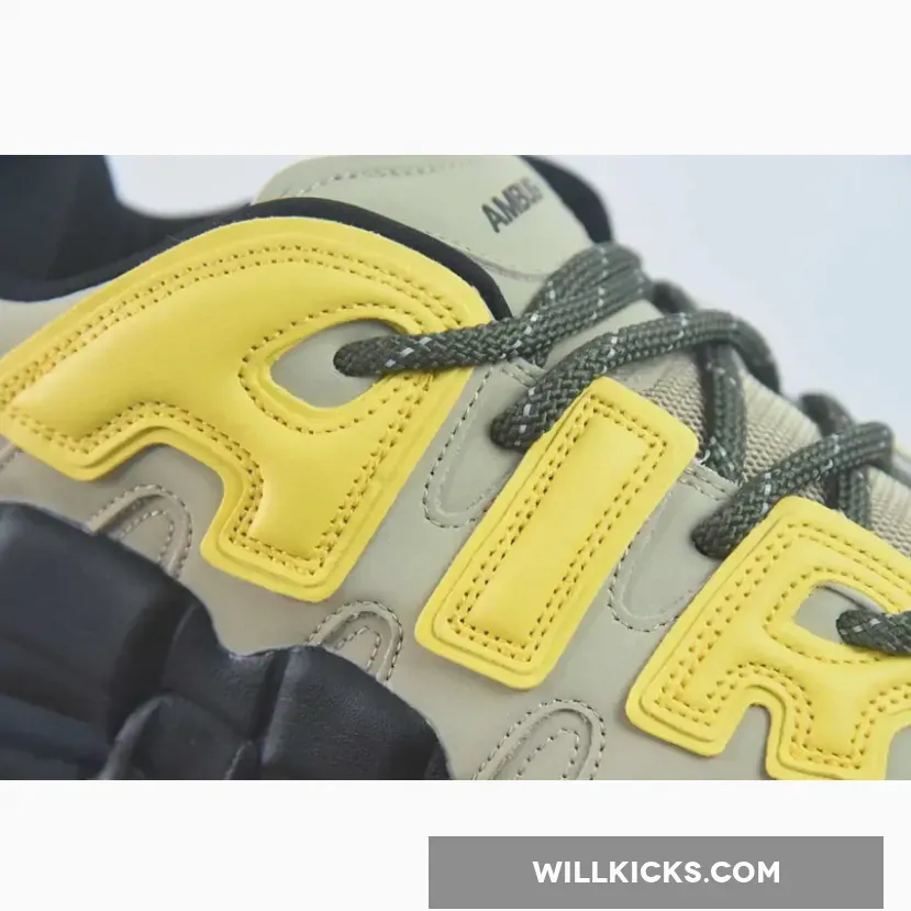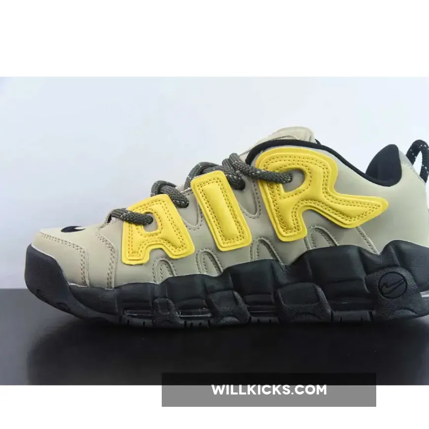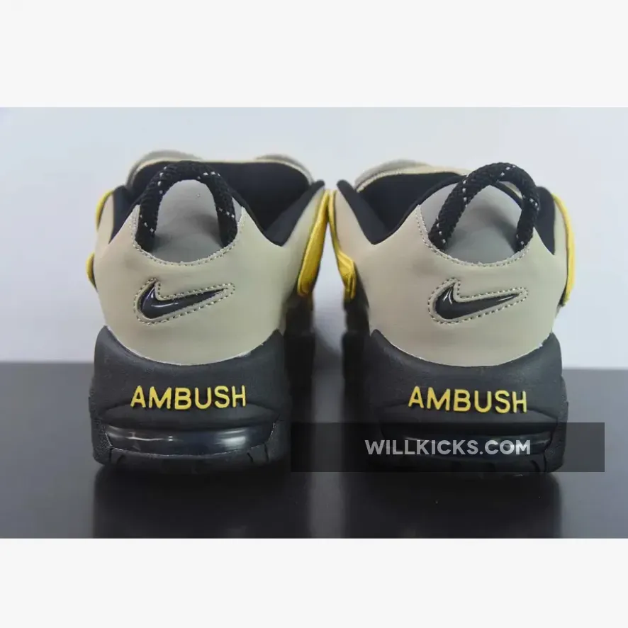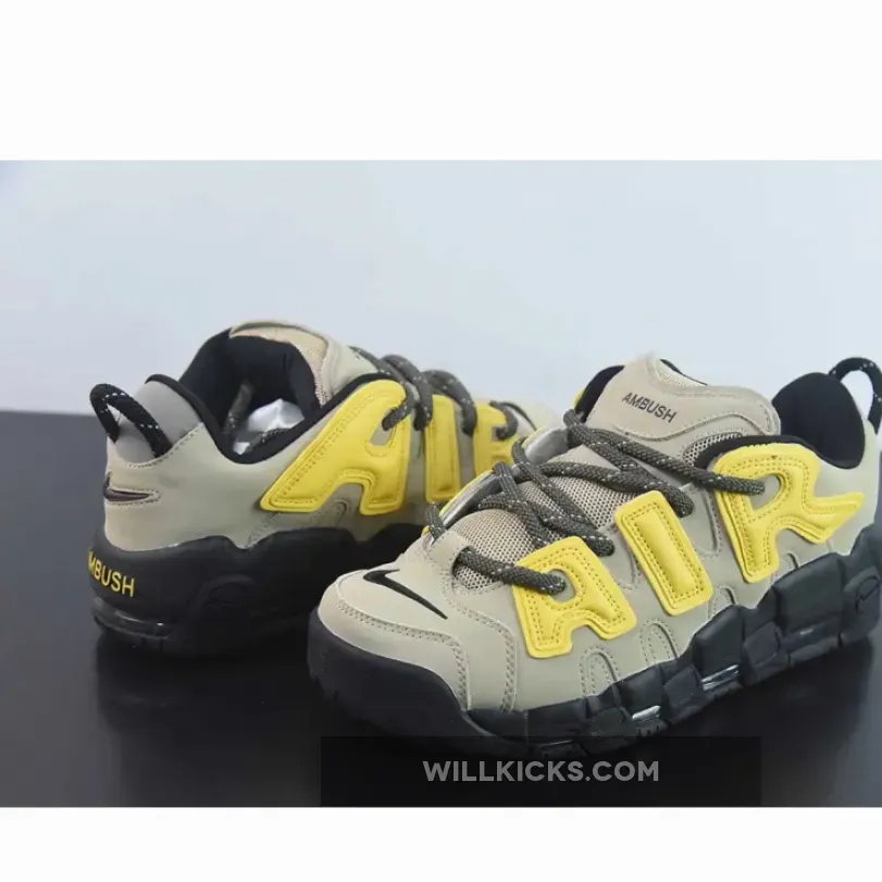 The Nike X Ambush Air More Uptempo Low ‘Limestoner’ features a Tan nubuck upper, Black embroidered mini Swoosh, and Yellow accents, creating a versatile look..