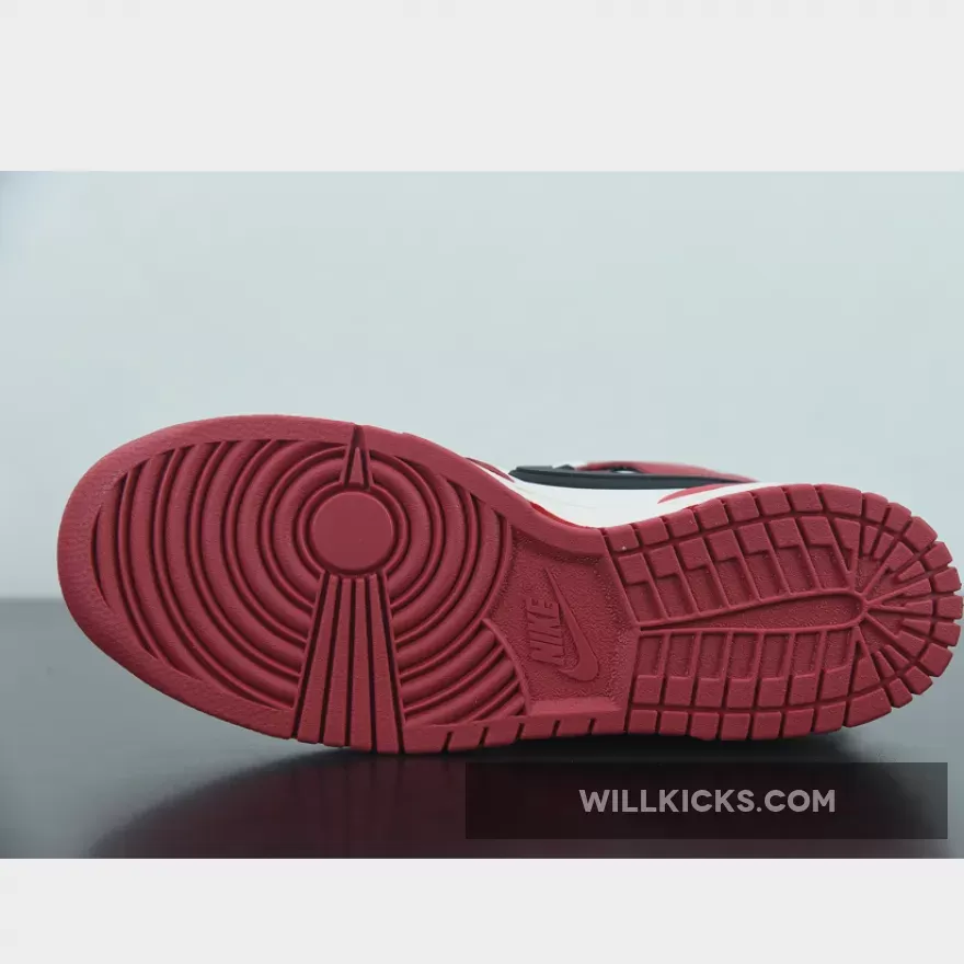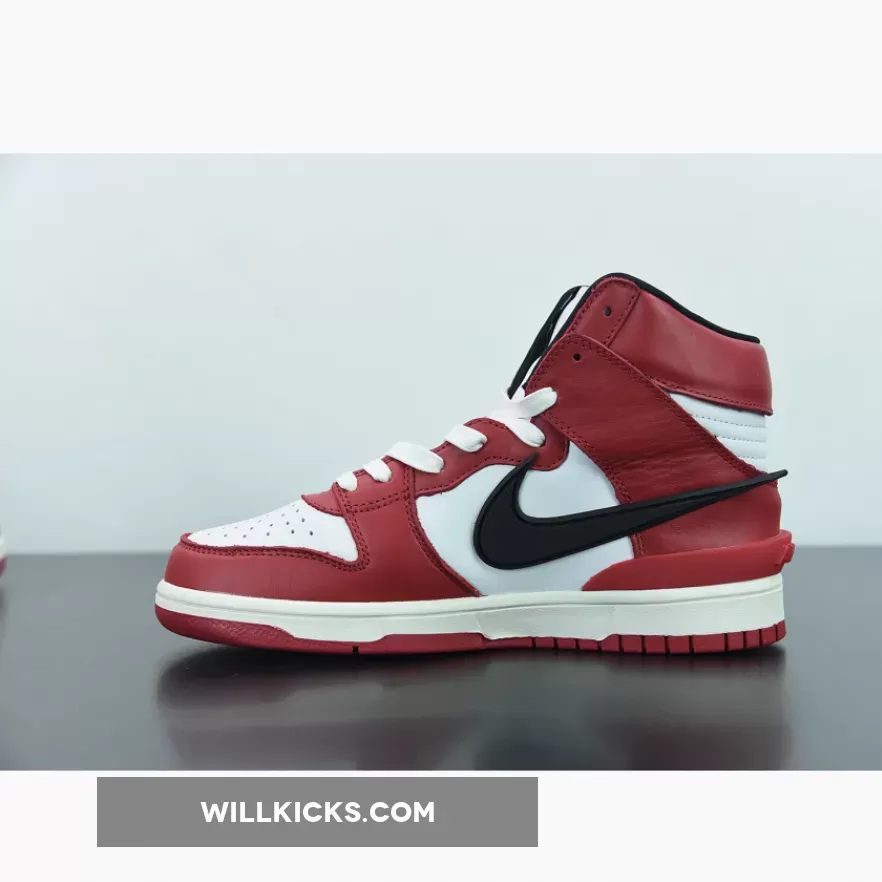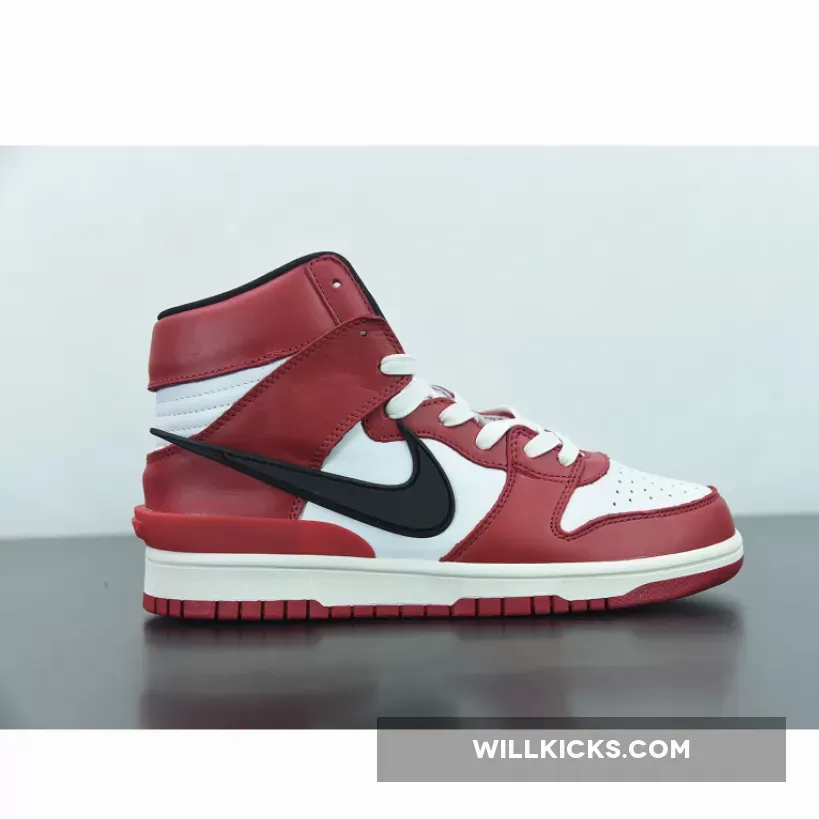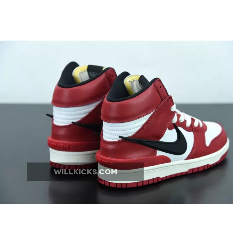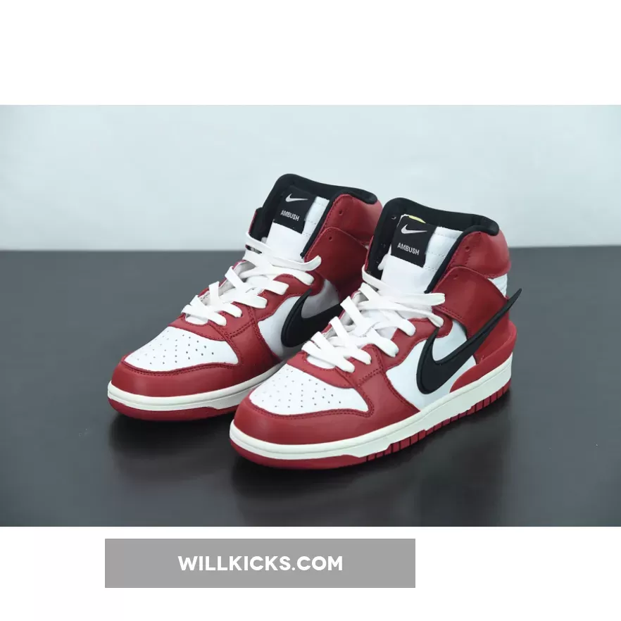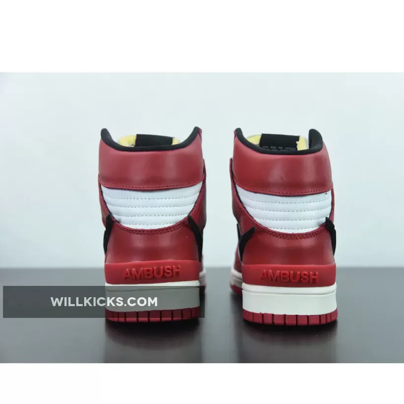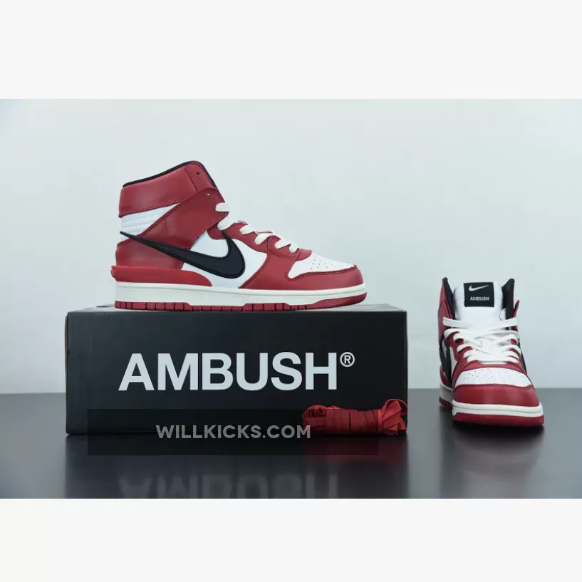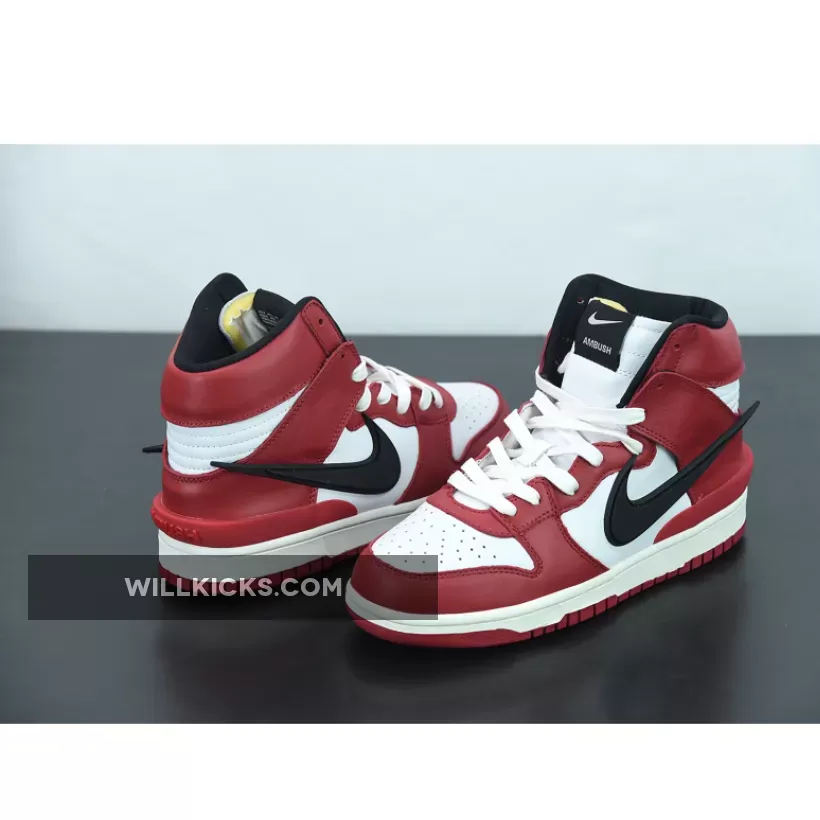 This offering of Ambush’s Nike Dunk High sports the popular “Chicago” color blocking. It features a White leather upper with Red leather overlays and her signature Swooshes in Black extending beyond the heel. Black tongue labels and inner lining atop a Sail midsole and Red rubber outsole completes the design.