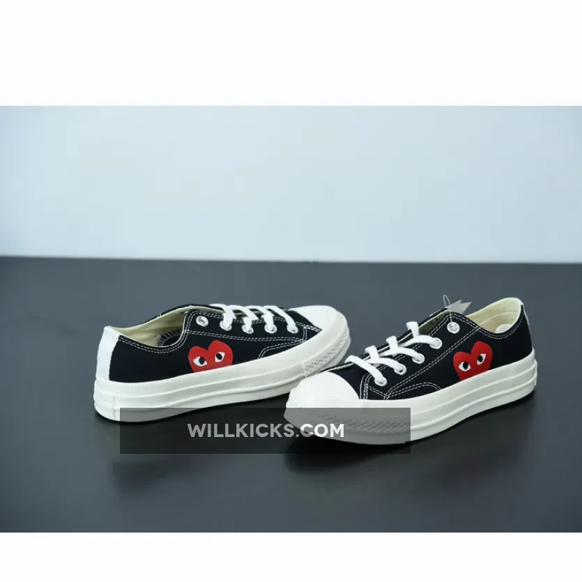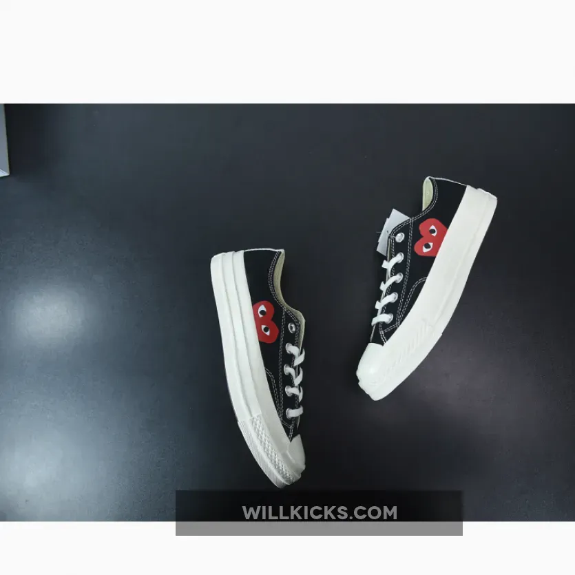 Designed by graphic artist Filip Pagowski and Comme des Garçons founder Rei Kawakubohe, the Comme des Garçons x Chuck Taylor 1970 Low ‘Play’ is a special edition colorway that features a black canvas upper with an oversized signature CDG red heart printed at the quarter panels.