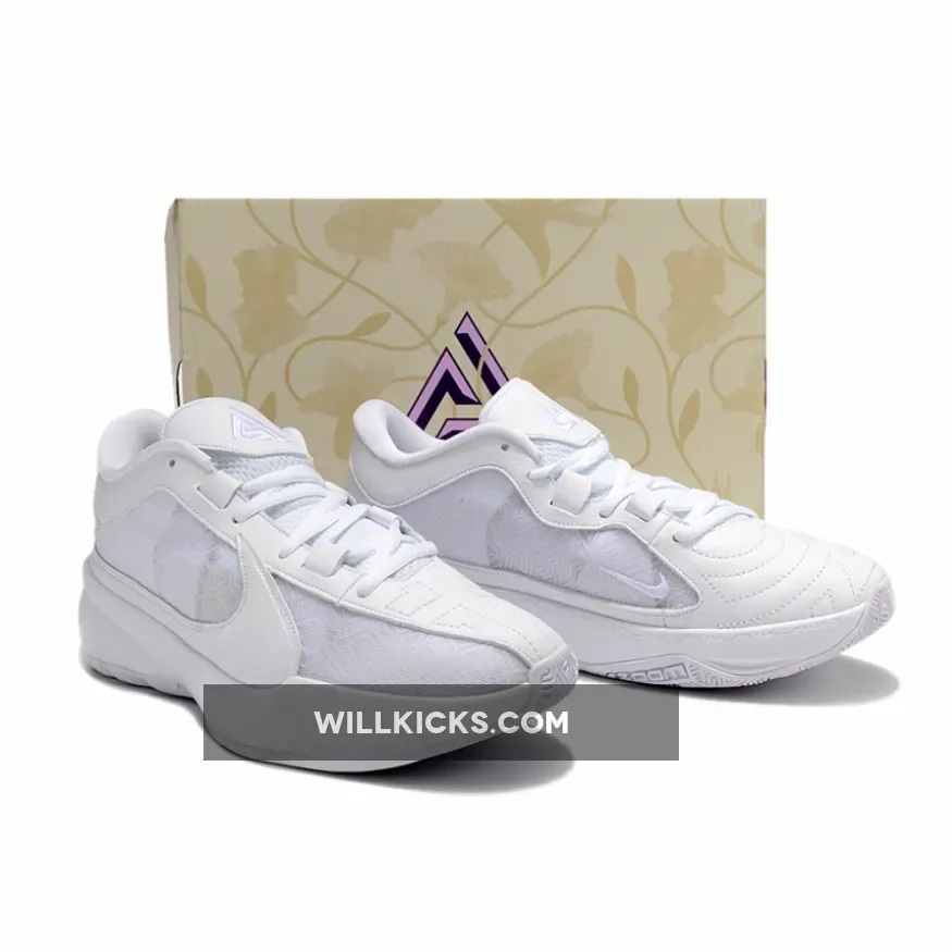 The Zoom Freak 5 White also boasts several advanced features that enhance its performance and functionality. The shoe has a mesh tongue and sock liner that provide breathability and comfort, as well as an embroidered Giannis logo on the tongue and a Nike Air logo on the heel.