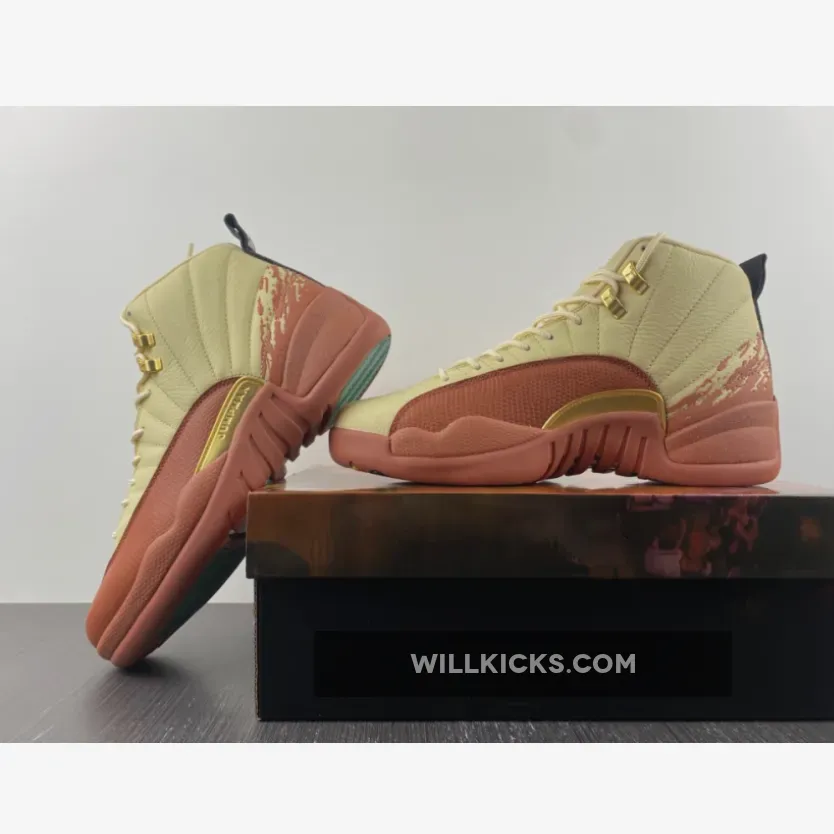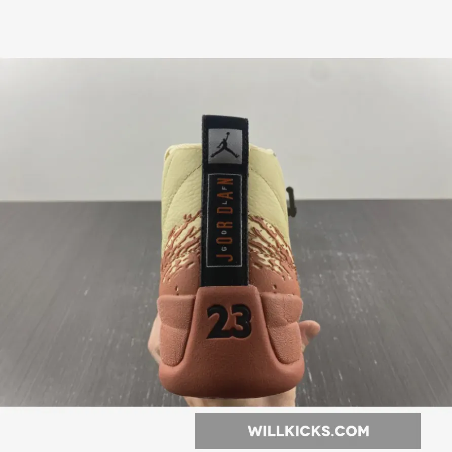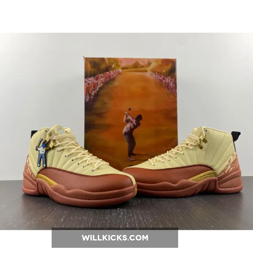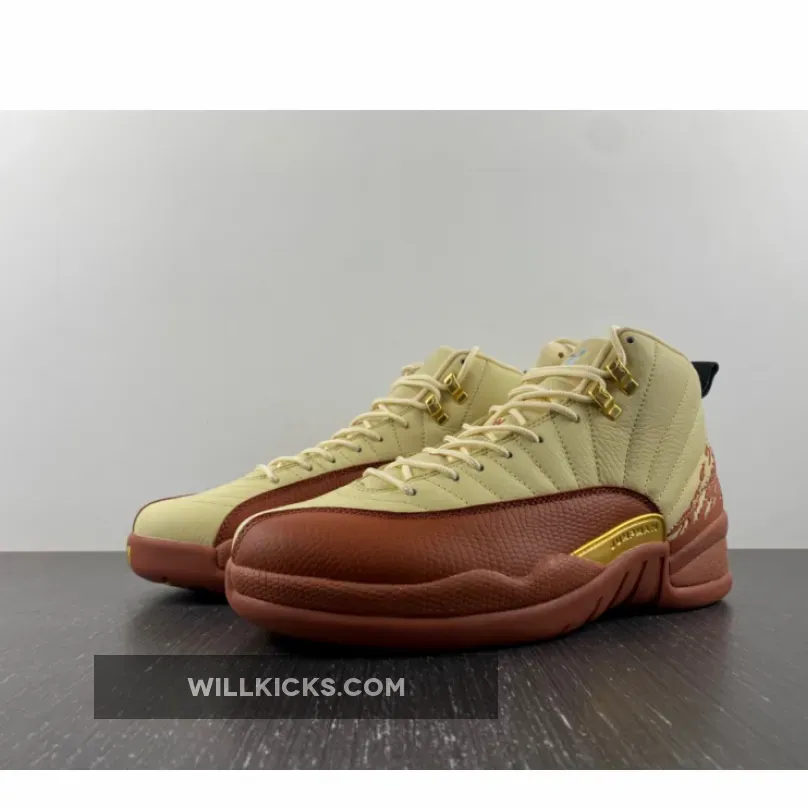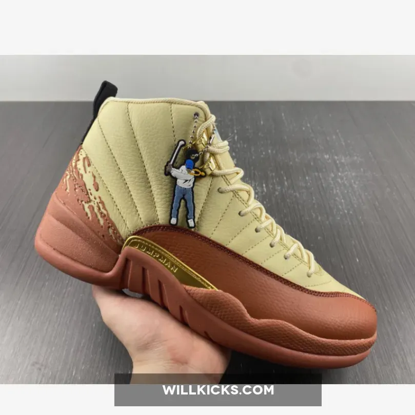 An undoubtedly opulent design, the luxurious-looking Eastside Golf x Air Jordan 12 Cream Brown features premium construction. It starts with a quilted tumbled leather cream upper which is complemented by beige tongue and laces as well as metallic gold details.A splash of terracotta red comes in via the splattered design at the backside and through the mudguard with a snakeskin-like pattern. Red and green insoles and a black pull tab finish off this collaborative Air Jordan 12.