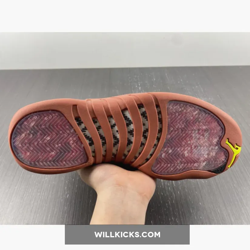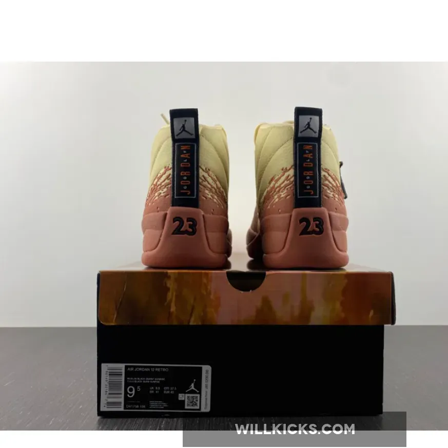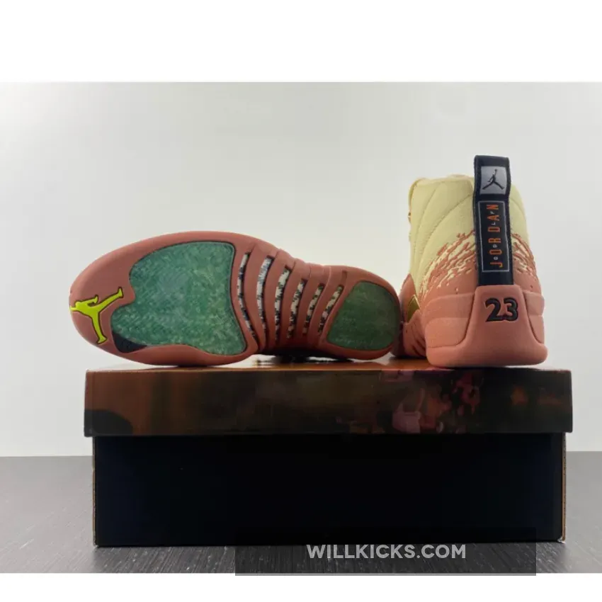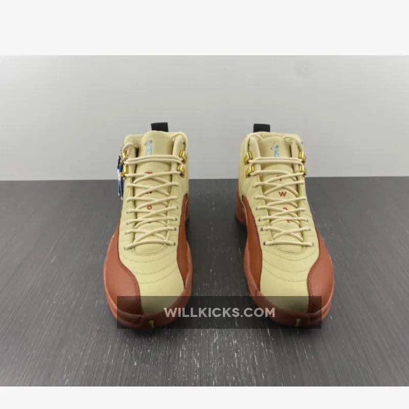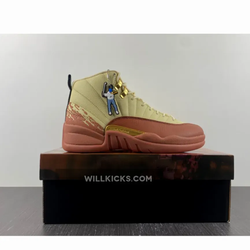 An undoubtedly opulent design, the luxurious-looking Eastside Golf x Air Jordan 12 Cream Brown features premium construction. It starts with a quilted tumbled leather cream upper which is complemented by beige tongue and laces as well as metallic gold details.A splash of terracotta red comes in via the splattered design at the backside and through the mudguard with a snakeskin-like pattern. Red and green insoles and a black pull tab finish off this collaborative Air Jordan 12.