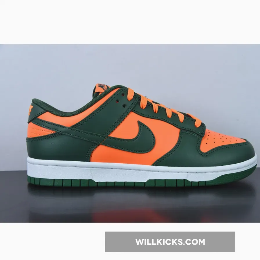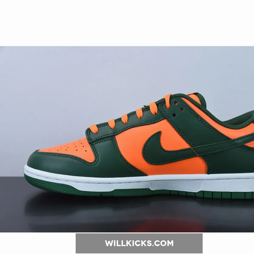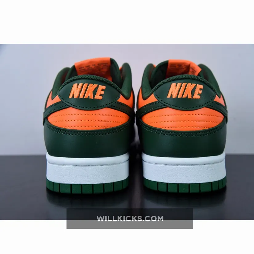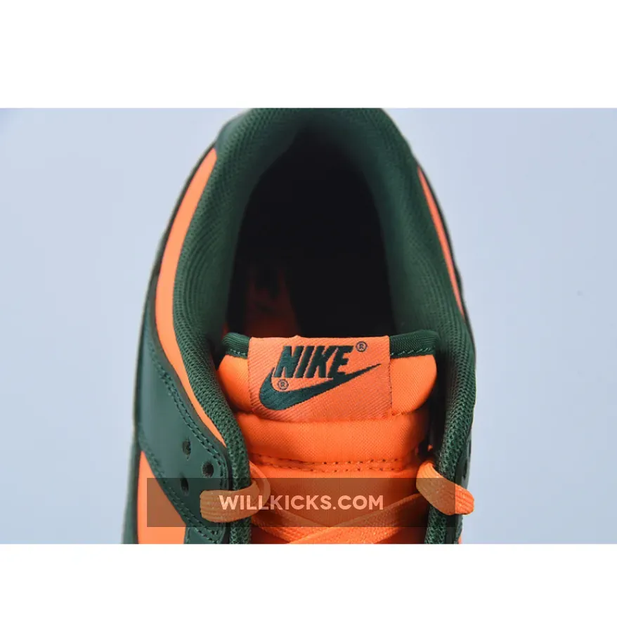 This Nike Dunk Low is draped in a two-tone palette that reflects the signature colors of the Miami Hurricanes. Equipped with a padded, low-cut collar, the leather upper features a Total Orange base with contrasting overlays in Gorge Green. The latter hue is repeated on the signature Swoosh, collar lining, and heel tab, marked with Nike branding in embroidered orange lettering. The low-top rests on a traditional cupsole, highlighted by white sidewalls, a cushioned foam wedge and a green rubber outsole.