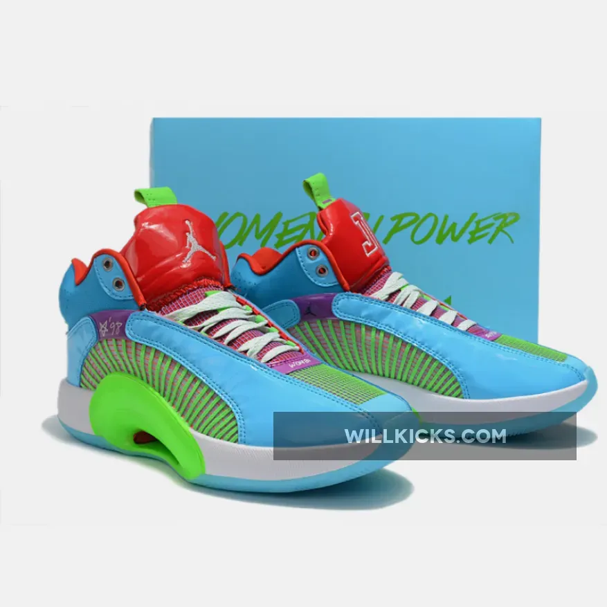 this Air Jordan 35 features Aqua Blue patent leather on the overlays while accents of Red, Purple, and Neon Green run throughout. Next, we have the number ’98’ on the side, the year he was born, and his PE logo on the tongue. We also have ‘Women in Power’ branding on the top of the tongue and ‘Fearless’ on the insoles. Also, each pair comes housed in a unique box.