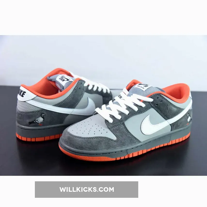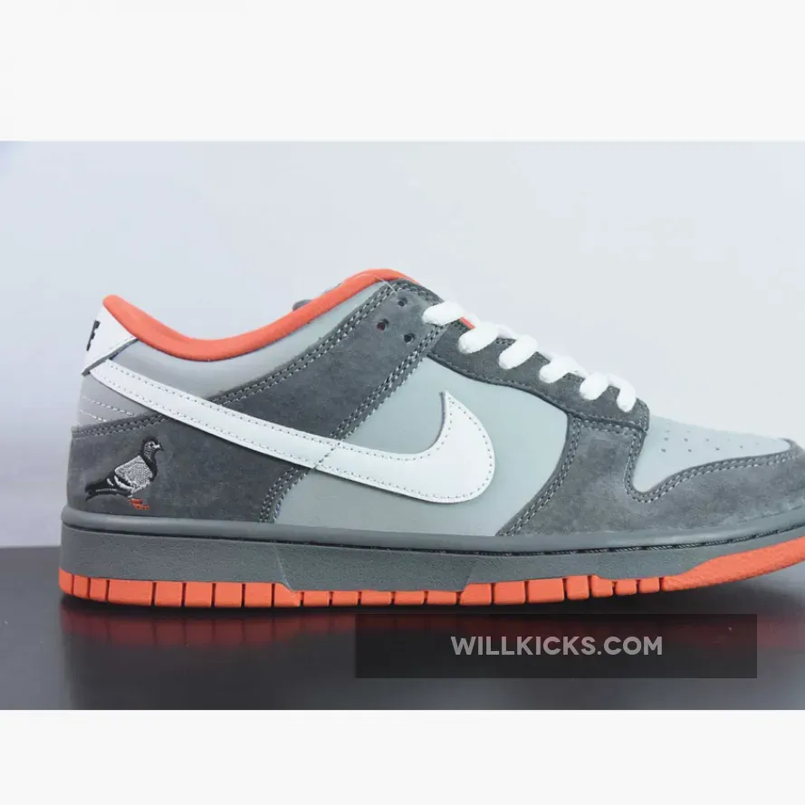 The shoe was made to closely resemble the angry bird and included a high-quality grey suede upper, orange outsole, and an iconic embroidered pigeon logo along the lateral aspect.