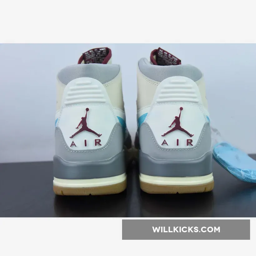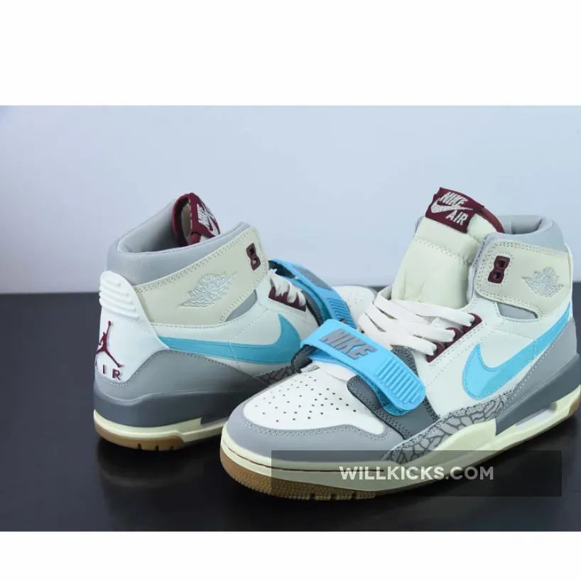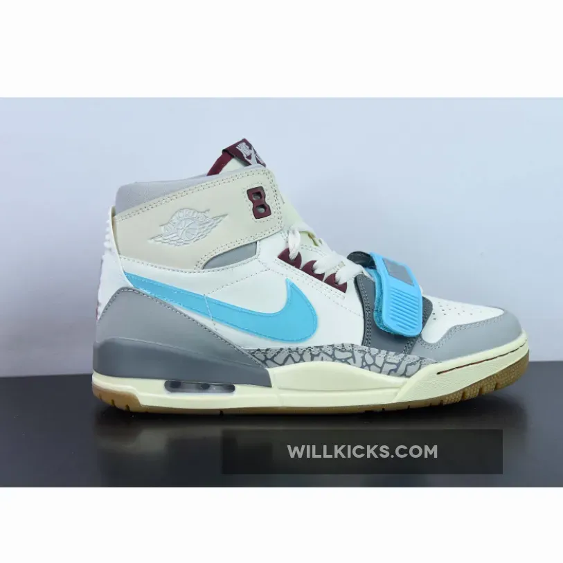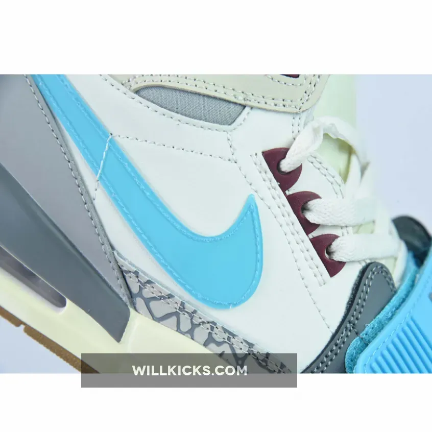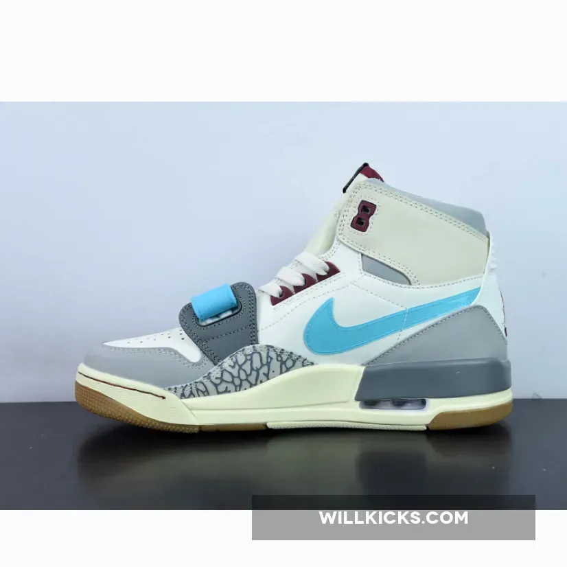 Keep your style cool and fresh with the Jordan Legacy 312 Blue Grey White. A splash of bright colour is added through the cyan-hued forefoot strap and Nike Swoosh. Meanwhile, the plush collar is supported by a neutral Air Jordan-branded grey overlay.