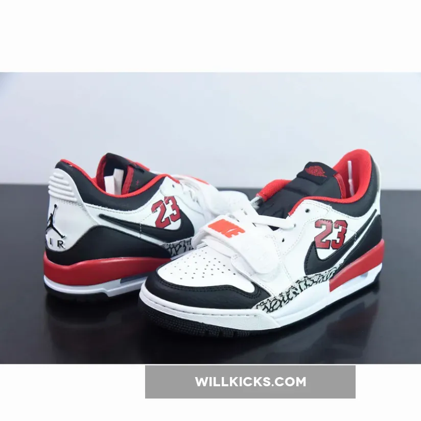 Nike’s Jordan Legacy 312 Low 23 White Black Red sneakers live up to their titular mission as legacy kicks. This pair is updated in Chicago Bulls colours, with white serving as the base for the leather upper. Contrasting accents come in via the black mudguard, Swoosh, collar and lateral overlay, as well as the red tongue trim, lining and lateral midsole. The style’s numericals hit just above the Swoosh, while an elephant-printed insert lands underneath it. On the comfort front, you get generously a padded collar as well as supreme cushioning via the exposed Air unit.