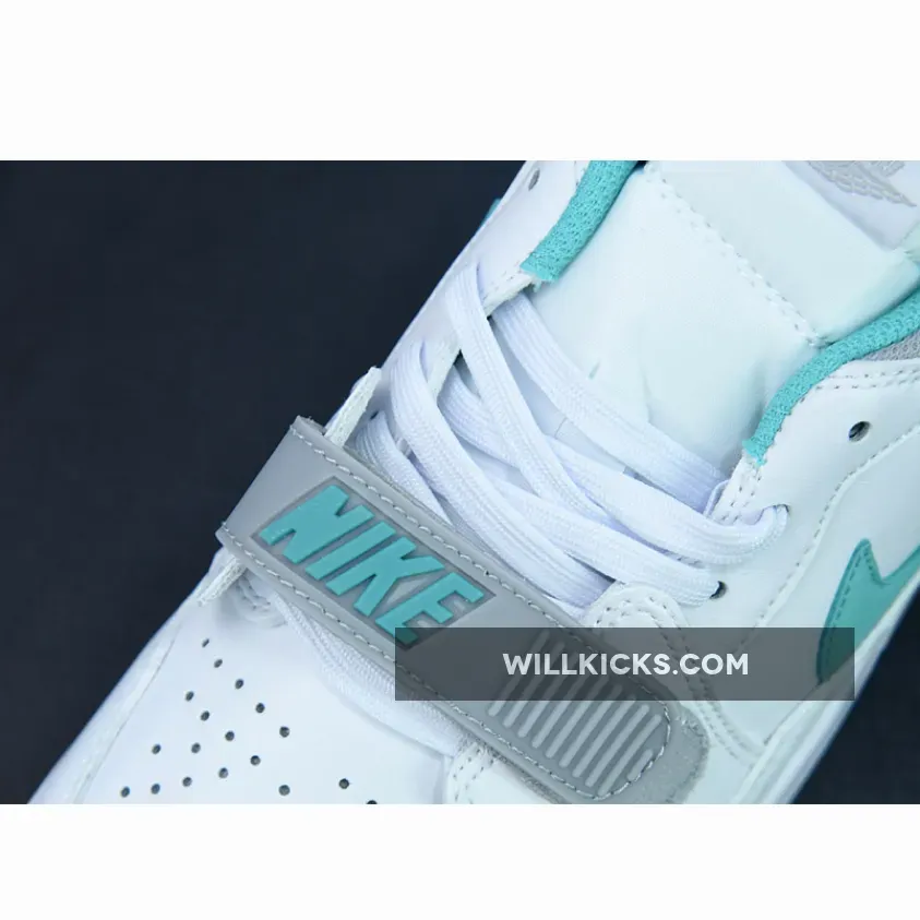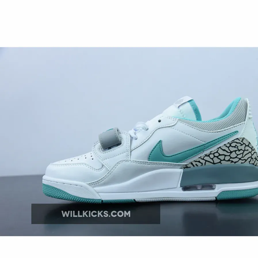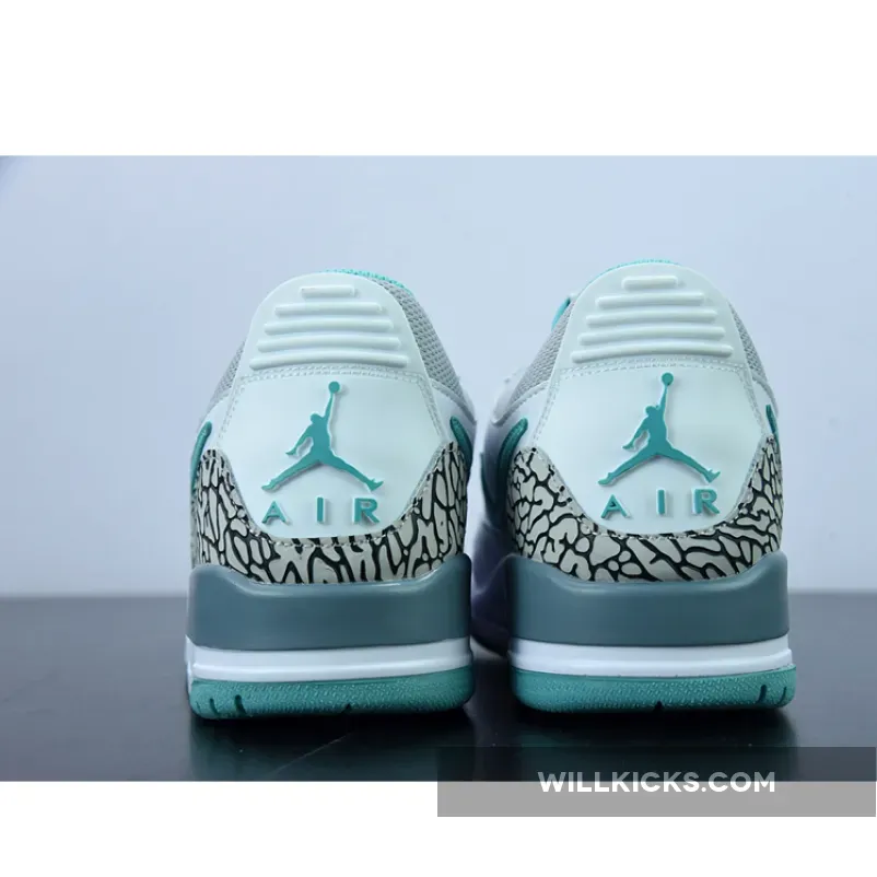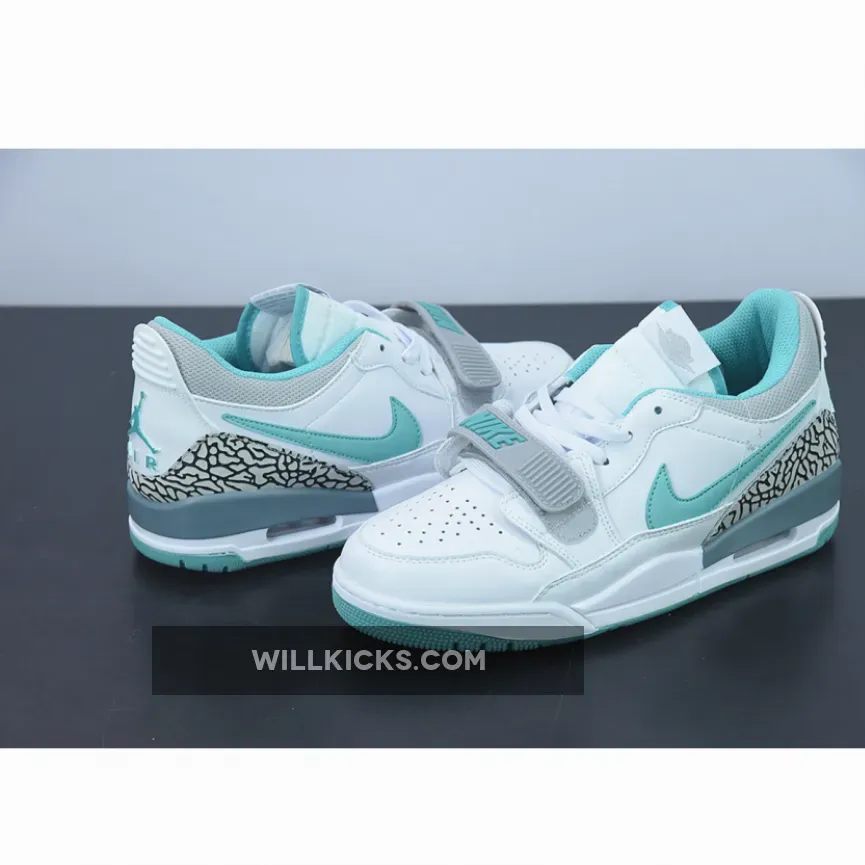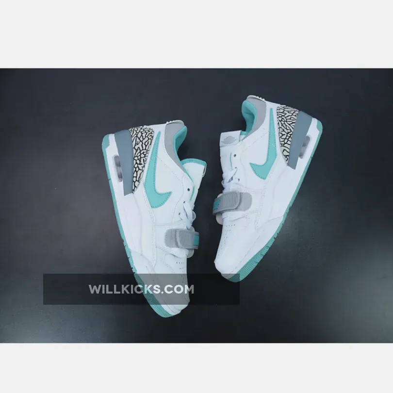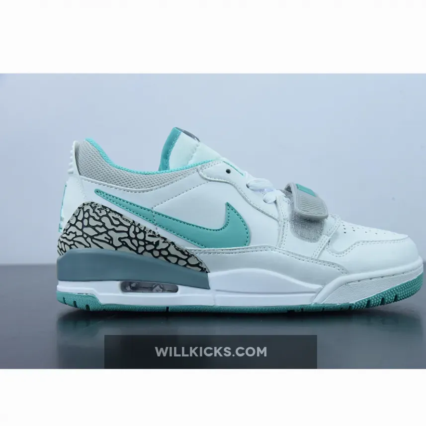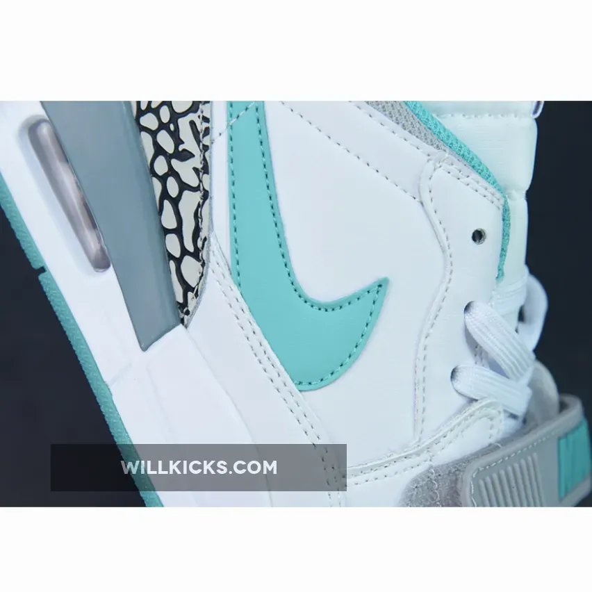 Clean & classic! Excellent blend of leather & mesh. Love the pop of turquoise & classic elephant print. Quality feels solid – definitely recommend! #Legacy312 #WhiteTurquoise #JordanSneakers