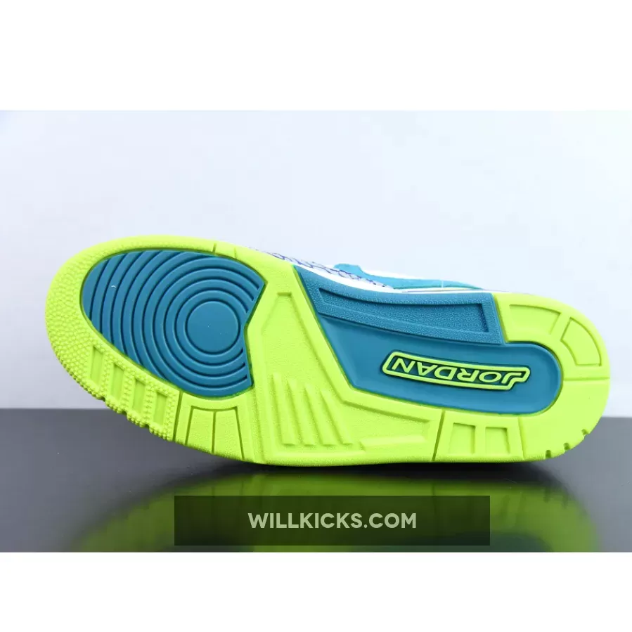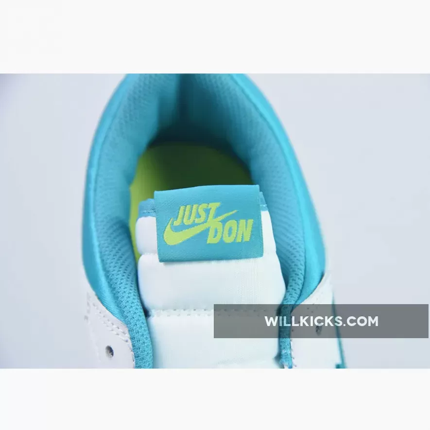 This release features Summer vibes by utilizing bright shades throughout. Blindingly bright aqua tones find place across the lining, tongue tab, as well as the textural suede swoosh while volt green ornaments the heel wrap and outsoles entirely. Branding notes are true to form, with “Just Don” standing next to boldfaced font hits and the iconic Jumpman, though the insoles feature a small circular patch akin to vintage bottle caps or possibly sportswear-centric iconography.