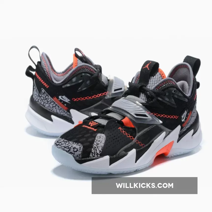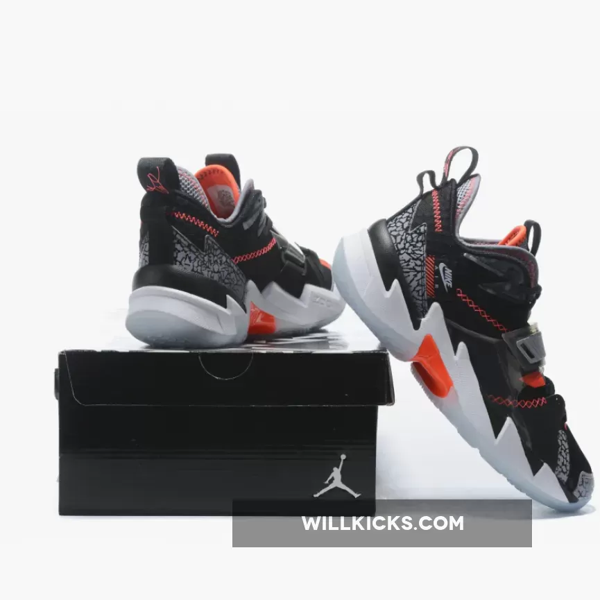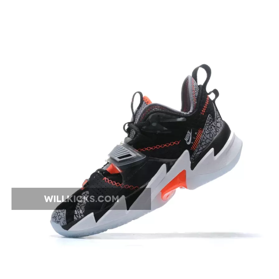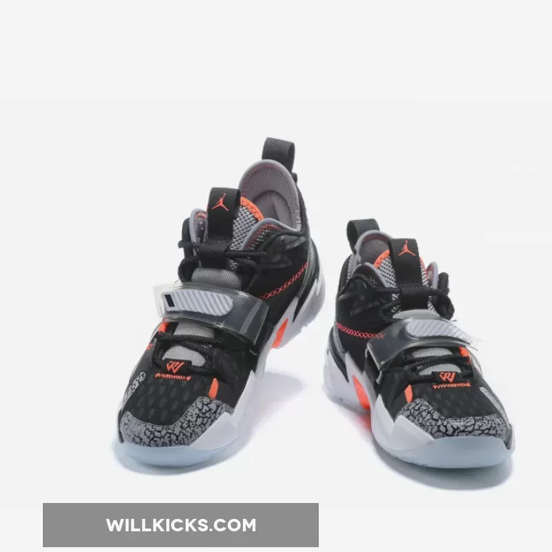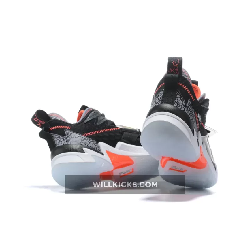 Dressed in a Black, Bright Crimson, Cement Grey, and White color scheme. This Jordan Why Not Zer0.3 features a Black base with elephant print overlays Crimson accents atop a White midsole. “Nike Air” tags on the lateral and a clear midfoot strap completes the design.