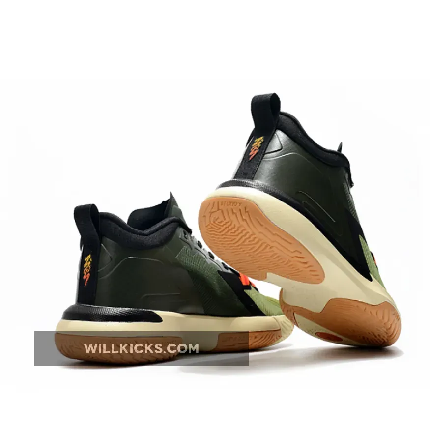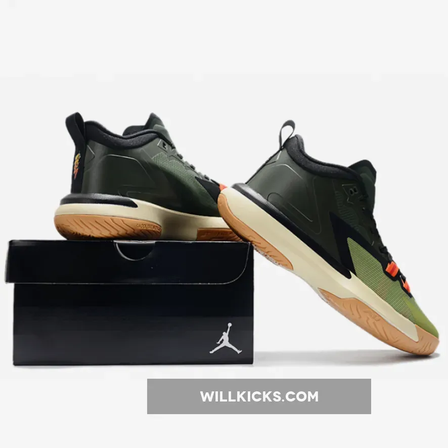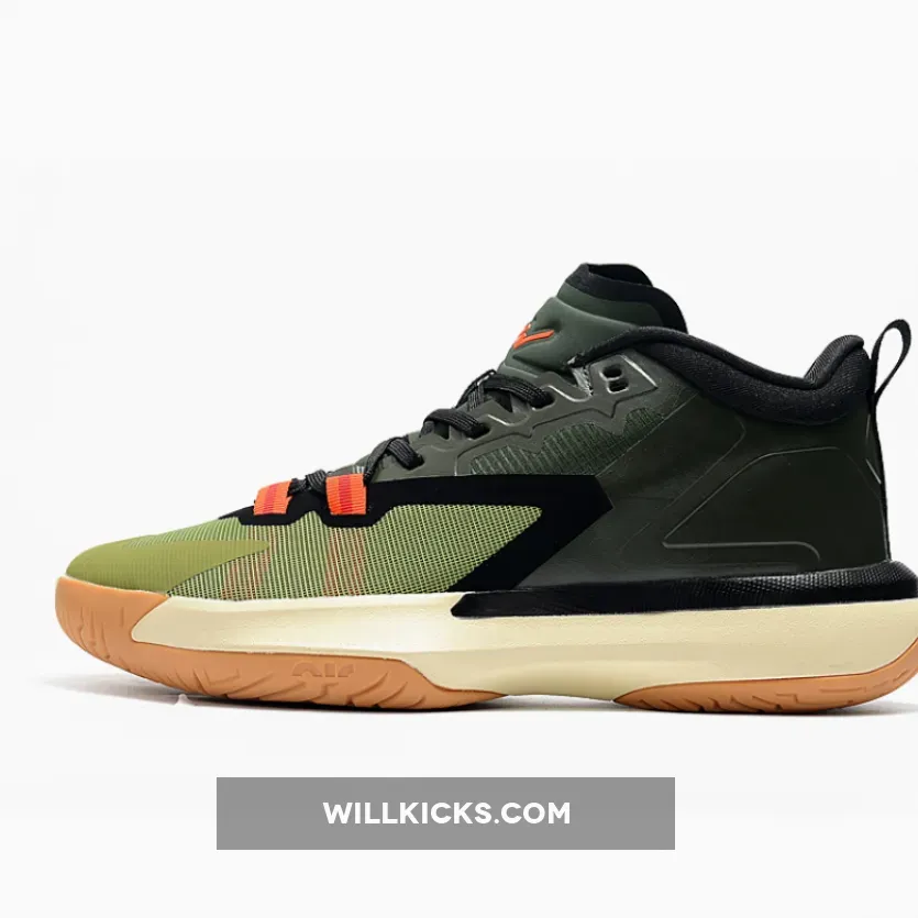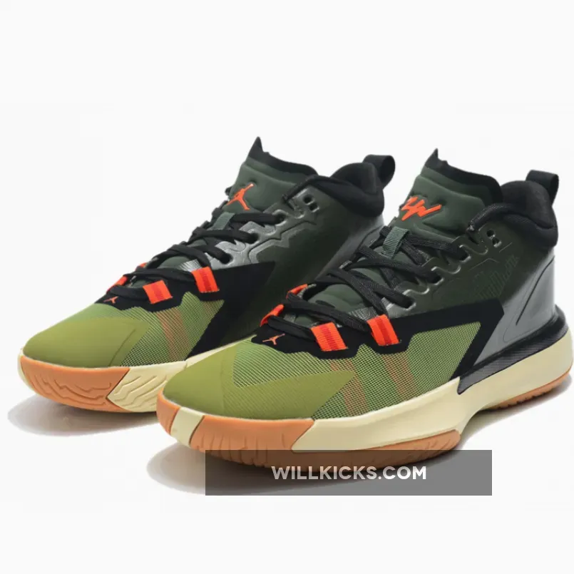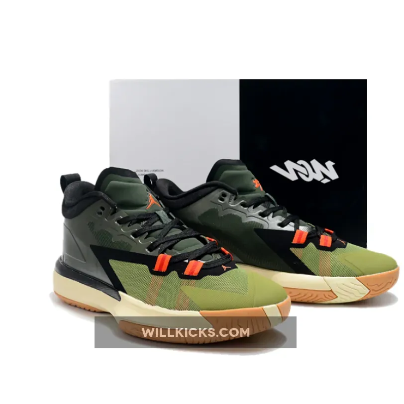 This Jordan Zion 1 features a Carbon Green, Asparagus, Beach, and Black color combination. Highlighted with a croc-like texture across the heel that also runs down the end eyestay. Sticking out, we have camouflage on the insoles that reads ‘Let’s Dance,’ which pays tribute to his draft night phrase. Other highlights include Orange accents, a Sail midsole, and a Gum rubber outsole.