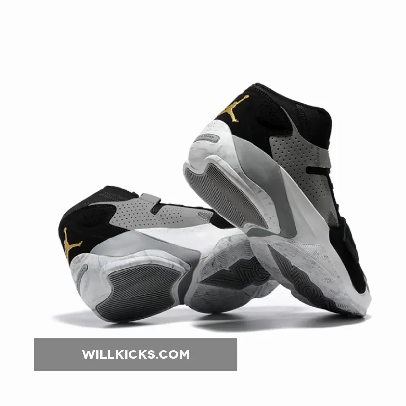 Here, uppers of mesh, nylon, and perforated leather and suede arrive in shades of cool grey and off-noir, with little deviation between. Monochrome colors return to the sile unit underfoot, with bright white midsoles hosting grey heel paint and marbelized outsoles to complete the design.