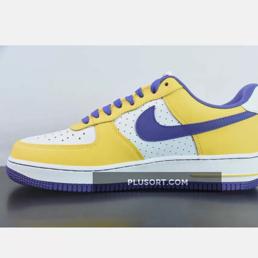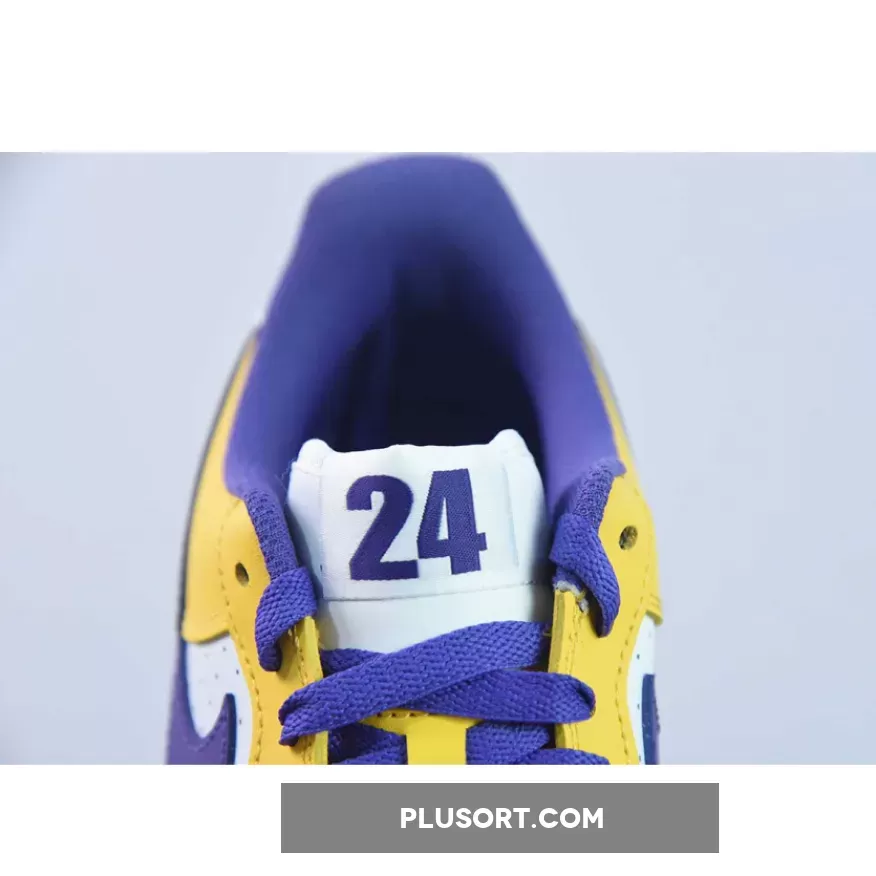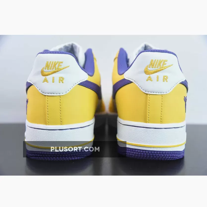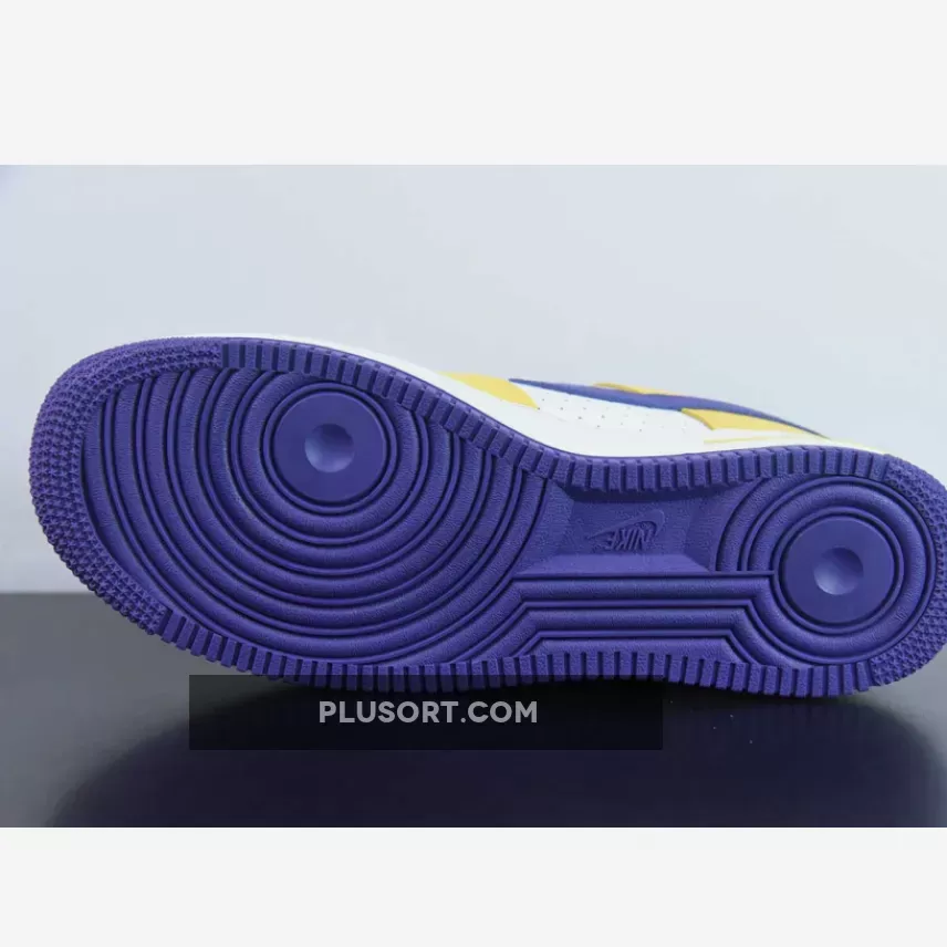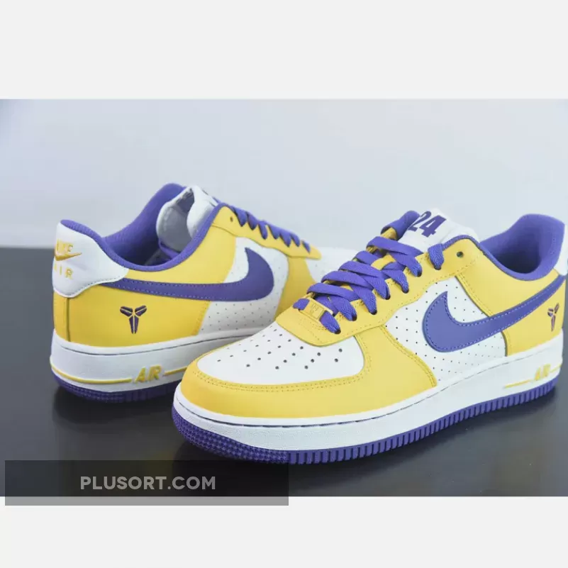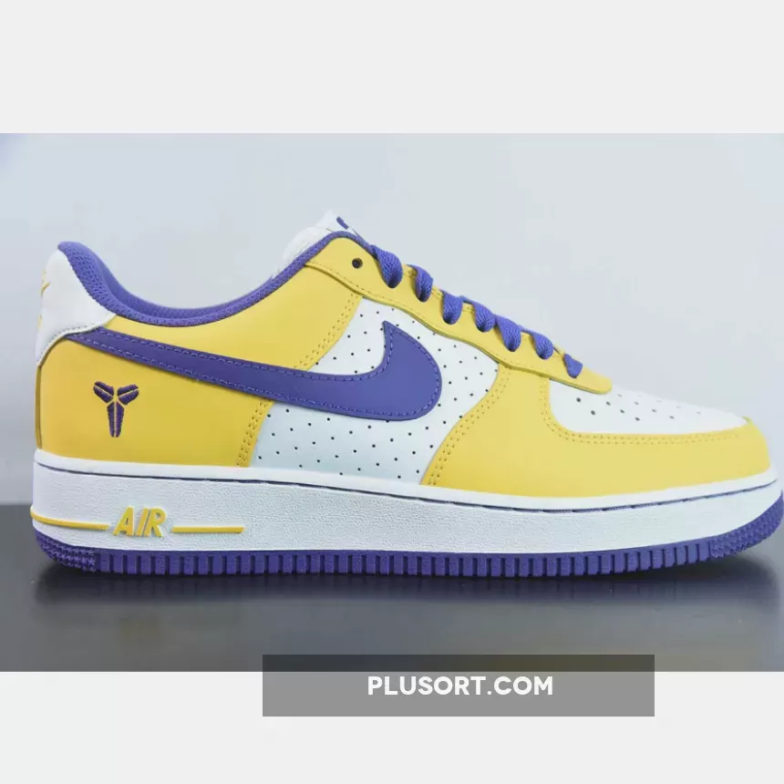 The Kobe Bryant x Nike Air Force 1 Low comes dressed in a White, Varsity Maize, and Varsity Purple color scheme.