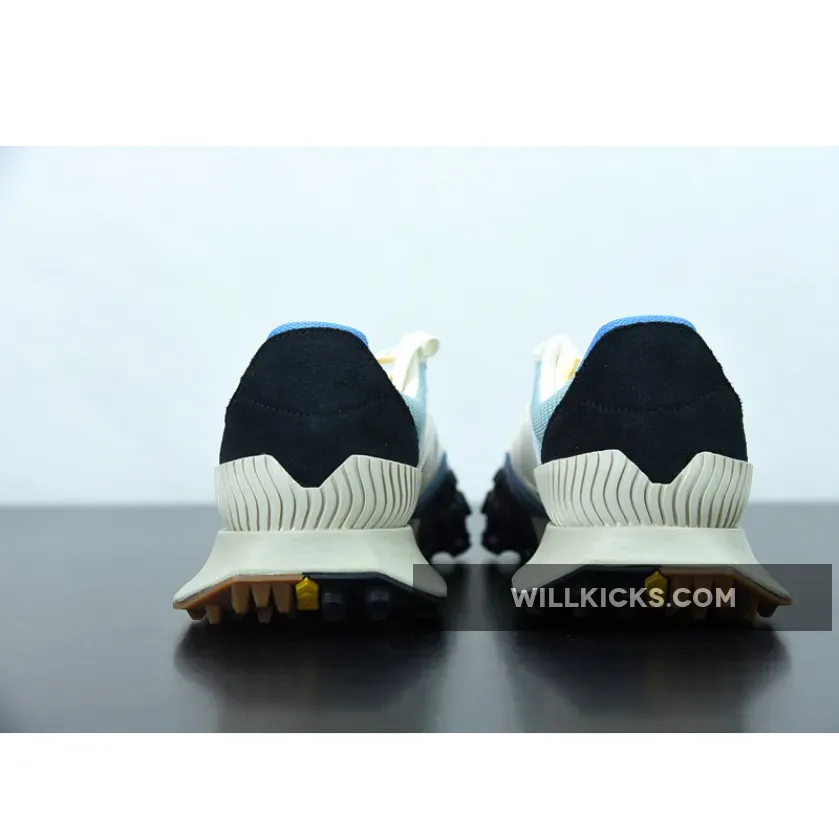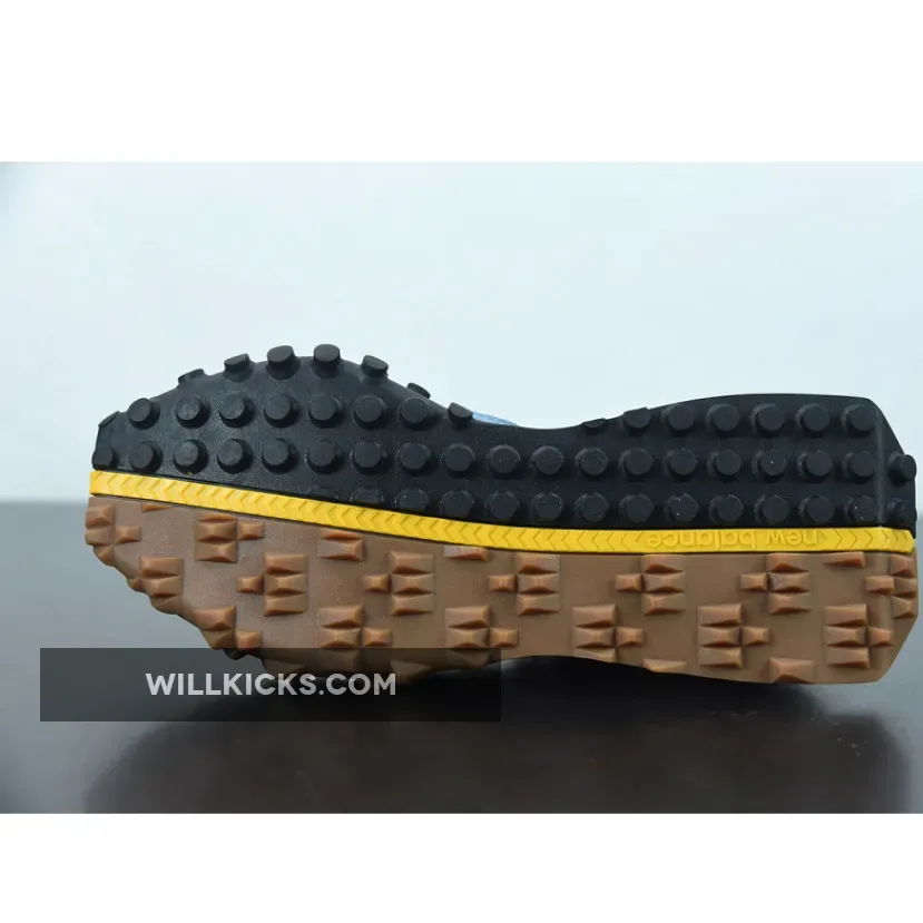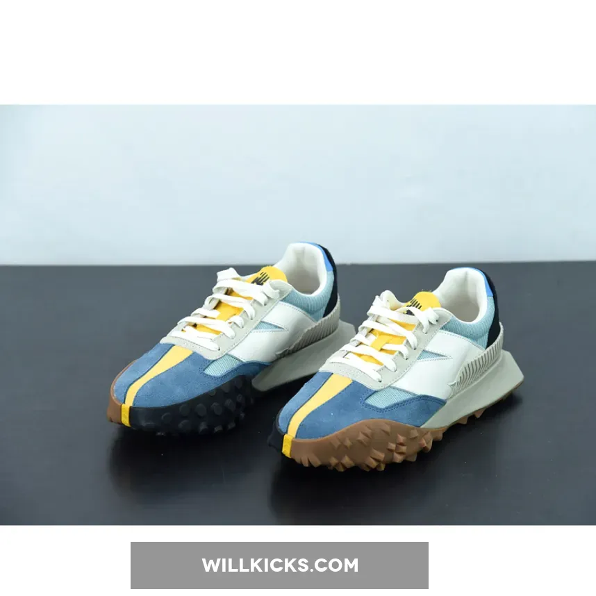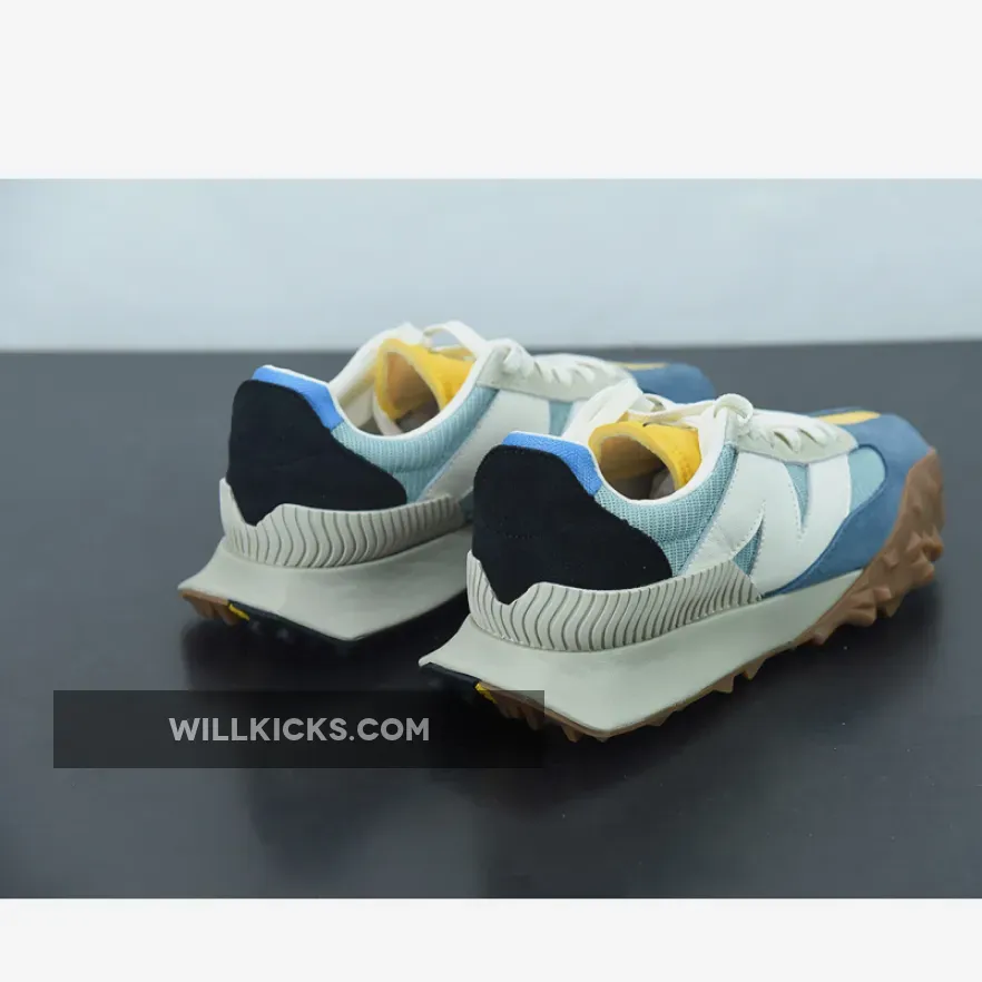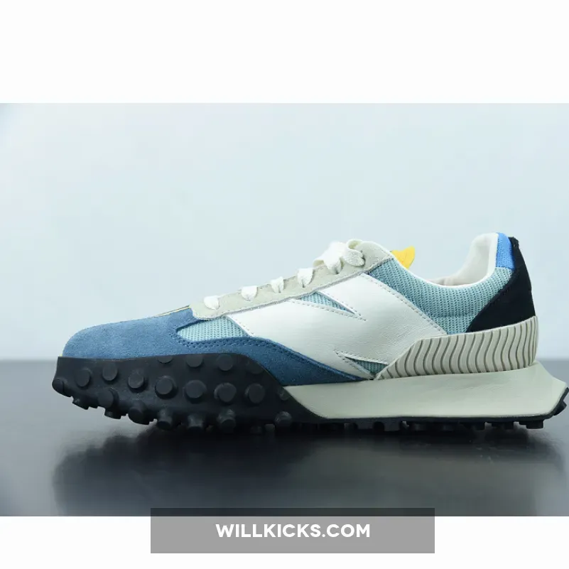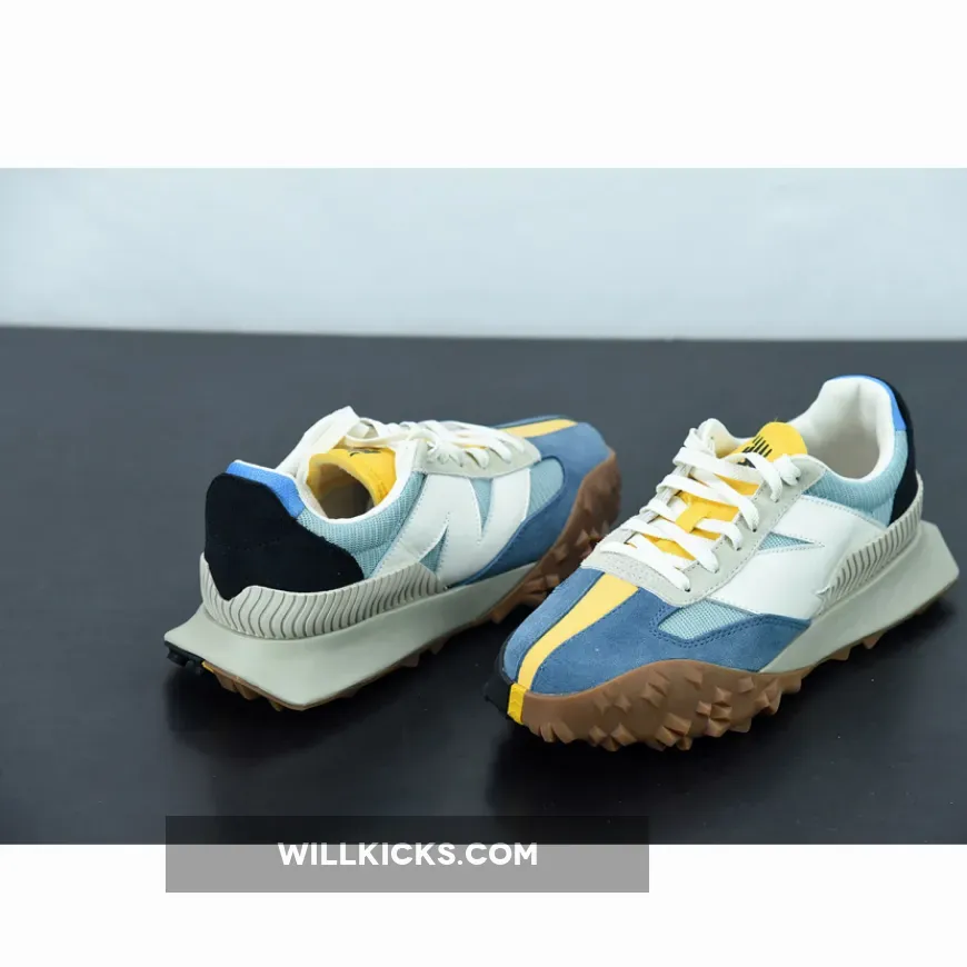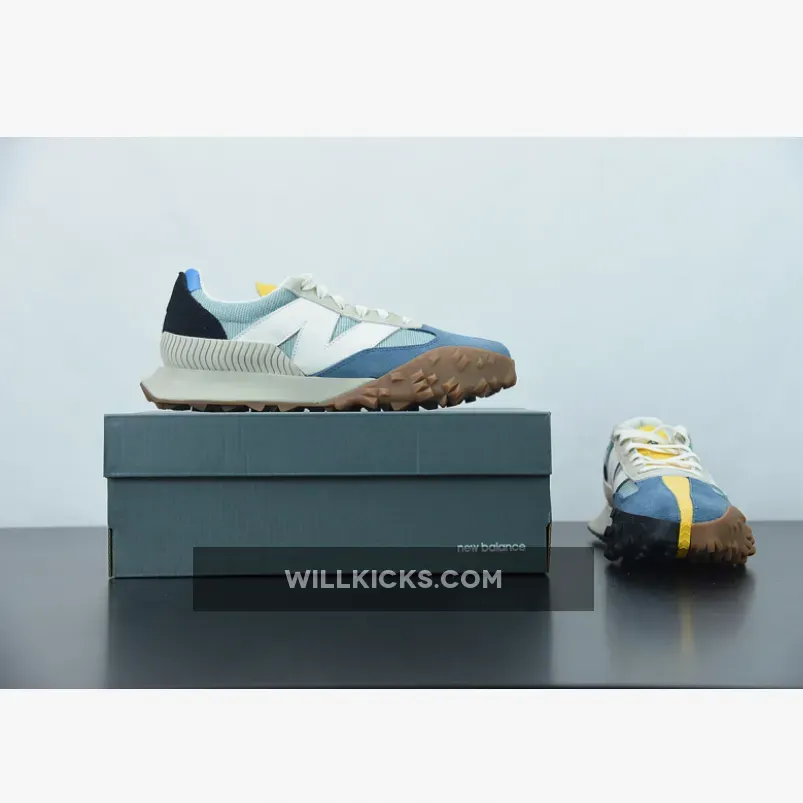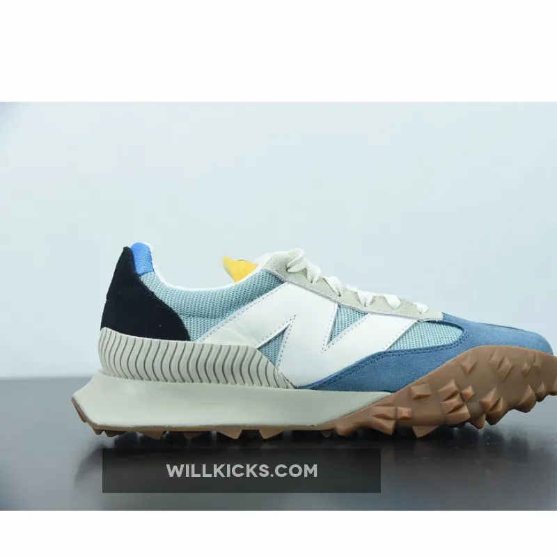 The pair flaunts light blue crinkled nylon uppers that are complemented by suede overlays on the toe in a similar shade. Off-white tones applied to the oversized “N” logos, heel piece, and the foam midsole create an aged look that evokes a retro aesthetic. Unexpectedly, the tongue indulges in a bright yellow coloring that extends onto the toe as a vertical suede strip. Beyond the toe, a yellow stripe splits the outsole between two different traction patterns and colors to round out this contemporary twist on an old-school style.