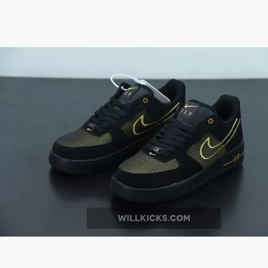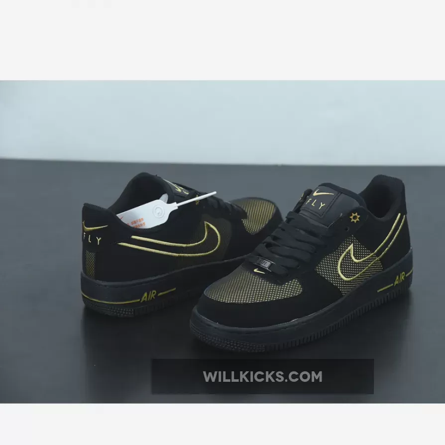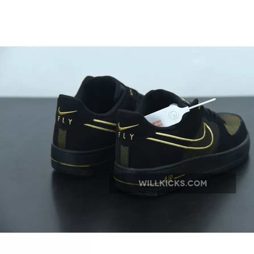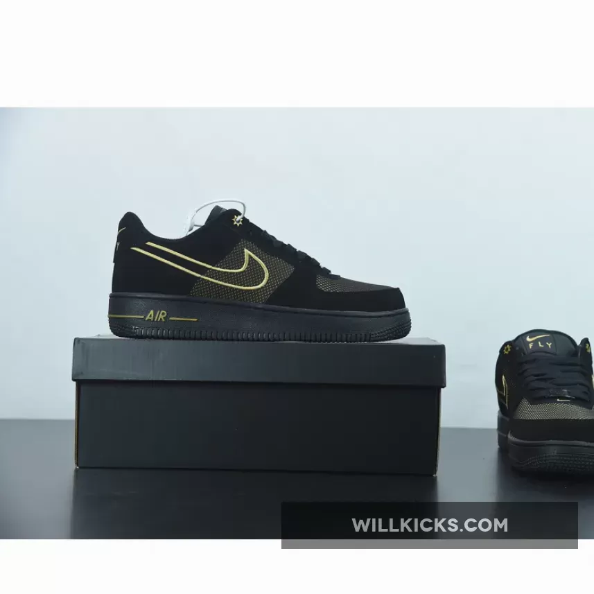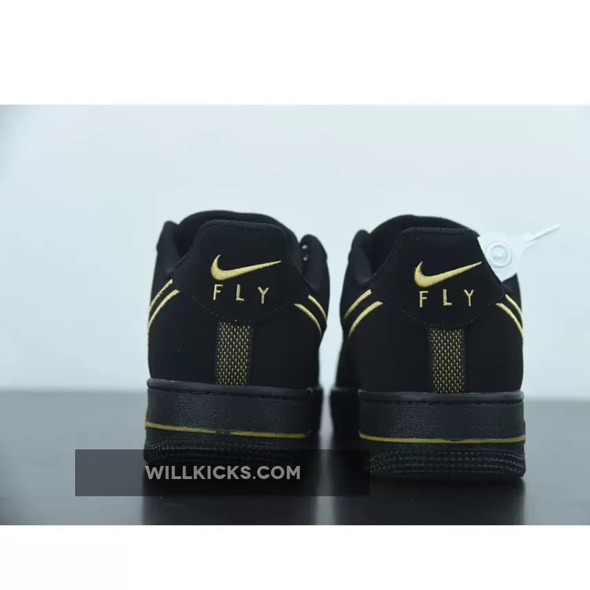 The various materials and added embellishments of this impending variation are the highlights of the shoe. As opposed to making use of the usual leather uppers, the Nike Sportswear team instead manufactures the rear side panels and forefoot overlays with a smooth nubuck, both of which arrive with black finishes. The toe boxes and quarter sections each feature golden backdrops but are fenced in with a layer of black mesh on top. Only the outline of the Swoosh is present on the lateral and medial sides, both being embroidered in with a golden hue. Steering away from the traditional Nike Air branding on the tongues and heels, these go with a Swoosh logo and a “FLY” text spell outs that rest underneath. Additionally, the eyelets have been modified with star shapes and provide another element of pop as they are flooded in yellow. Save for the golden Air hits on the midsoles, the rest of the bottom unit is engulfed in all-black.