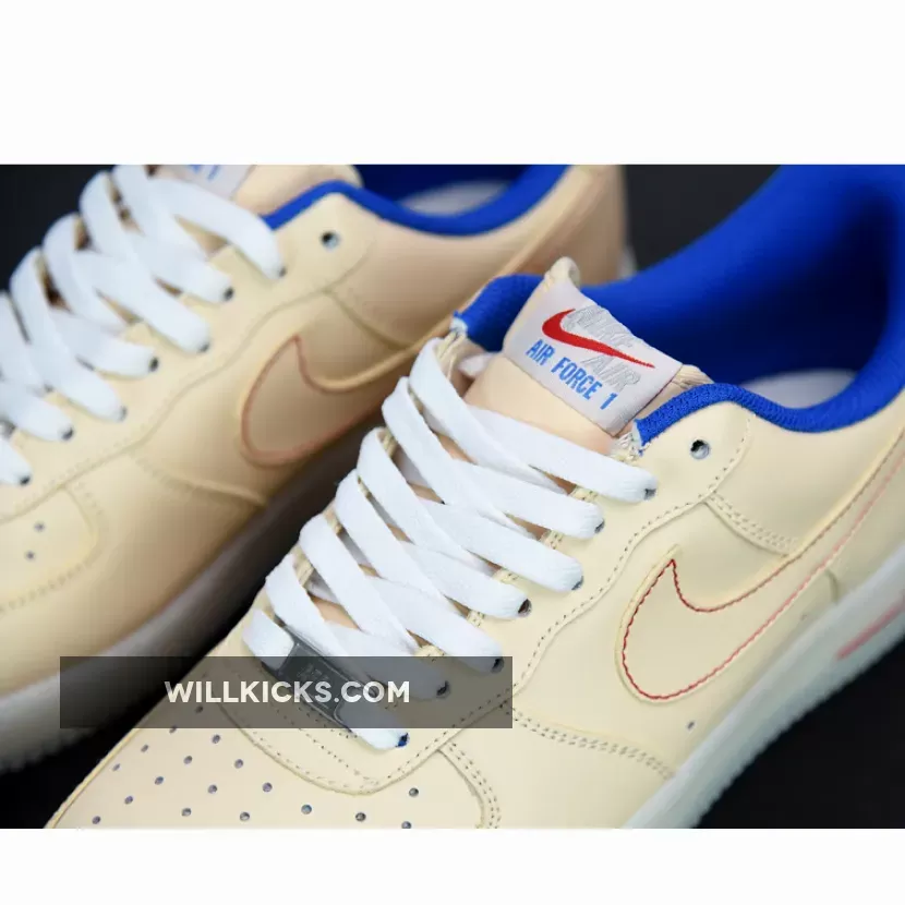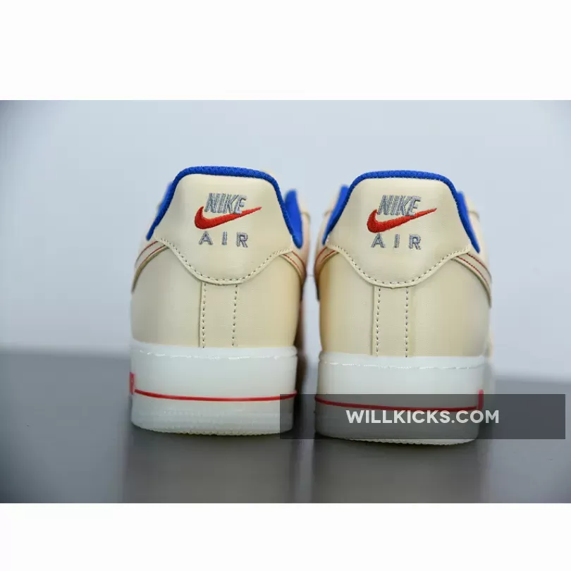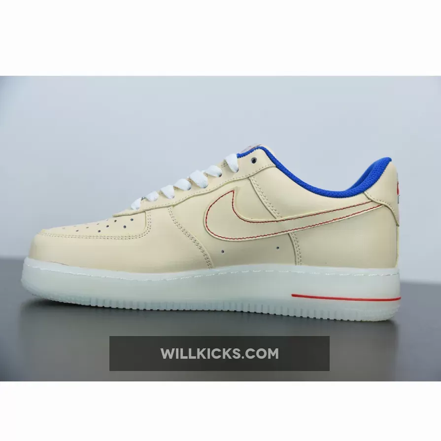 the pair quickly sets itself apart with a number of contrast threads. The swoosh, though cut from the same natural cream as the rest of the smooth leather construction, accents its edge with a bright red, a tone that also dresses the various branding seen at the barely see-through tooling below, the embroidery of the heel tab behind, and the tongue tab spaces above. Elsewhere, dark blues complement atop the lining while the lace and dubrae stick borrow from existing parts with white and silver metallic, respectively.