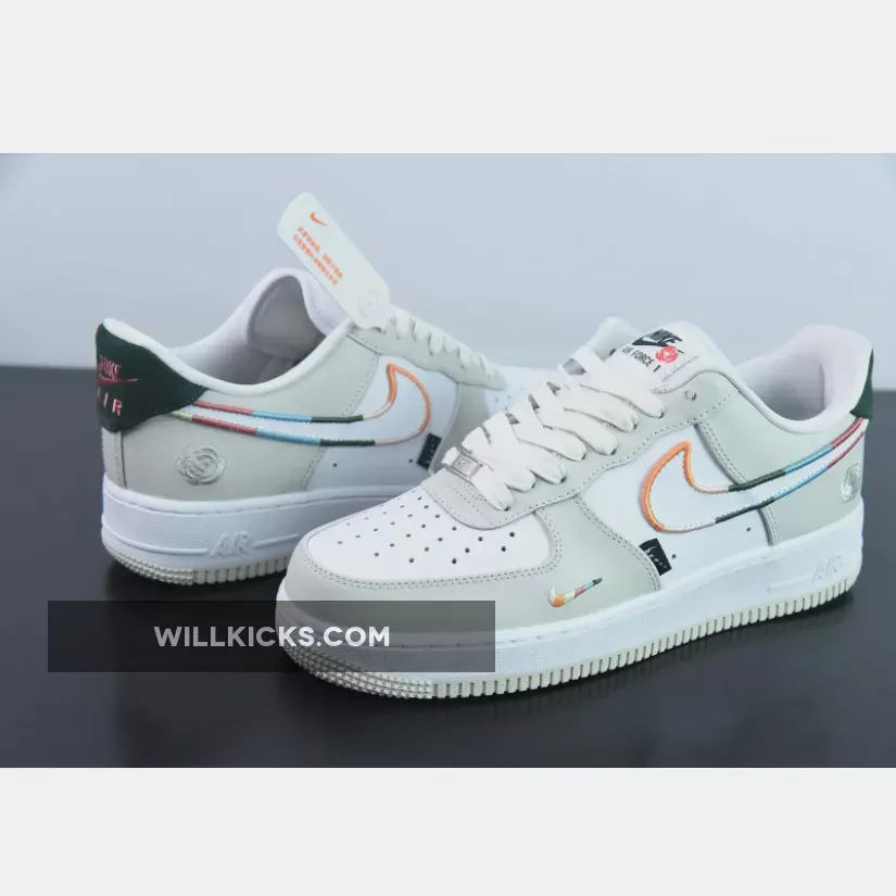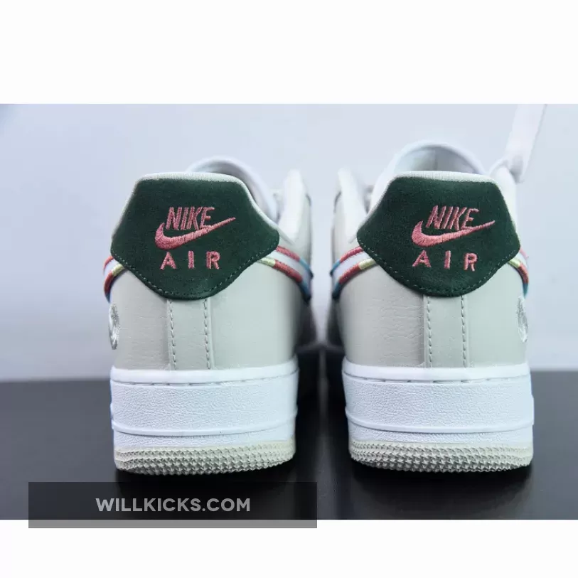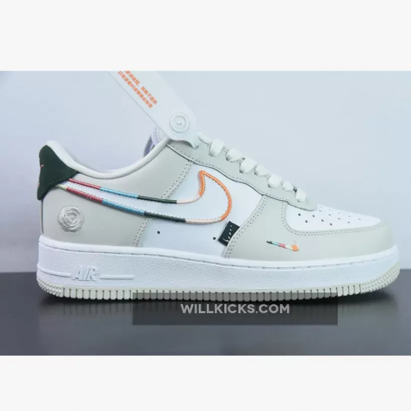 this Nike Air Force 1 Low comes constructed with leather throughout and mesh tongues. White runs across the base with Light Bone on the overlays. Highlighting the shoes, we have a mini 3D embroidered Swoosh on the sides that feature multiple colors, while the same treatment outlines the larger Swoosh on the panels. Next, a tonal embroidered flower adorns the lateral ankle, and a small rose lands on the tongues. Green suede covers the overlay, lateral labels, and ‘All Petals United’ on the insoles. Finishing the look is a two-tone rubber sole.