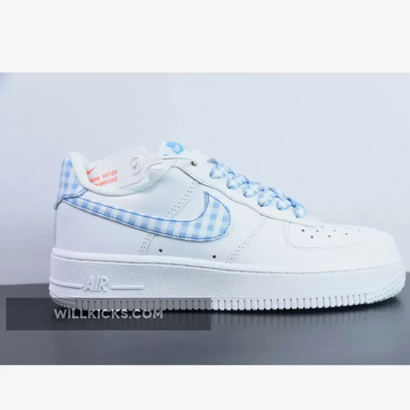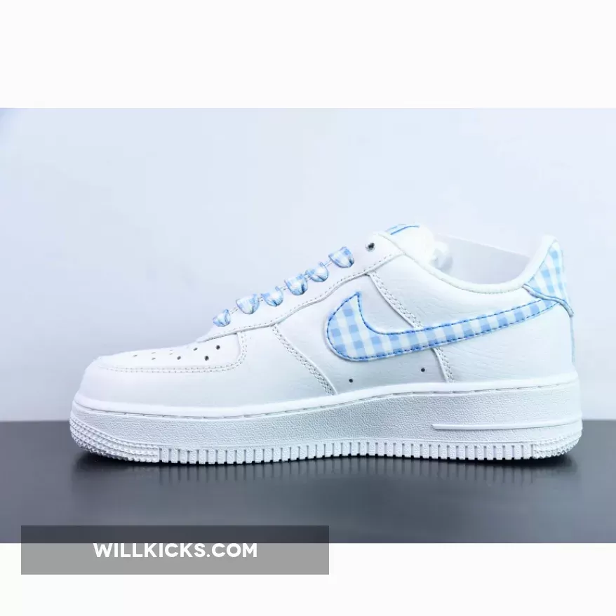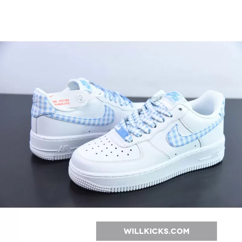 Dressed in a White and University Blue color scheme. This offering of the Nike Air Force 1 Low features a traditional all-White upper constructed with a leather base, mesh tongue and lining. Highlighting the shoe is the gingham print used on the Swooshes and heel overlays.