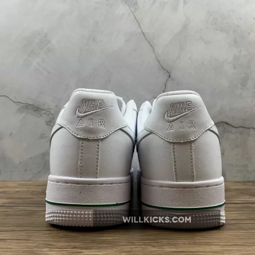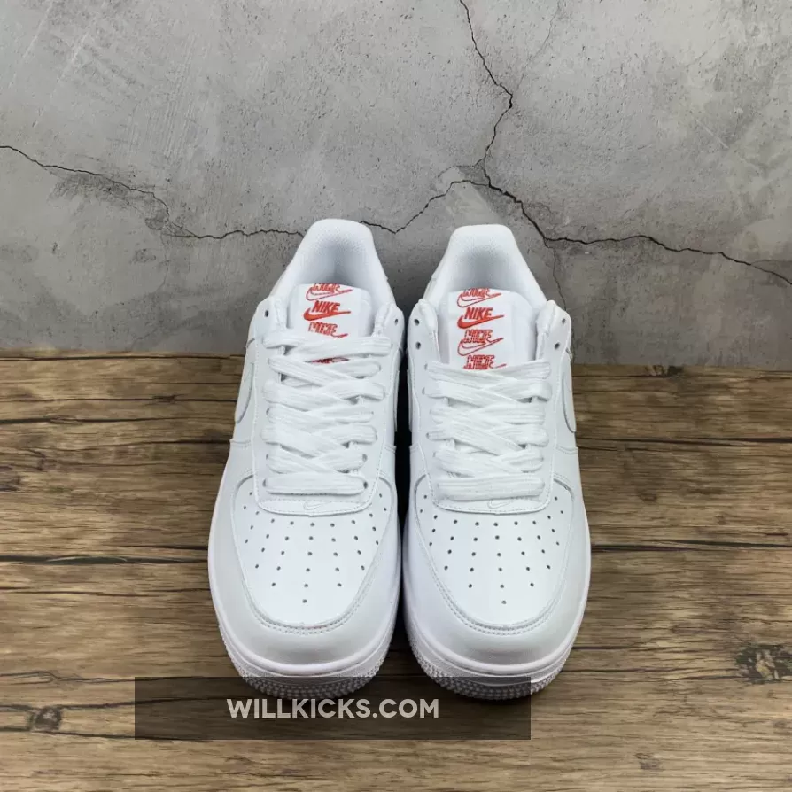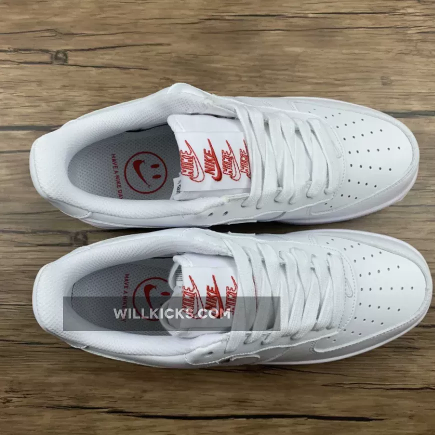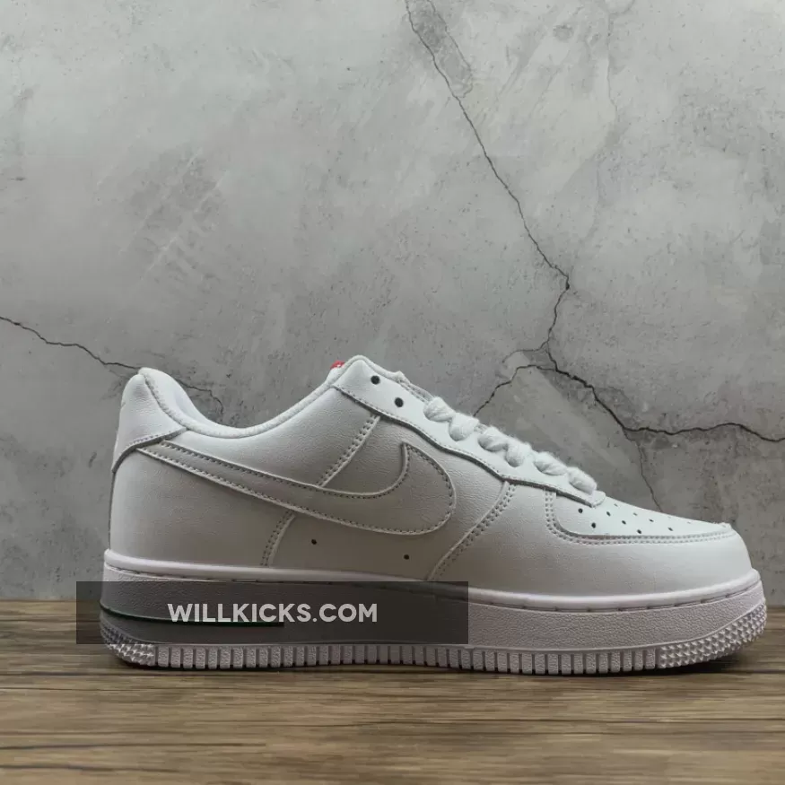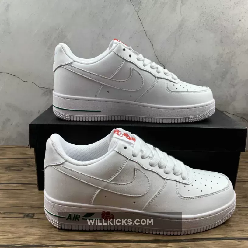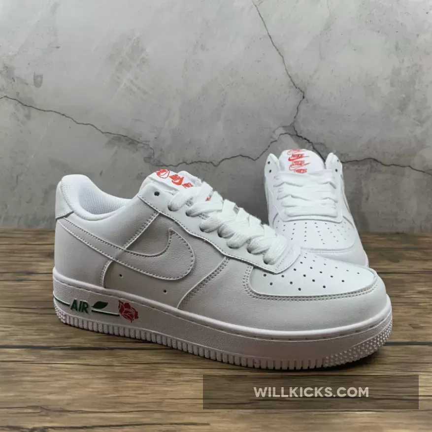 Dressed in a White, University Red, and Pine Green color scheme. This Nike Air Force 1 features a White smooth leather upper with matching Swoosh and heel branding along with its signature perforated toe box. Green in the form of a stem with “AIR” lettering and a Red rose motif on the lateral midsole highlights the shoe. Red branded tongue labels atop a solid White rubber sole completes the design.