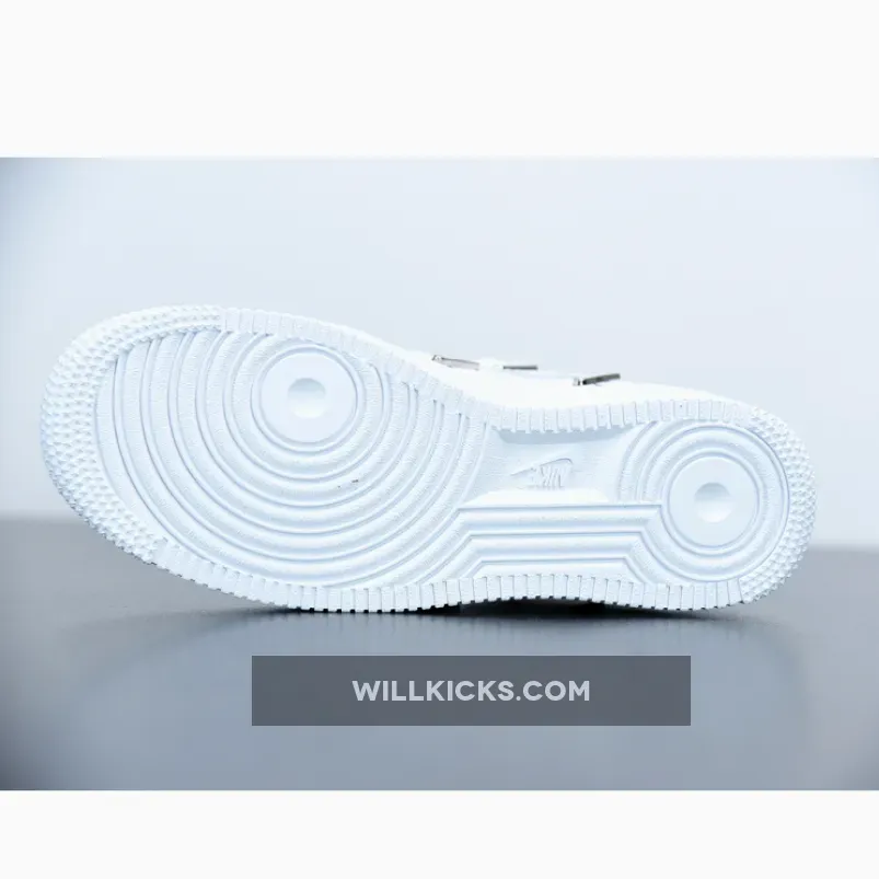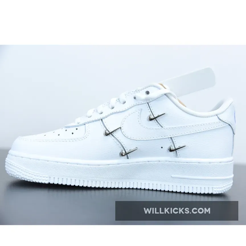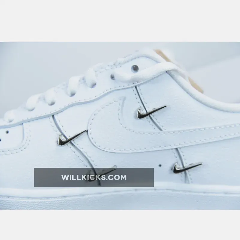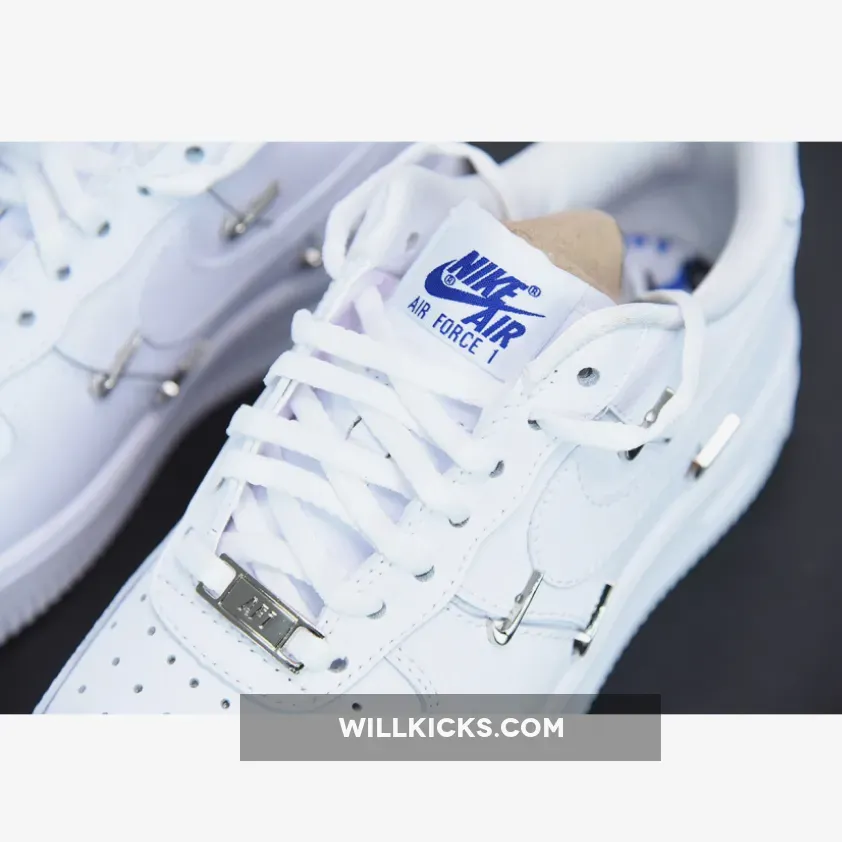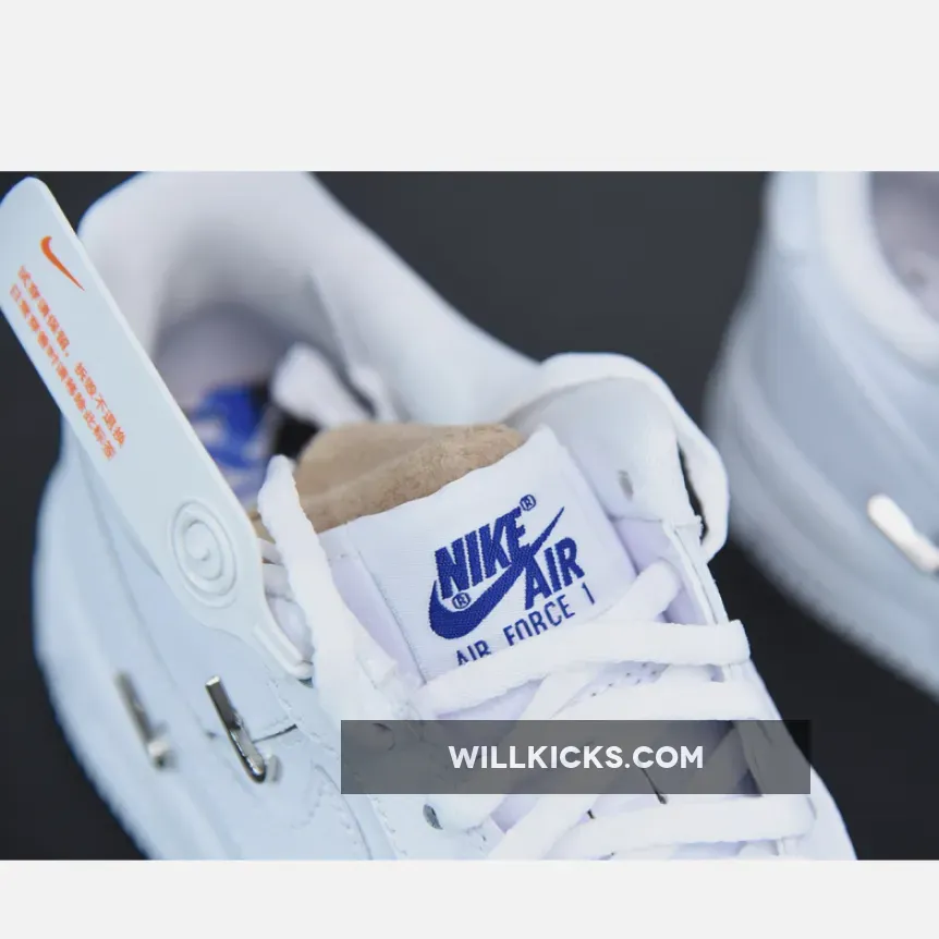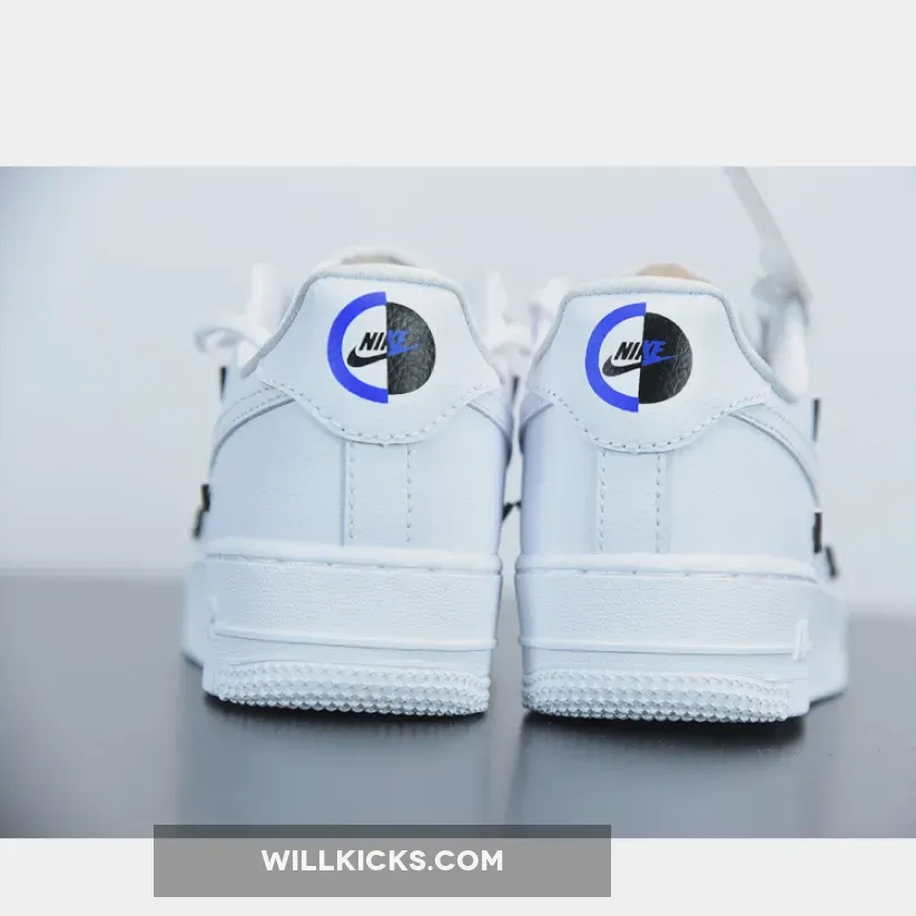Dressed in a White, Hyper Royal, and Black color scheme. This offering of the Nike Air Force 1 Low features a clean traditional White tumbled leather upper detailed with a total of eight Chrome Swooshes, four on each side panel. Blue branding on the tongue and heels with a graphic insole completes the design.