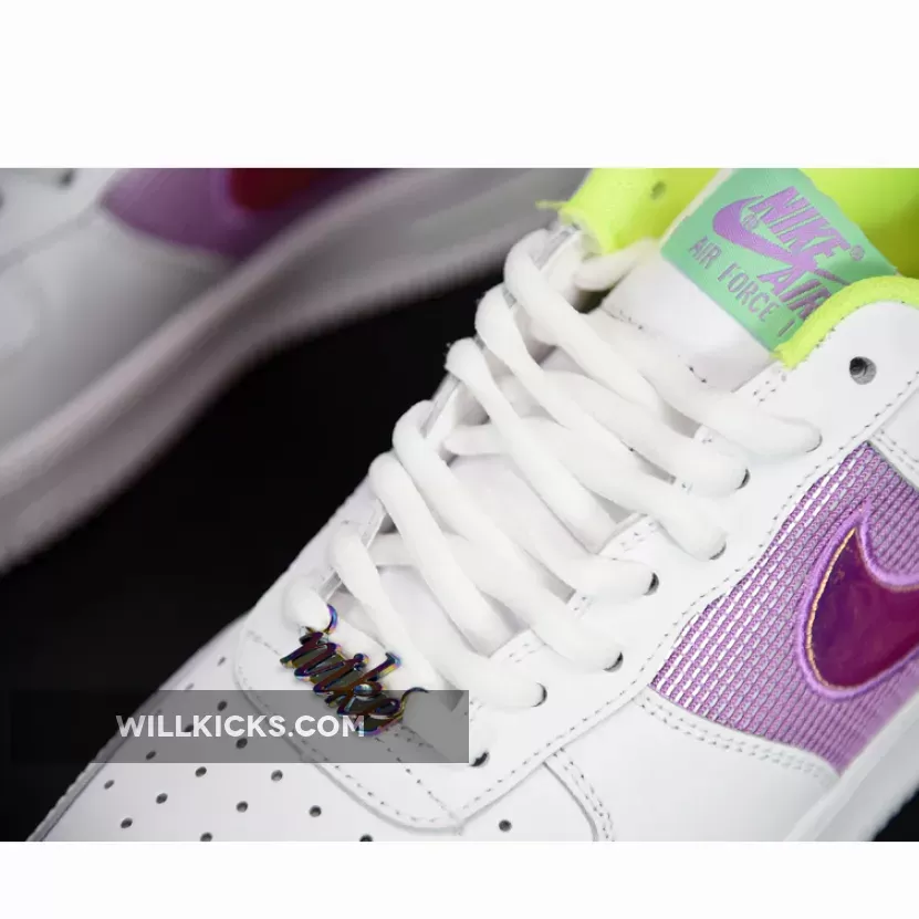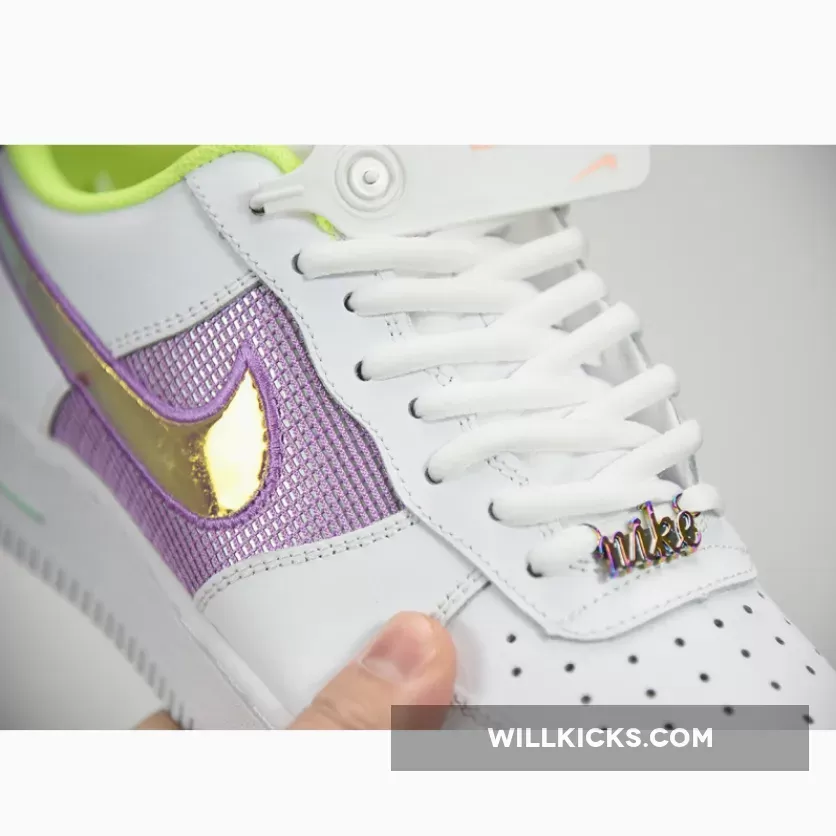 Like the official Air Force 1 Easter 2020, “White” sets the stage for multicolored accents. Smooth leather covers much of the upper, but it’s interrupted by Jordan 4-like windows at the midfoot. Profile Swooshes are trimmed by these panels’ purple hue, but they make a bolder statement via their copper finish. Heel tabs follow suit, though their “NIKE AIR” branding introduces a rich green into the mix that becomes lighter across the tongue, collar and midsole. While free of any cracked egg-graphics, tongue labels deliver an April 12th-appropriate color scheme, similar to a previous “Oracle Aqua/Barely Volt” Air VaporMax Plus. Vintage-style “nike” lace dubraes, which have also surfaced on the Air Max 97, add more metallic flair to the ’82 design.