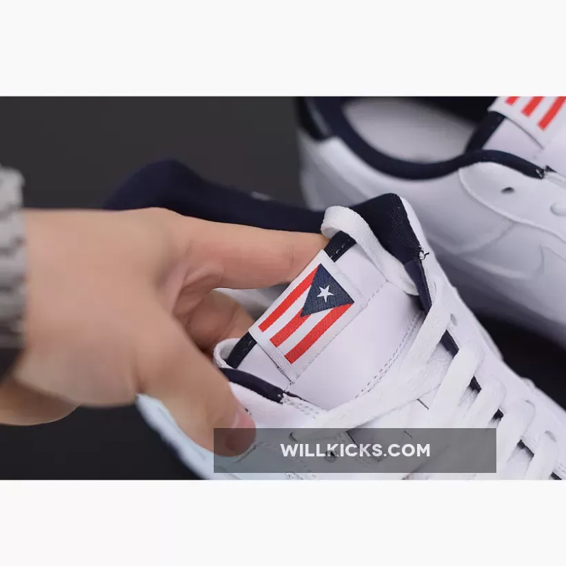 Dressed in a True White, Obsidian, and Comet Red color scheme. This “Puerto Rico” version of the Nike Air Force 1 replaces the original Navy Swooshes for White and the lining comes in Navy instead of Red. The Puerto Rico flag appears once again on the heels as well as on the tongues completed with Navy rubber soles and printed insoles with a Green common coquí, a frog native to the island.