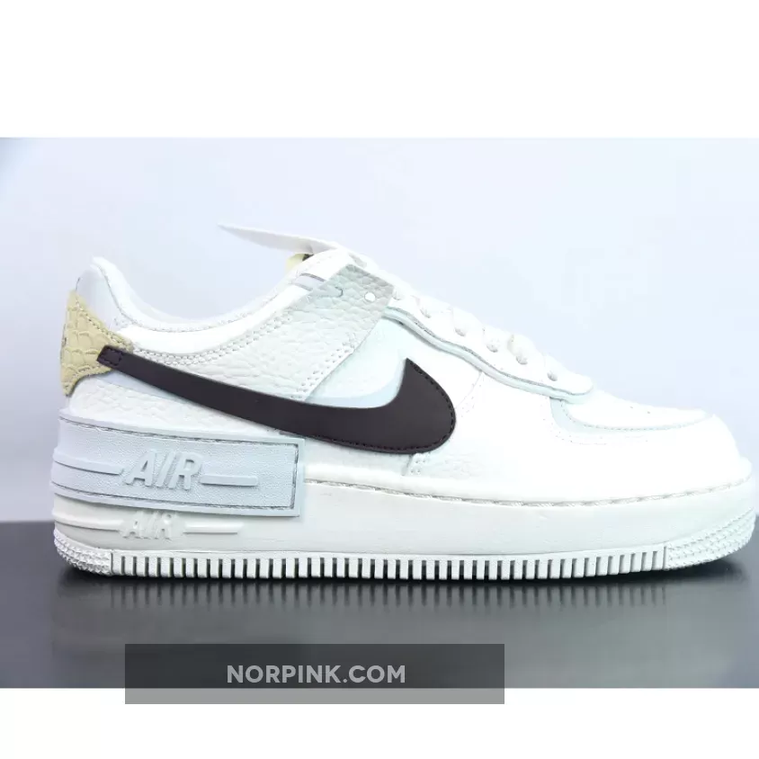 All the deconstructed tooling is here once again, the Shadow’s layered panels sprinkled throughout. The majority of the upper bears a white leather construction, light blue hits peeking out from underneath the overlaying panelling. A dark brown Swoosh clings on with its segmented stitching, partly attached to the python heel panel. Both heel portions boast different scaling patterns which only adds to the asymmetrical feel of the shoe, however bear the same embroidered vintage “nike” font. A mirrored logo on the insole and doubled up tongue labels are another fraction of changes that make the Shadow a fun addition to the Air Force line-up.