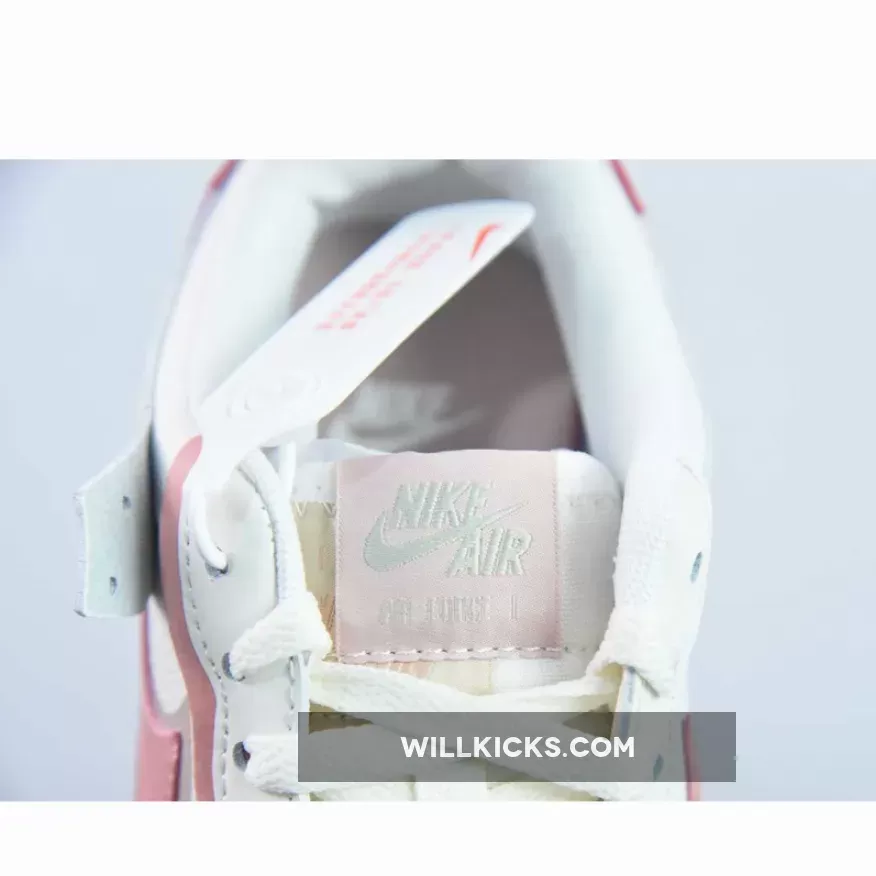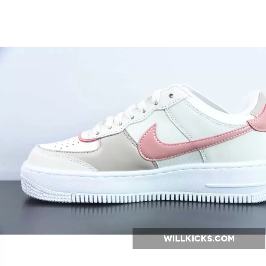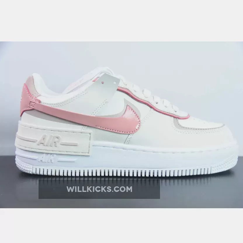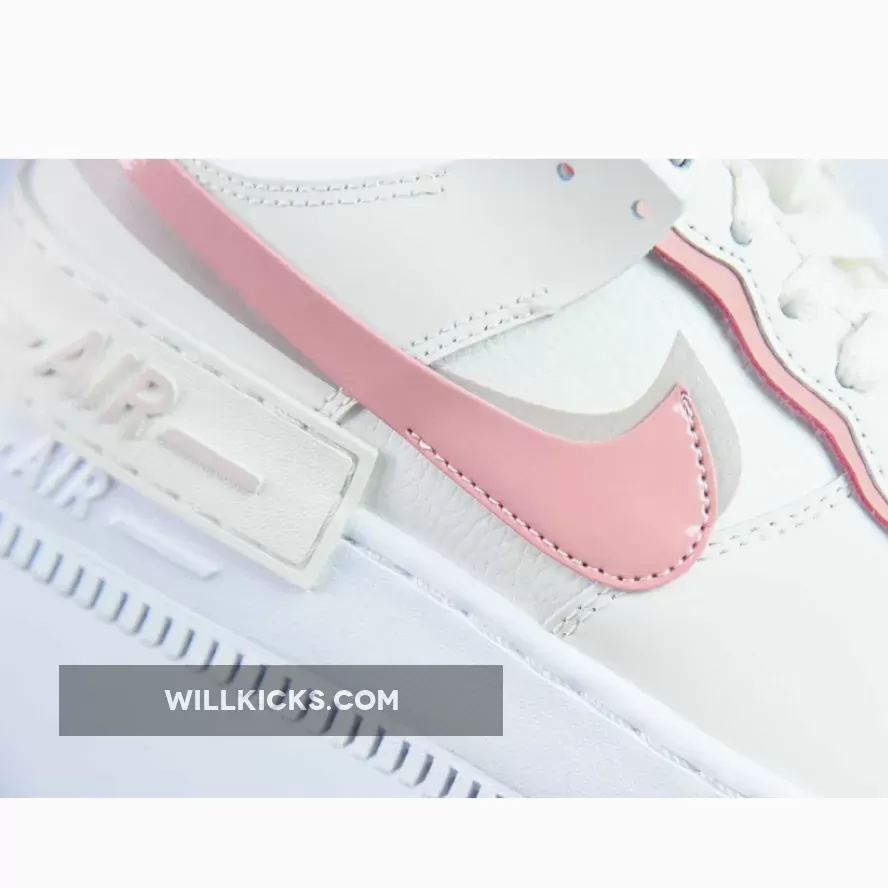 This offering of the Nike Air Force 1 Shadow comes constructed in a mix of smooth and tumbled leather, and mesh materials with a layered aesthetic. It features a White and Sail base highlighted with Pink contrasting accents on the Swooshes, heels, tongue labels, eyestay, and insoles. A solid White AF1 rubber sole completes the design.