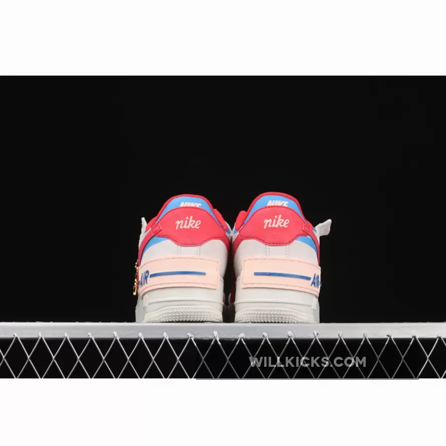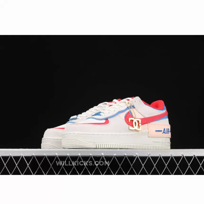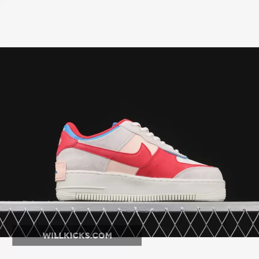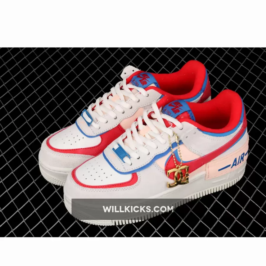 Dressed in a Sail, University Red and Photo Blue color scheme. This Nike Air Force 1 Shadow comes constructed in a mix of leather, mesh and suede highlighted with Red and Blue contrasting accents throughout. Hints of Pink atop a solid White rubber sole completes the design.