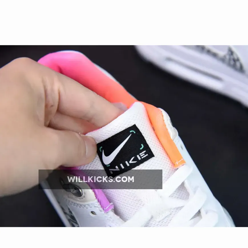 The interior lining provides a nice pop of color via an orange-to-pink gradient, three Swooshes on the medial forefoot come in blue, pink, and yellow. A fresh translucent outsole completes this special colourway.