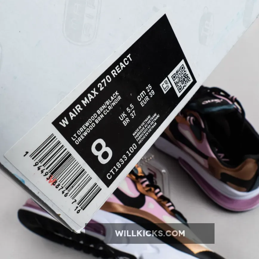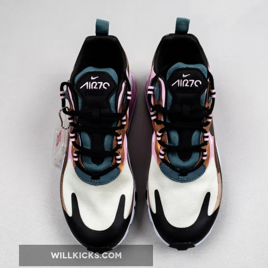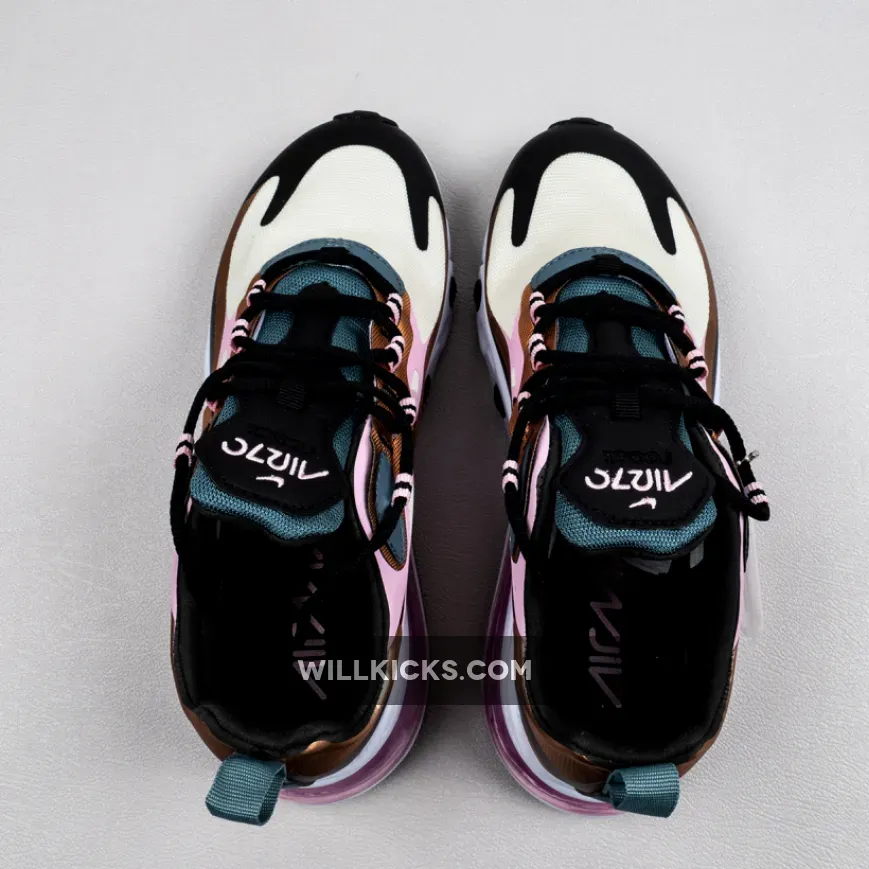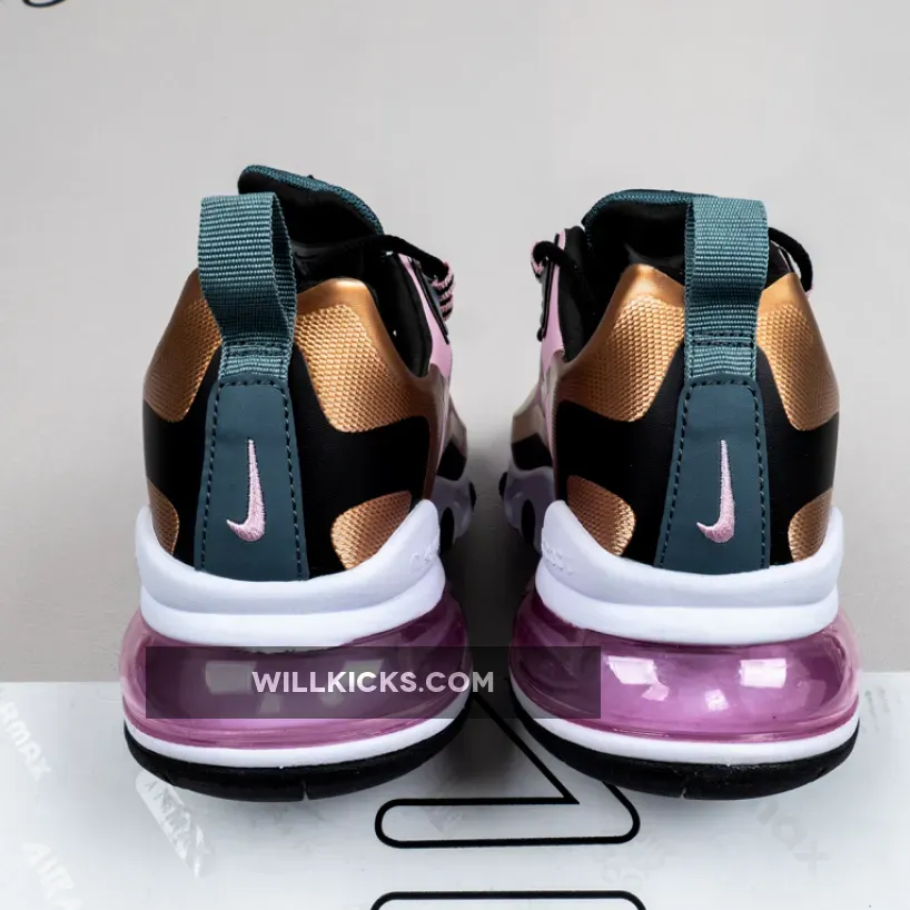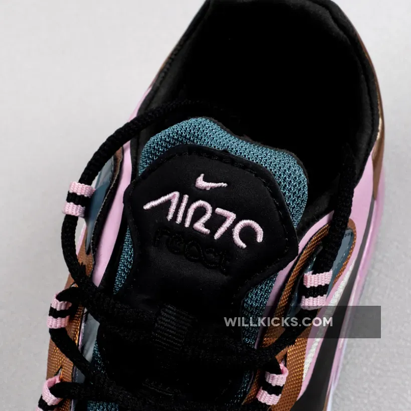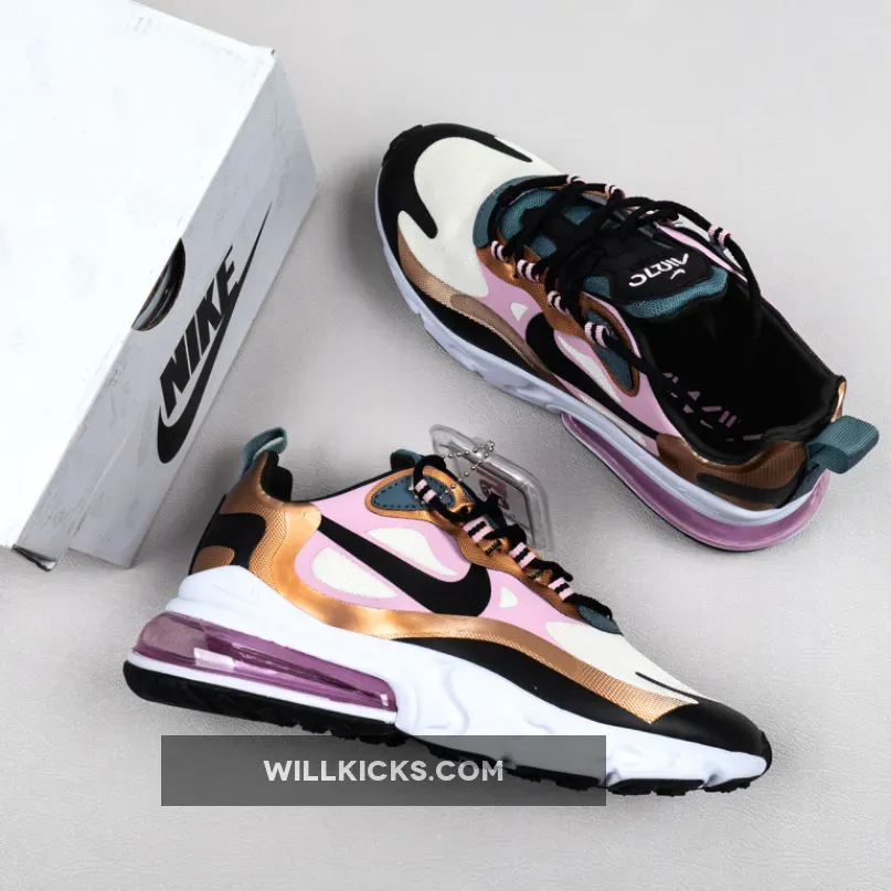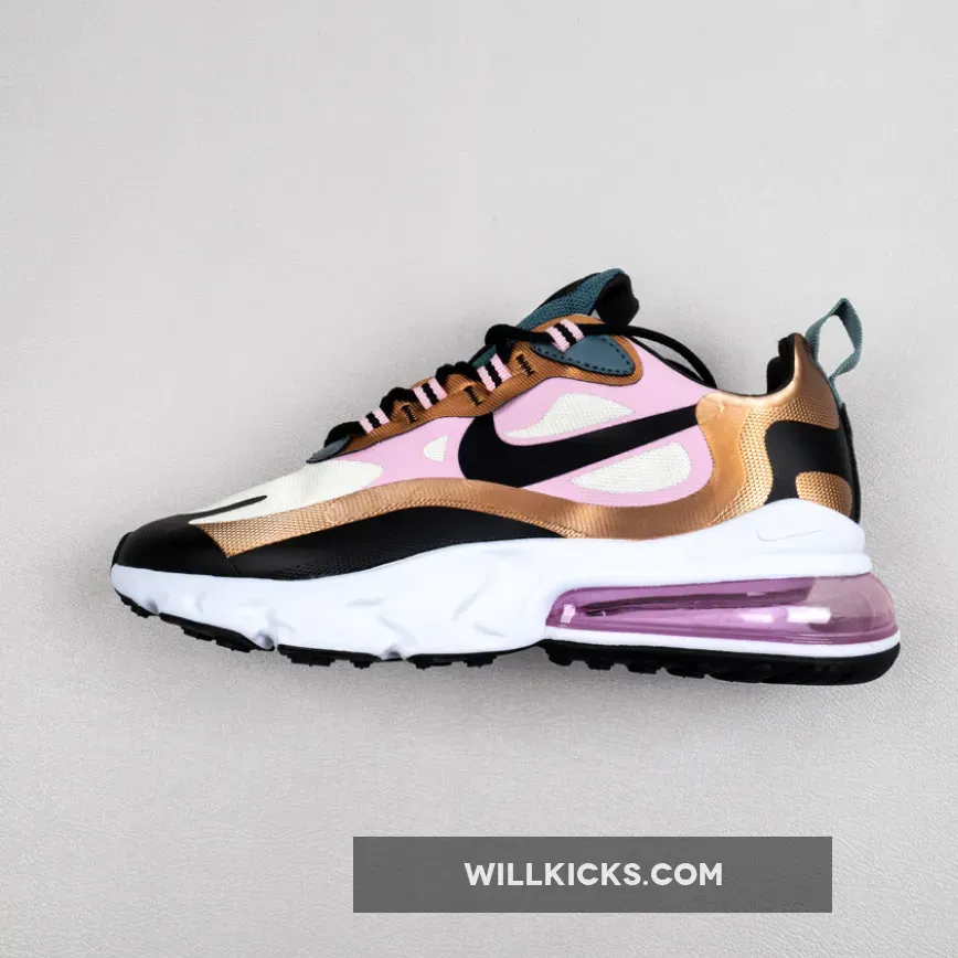 This offering of the Nike Air Max 270 React features a Beige mesh base with synthetic overlays in a mix of Pink and Bronze with Black Swooshes on the sides. A White React midsole, Pink covering the Air Max heel unit with a Bronze boarder atop a Black outsole completes the design.