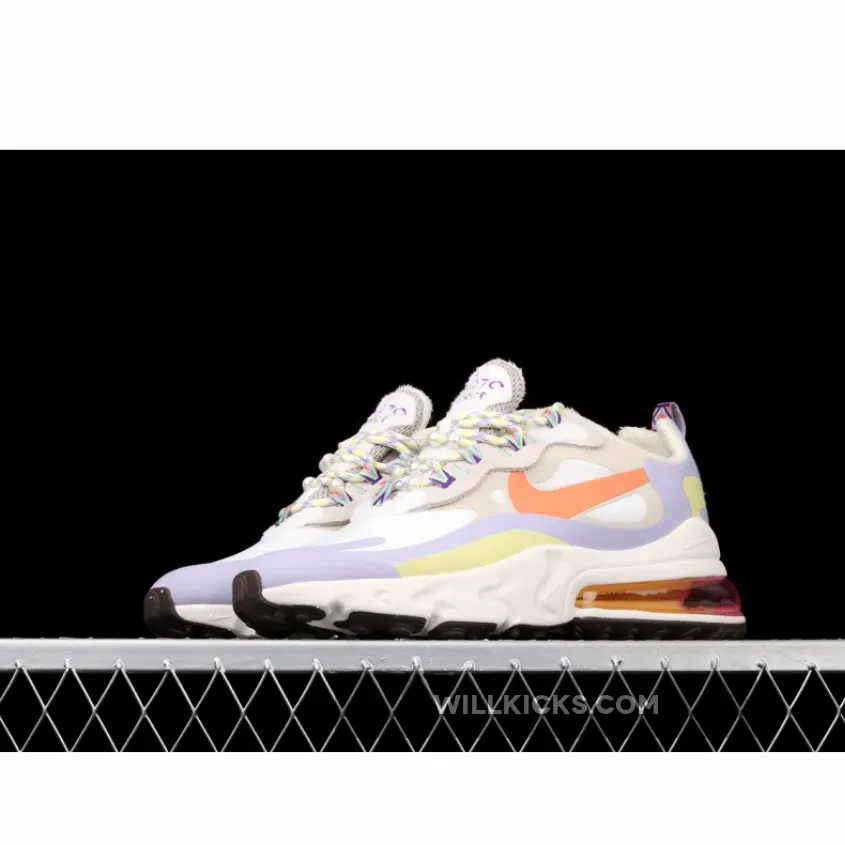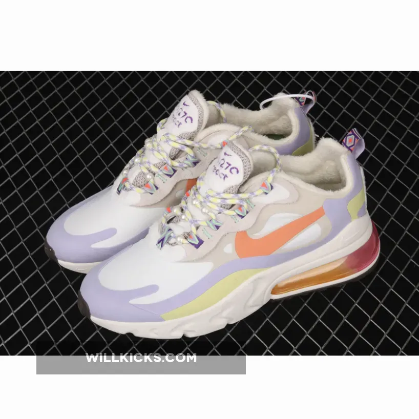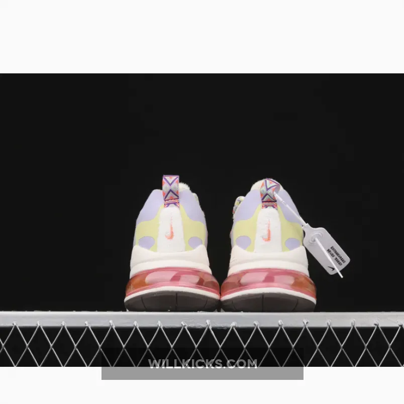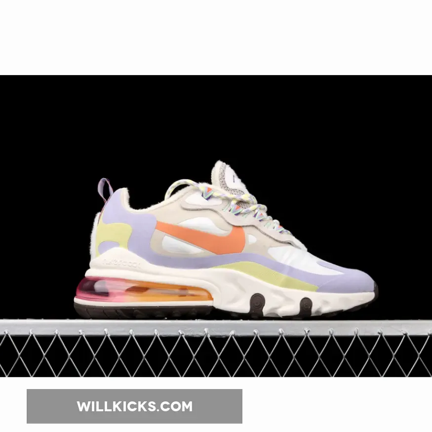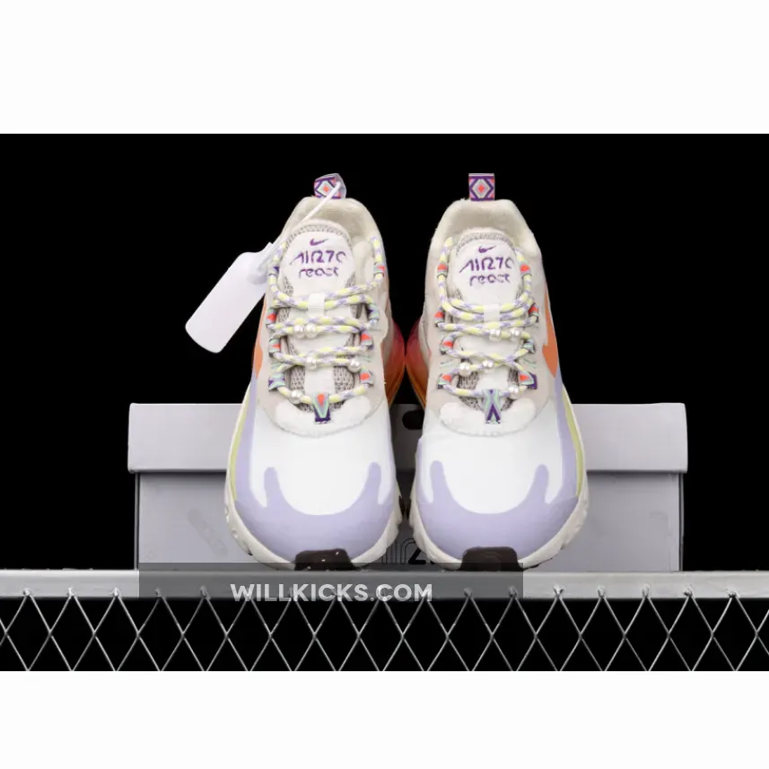 This offering of the Nike Air Max 270 React features a mix of White and Beige covering the upper detailed with pastel Orange, Purple, and Yellow tones. Suede eyelet overlays, pearls spotted throughout the laces, fleece lining to keep warm during the colder months highlighted with a native patterns on the lace loops, heel tab, and insoles. A gradient Air Max heel unit atop a React cushioned sole completes the design.