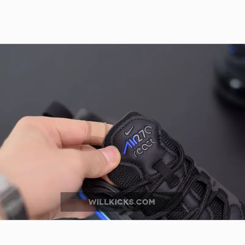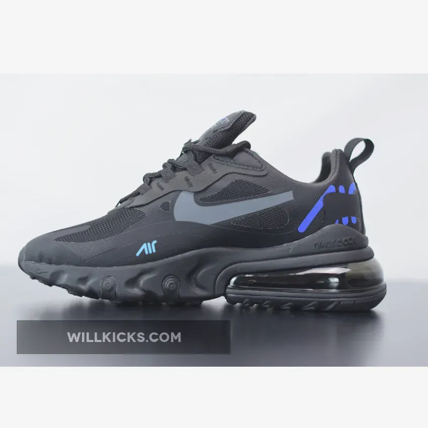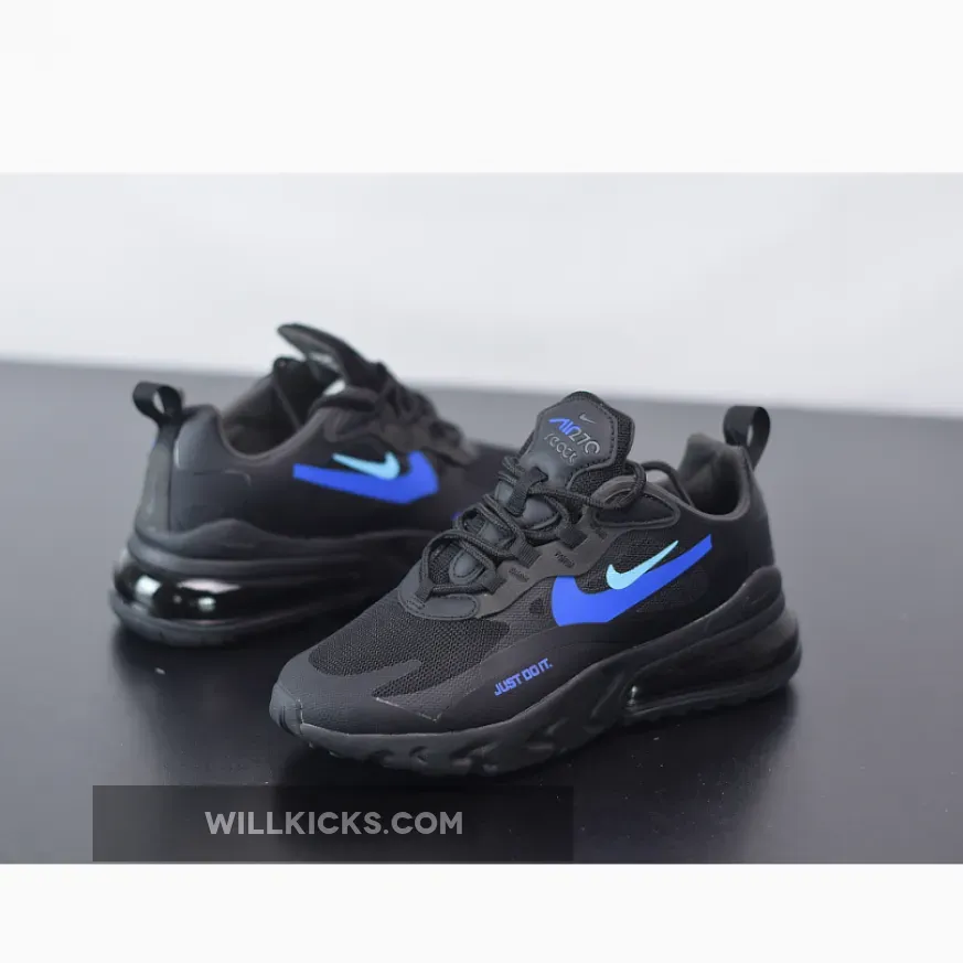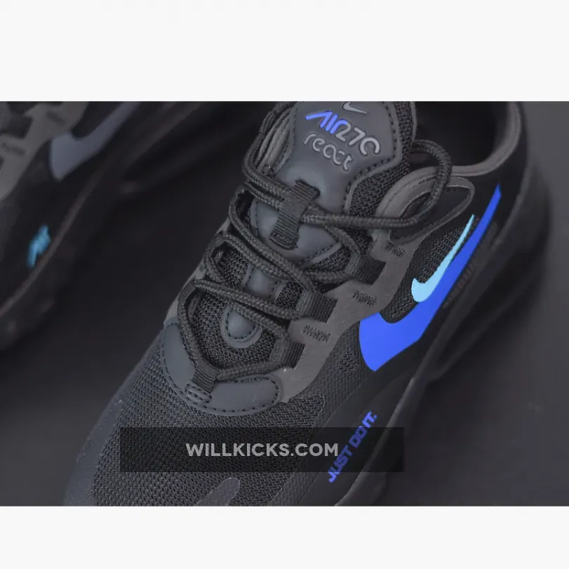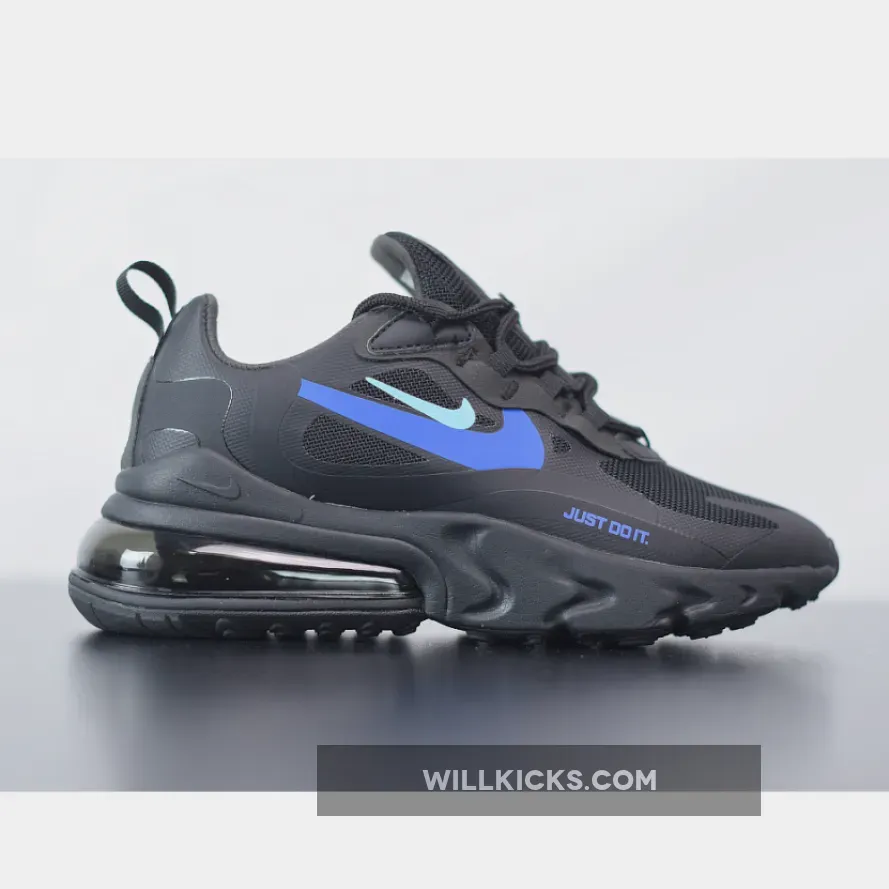 Drenched in an all-Black colourway is the brand new Air Max 270 React. The top of the sneaker features lightweight construction. The material in use for the development of the crep is synthetic and leather overlays. Furthermore, the pop of contrast on the sneaker is the inclusion of the Blue branding on the lateral side of the shoe. Moreover, the “Just Do It” is present on the lateral along with the Swoosh. Down below the sneaker we have the Black react cushioning on the sole that completes the design of this brand new Air Max 270 React.