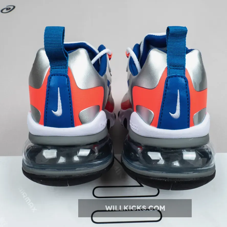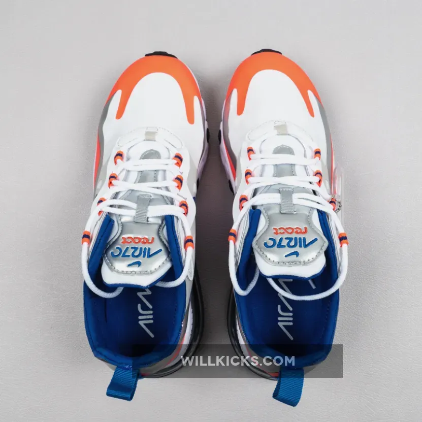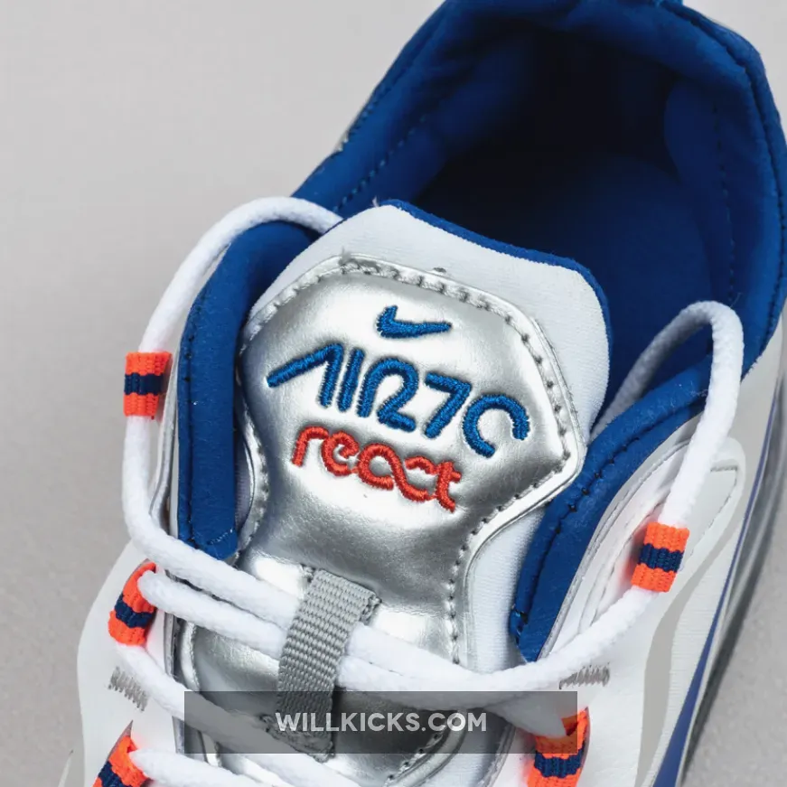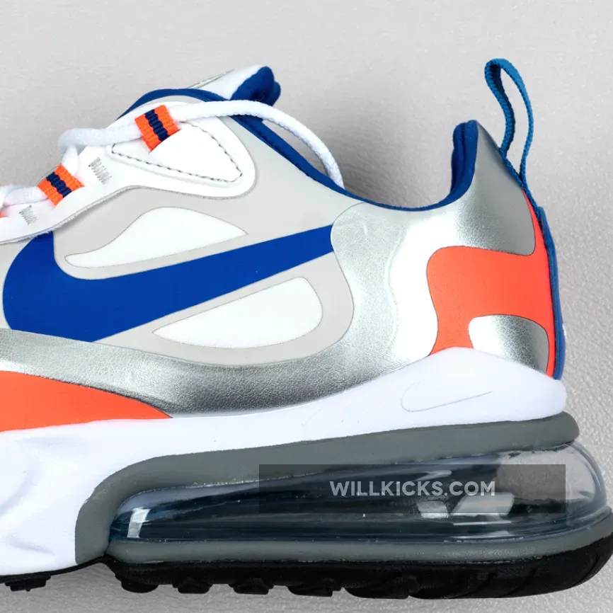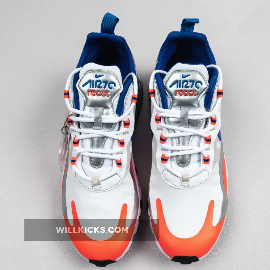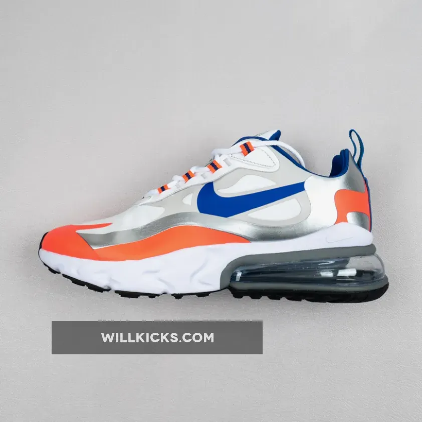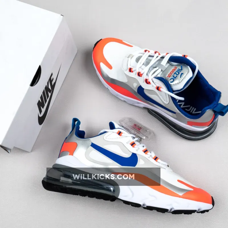 The hybrid sneaker matches traditional Air Max technology with React technology, creating one of the most comfortable and supportive Nike sneakers to ever launch. The panelled upper showcases a white base layer that’s decorated with orange, blue and silver sections for a clean and familiar look. Large Swoosh logos are located on both the lateral and medial sides, while Air Max branding is present at the tongue.