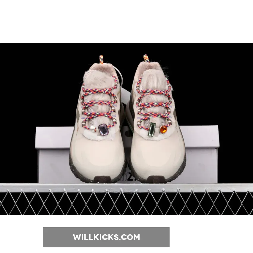 The most outstanding of the offering’s features would undoubtedly be the attached fur that outfits a large section of the instep. Its hairs are wrapped over top by colorful rope laces whose topmost loop is accessorized with a green carabiner and a complementing paracord keychain. What’s more, the vamp brings along the brand’s penchant for jewelry as gems of emerald, orange, and purple shades are used as if dubraes. A light tan then lies underneath in two fashions: one a more flat, unblemished finish and the other an eccentric mosaic of animal print. Speckled soles then draw just below, volt accents the model’s matted Air unit, and terry cloth warms from within.