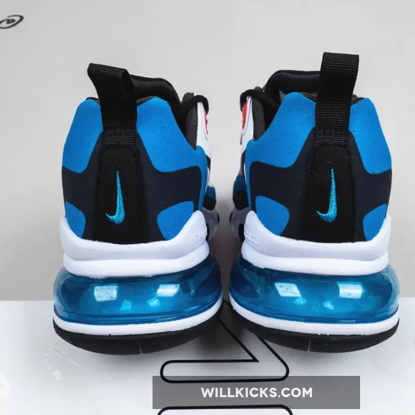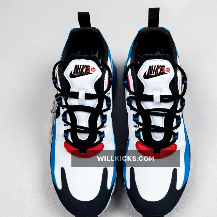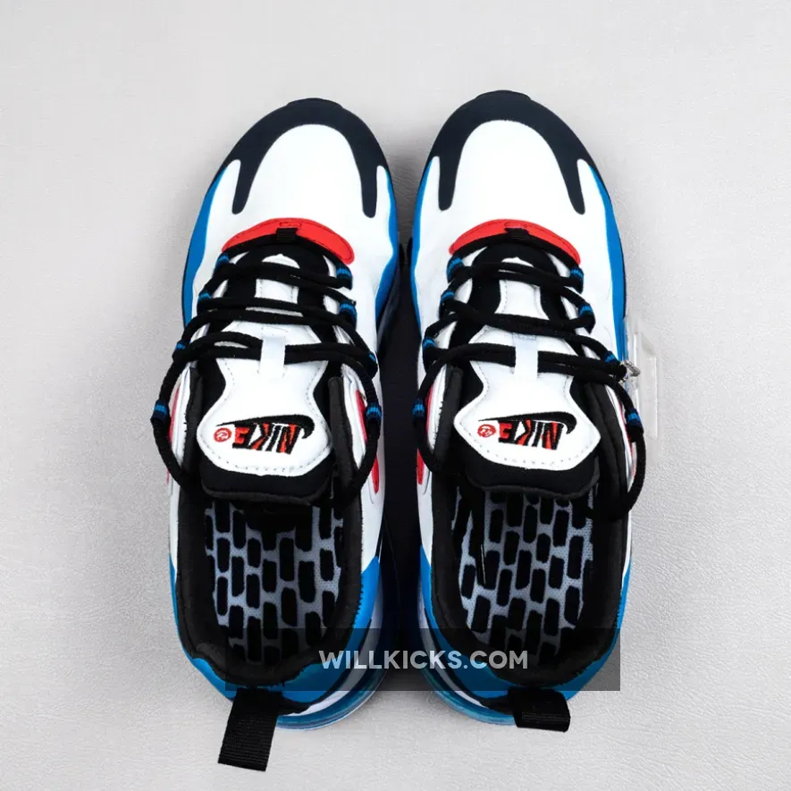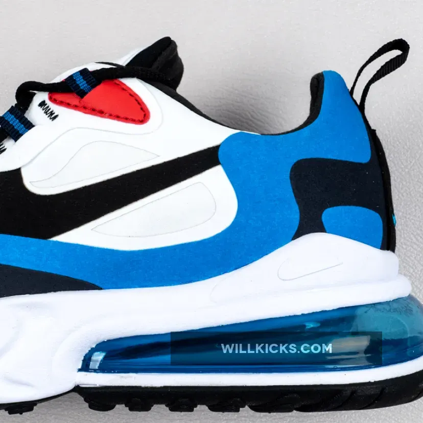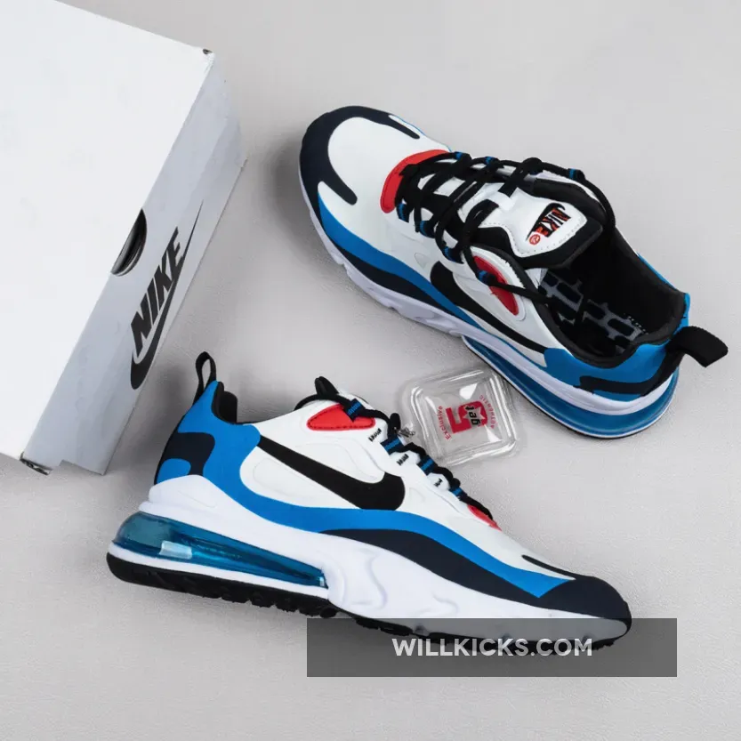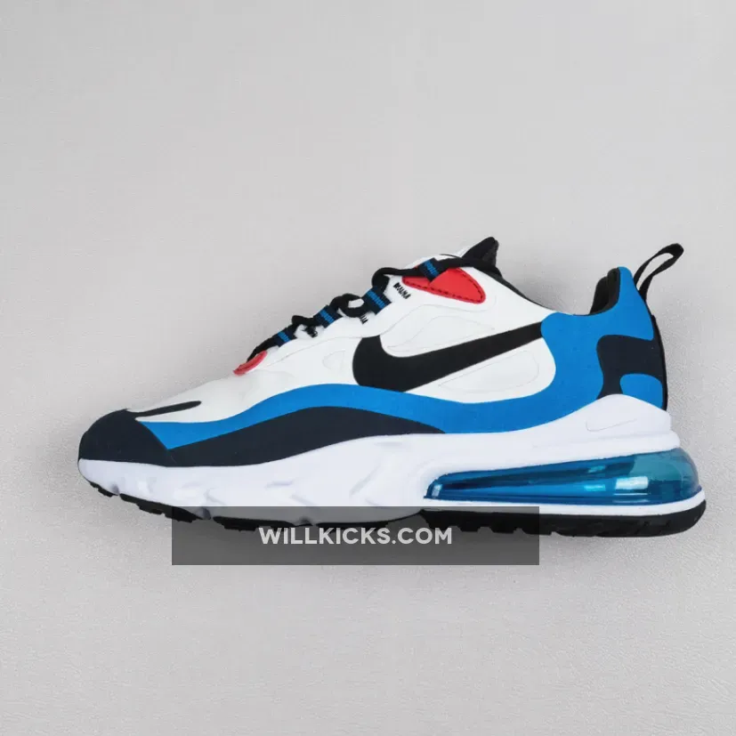 this Nike Air Max 270 React comes dressed in a White, Photo Blue and University Red color combination. Highlighted with White on the base while both Photo Blue and Navy is applied to the overlays. Following we have Black which lands on the laces, liner and Swoosh logos. Other details includes Red leather on the eyestay while a brick design lands on the insoles to finish the look.