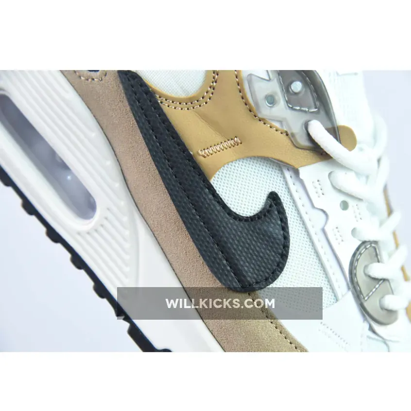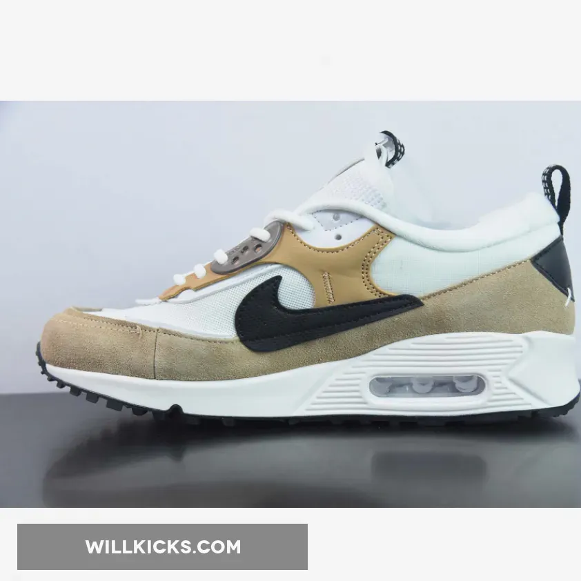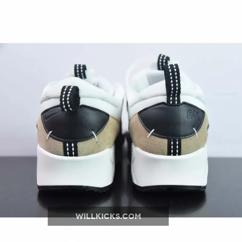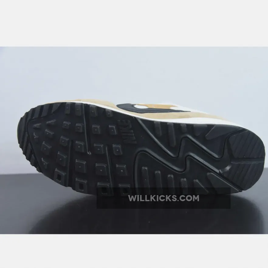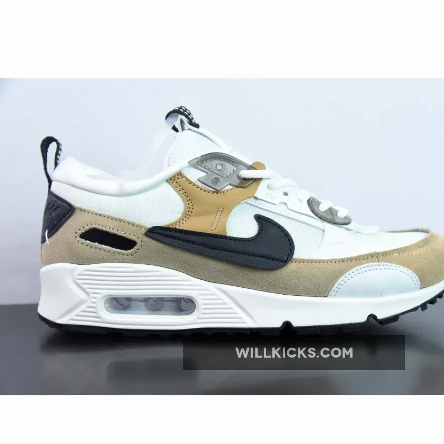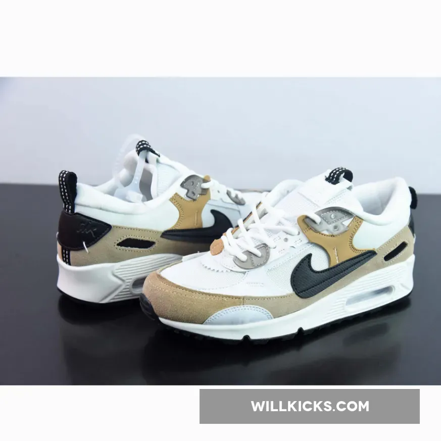 Air Max 90 Futura sneakers from Nike featuring beige, black, white, calf suede, signature Swoosh logo detail, contrasting panel detail, round toe, front lace-up fastening, double pull-tab at the opening, branded insole and rubber sole with Max Air cushioning.
