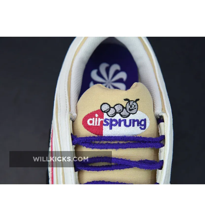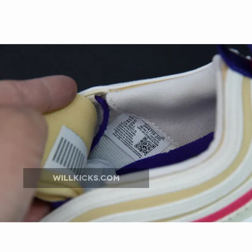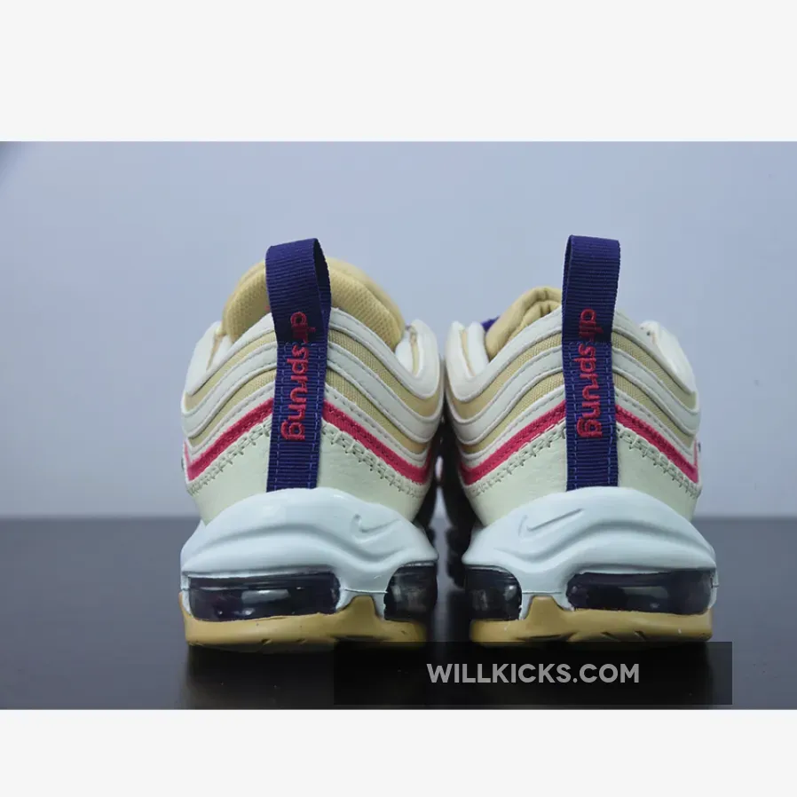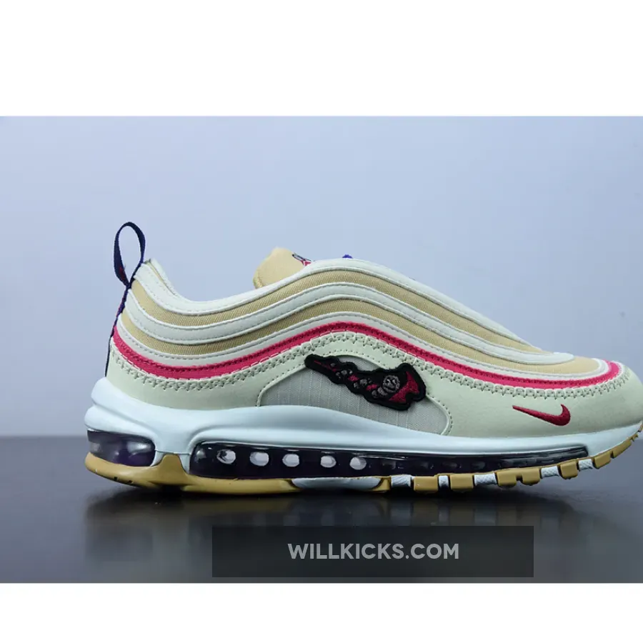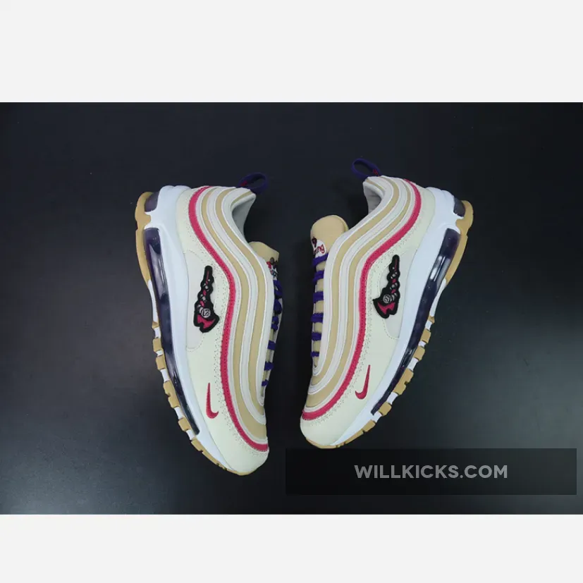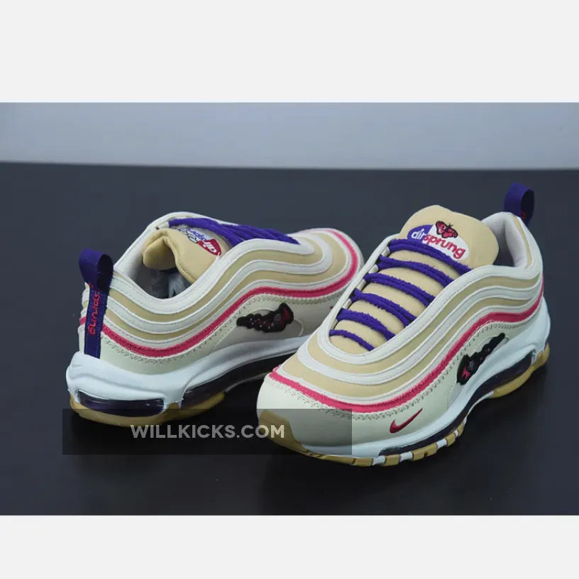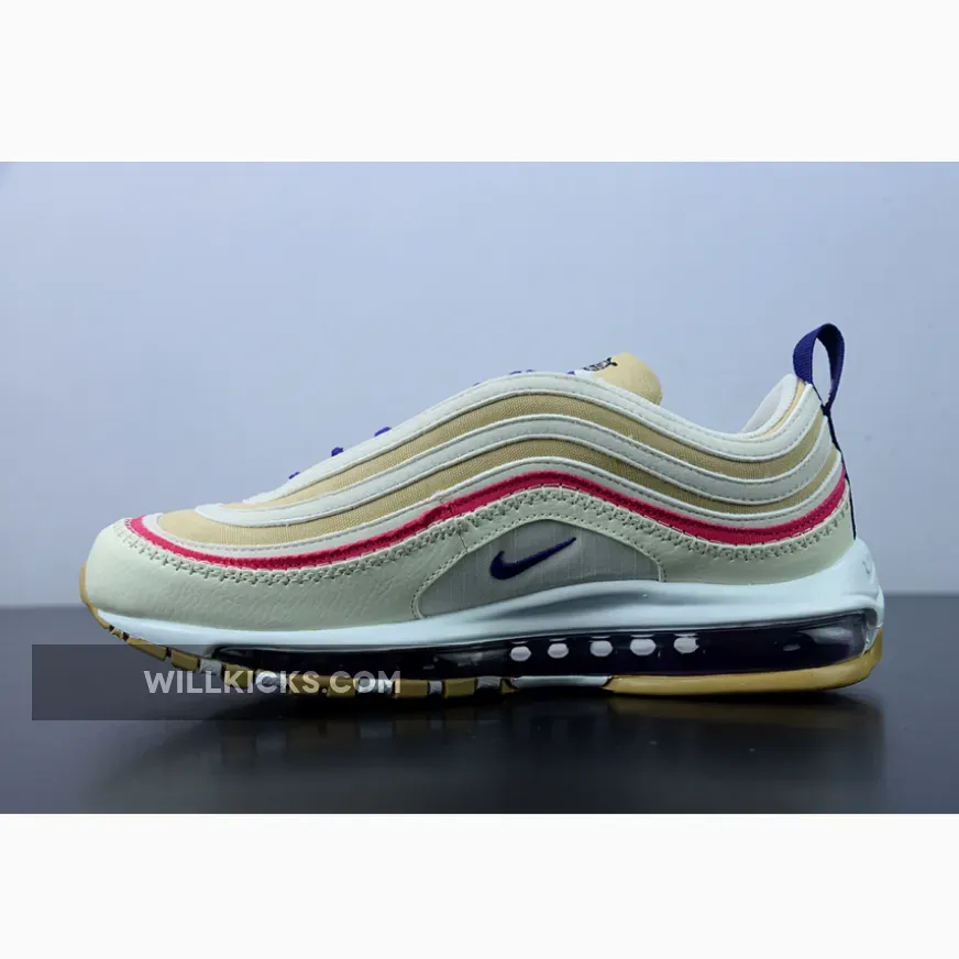 Starting off with a Sail/cream-like hue throughout the majority of the uppert, this Nike Air Max 97 comes equipped with recycled materials in addition to canvas and tumbled leather. The cream upper is contrasted by purple and pink accents on the laces, the trim of the upper, tongue branding, heel tabs, and the translucent Air Max bubble on the midsole. Additional details include embroidered caterpillar Swooshes on the side panels, “air sprung” branding on the tongues, white midsoles, and white/tan rubber outsoles.