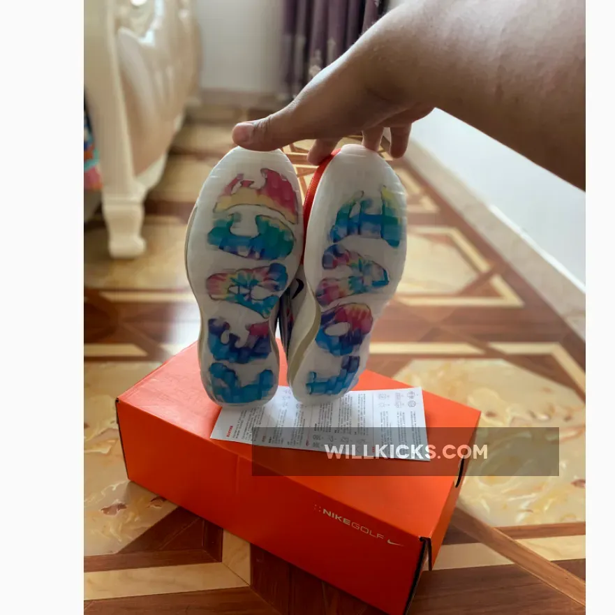Against its natural white background, you’ll find the multi-colored groovy patterns flooding onto the mudguards and just between each of its wavy overlays. The theme continues onto the translucent outsole which is adorned with more tie dye, only in a way that spells out “LOVE” in all caps. On the interior, the footbeds, are swathed with a vibrant green hue, and stamped with Nike Golf branding remixed with hippie-style font
