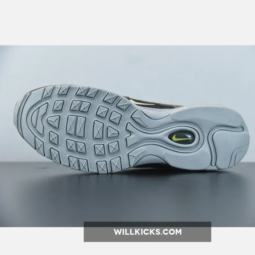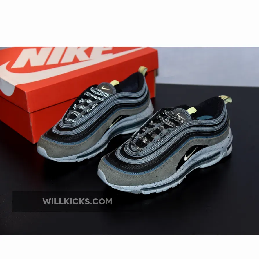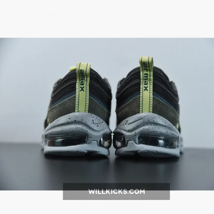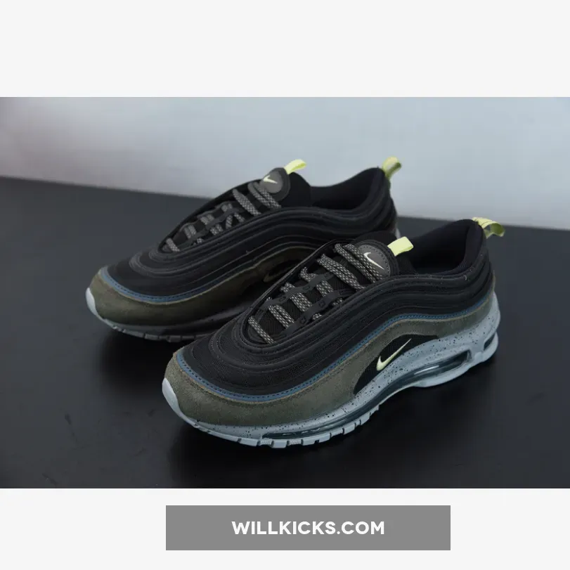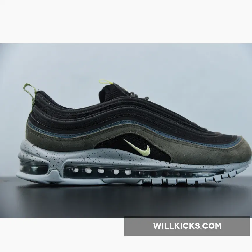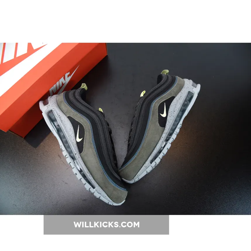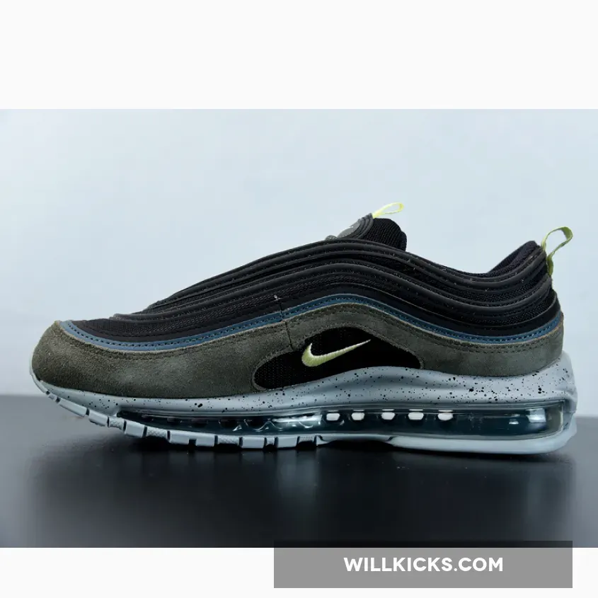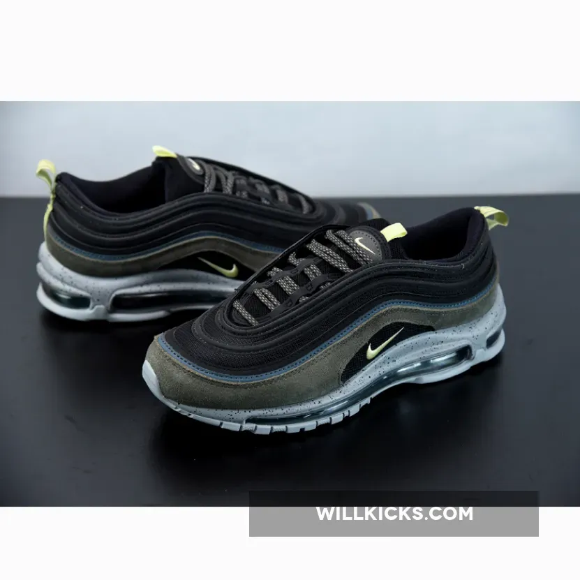 This offering of the Nike Air Max 97 features a Black mesh base with leather and suede overlays in a Slate Blue and Olive hue, respectively. Volt Yellow accents, 3M reflective detailing atop a speckled midsole completes the design.