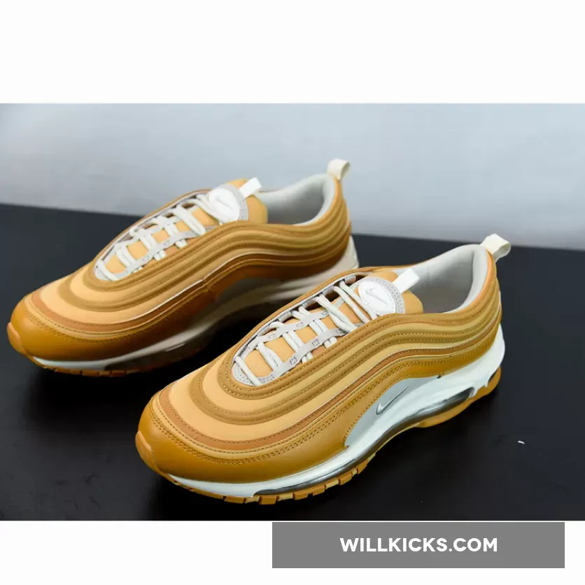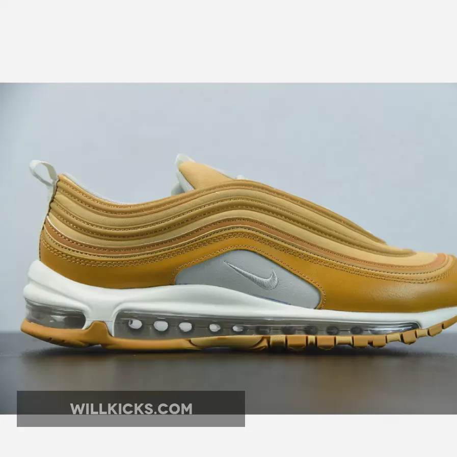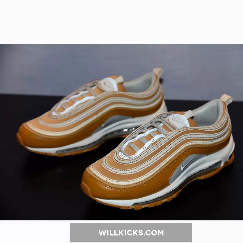 The Nike Air Max 97 “Wheat Gum” offers a classic silhouette with a cozy, earthy vibe. The Wheat base and tumbled leather elevate the design, while the combination of white accents and gum outsole provides a timeless balance. Overall, a stylish and comfortable sneaker perfect for the fall season.