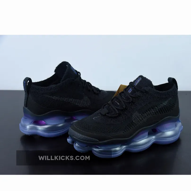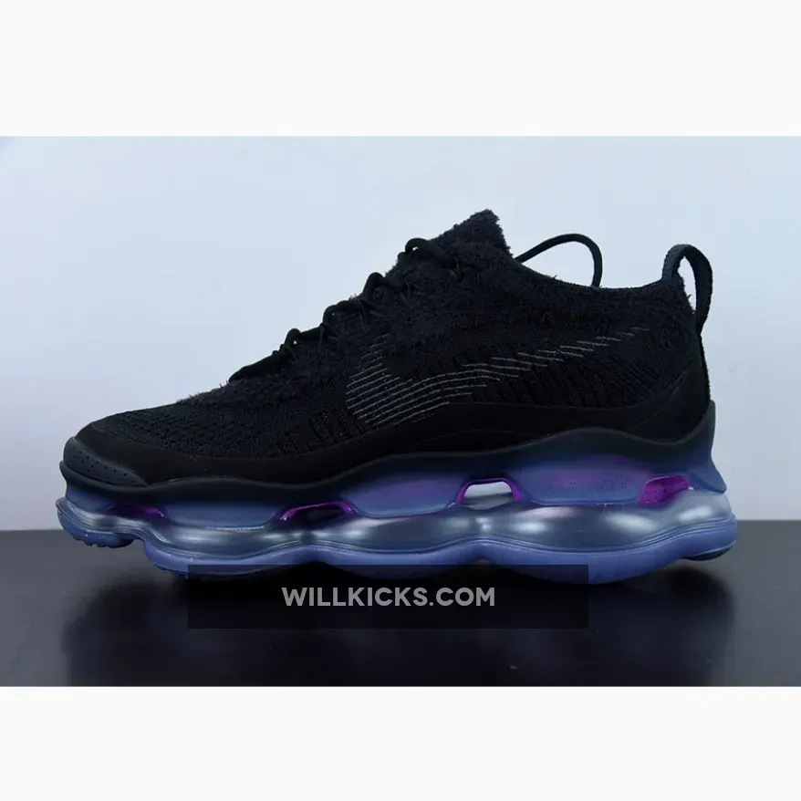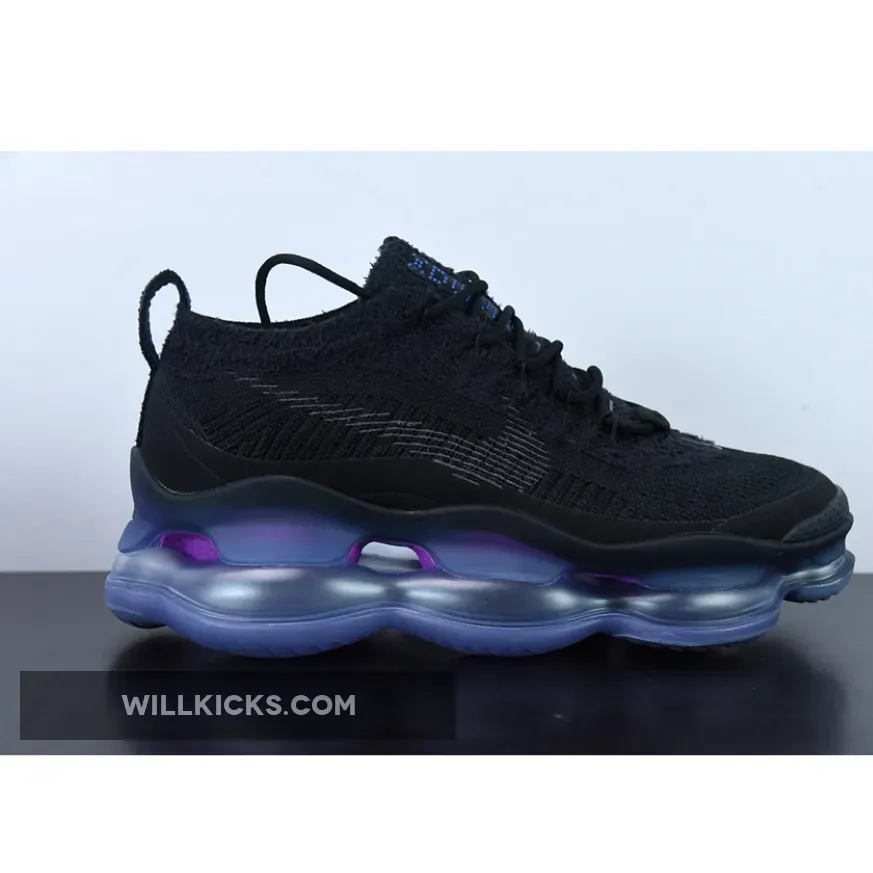 Ultra-comfortable and eye-catching, the Nike Air Max Scorpion Black is not a pair that will blend in the background. It stands out with its chunky two-toned purple and electric blue Air bubbles which produces an ethereal iridescent-like look.Above the Air Max Scorpion’s midsole is a black Flyknit upper which boasts superior durability and breathability. The flexible construction of the yarns will also provide a nice, snug fit. A lightweight tongue, convenient lacing system and subtle pull tab complete the unique design.