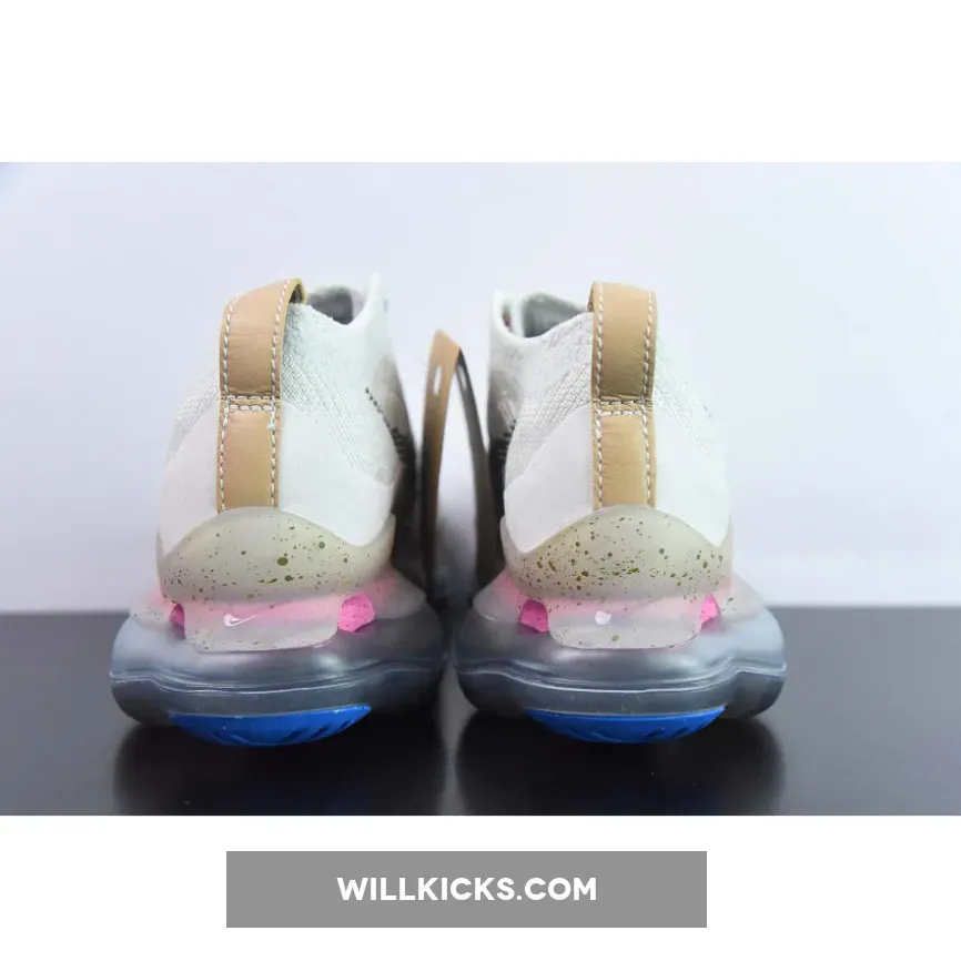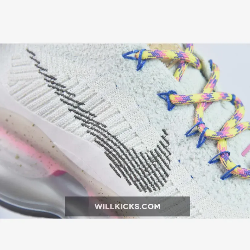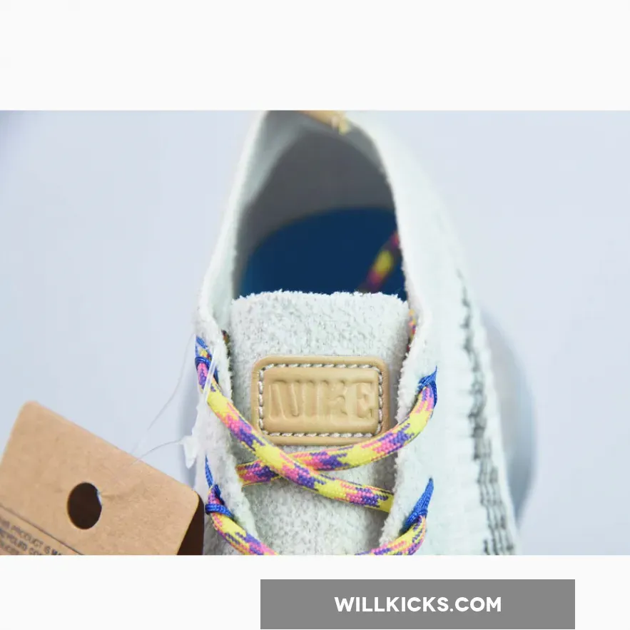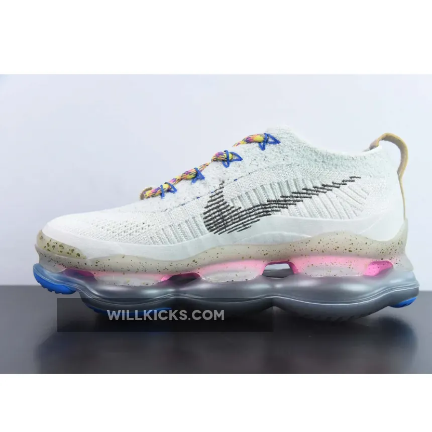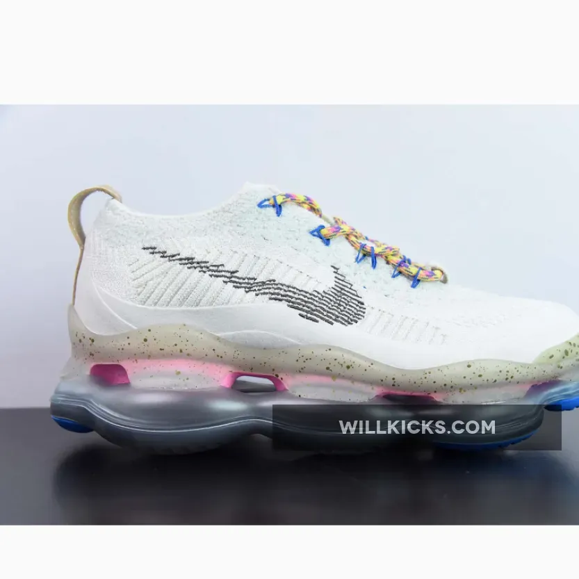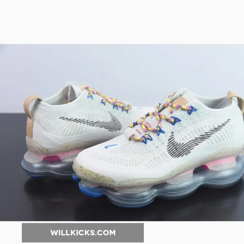 The Nike Air Max Scorpion Hiking features an Off-White colored Flyknit upper with stitched Swoosh logos on the side panels. Adding some color to the design are the Yellow, Pink and Purple-colored rope laces. Elsewhere you will find includes Yellow. Pink, and Purple-colored rope laces, Tan leather tongue labels and heel pull tabs, Blue mini Swooshes on the toe with Nike “Just Do It” branded insoles.