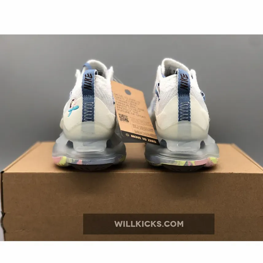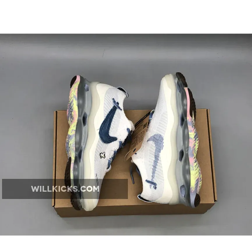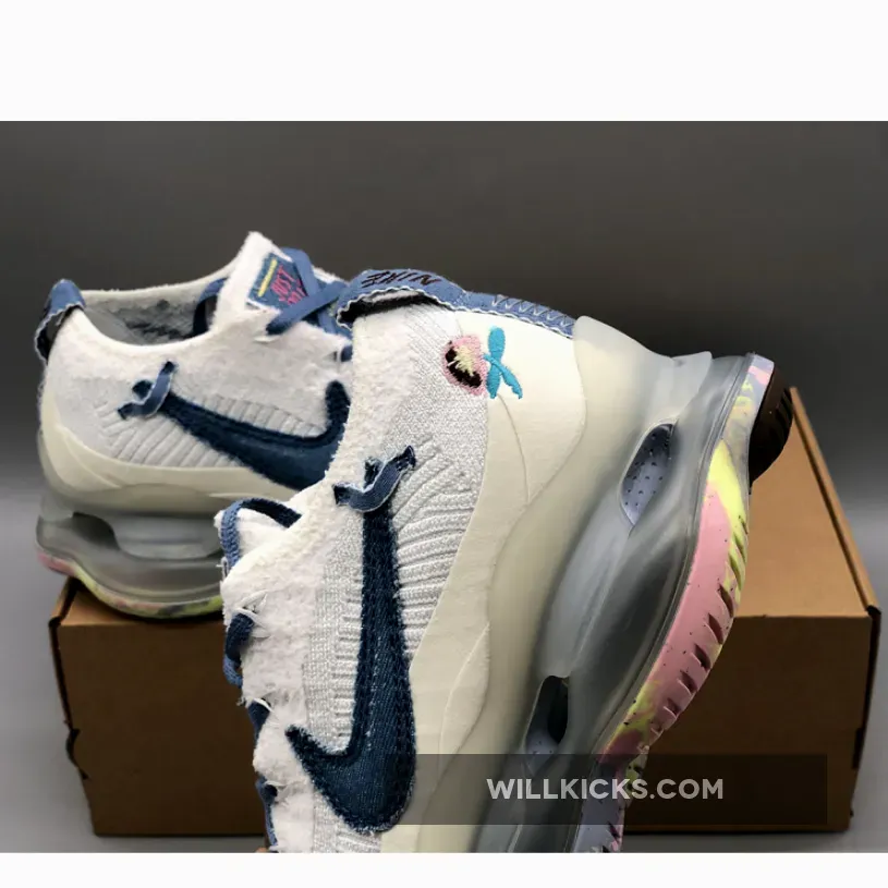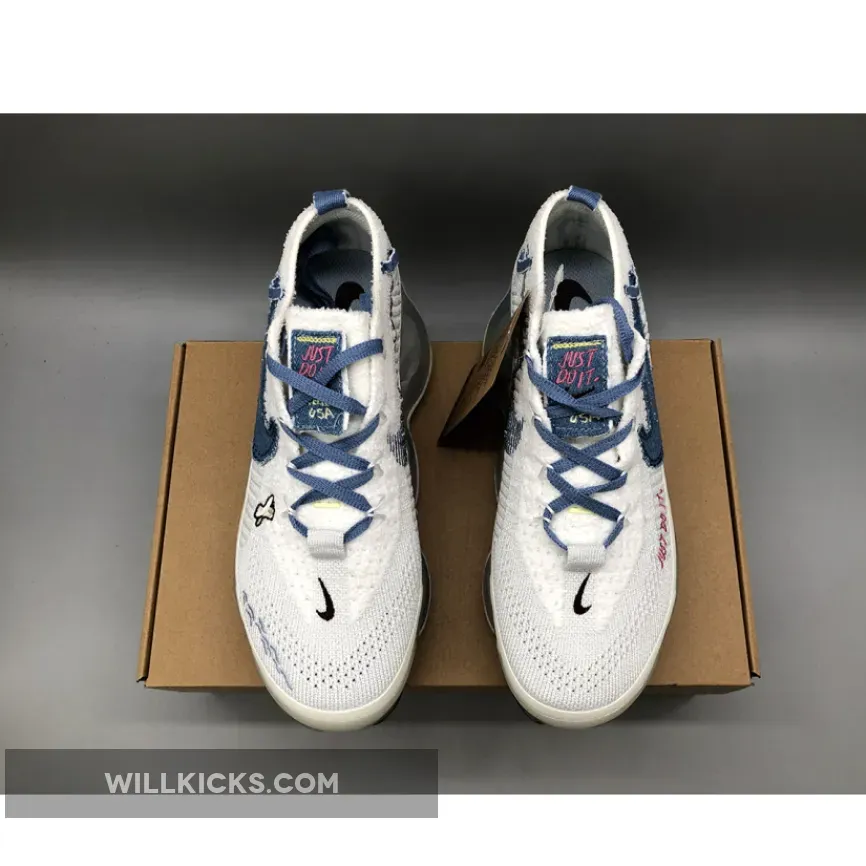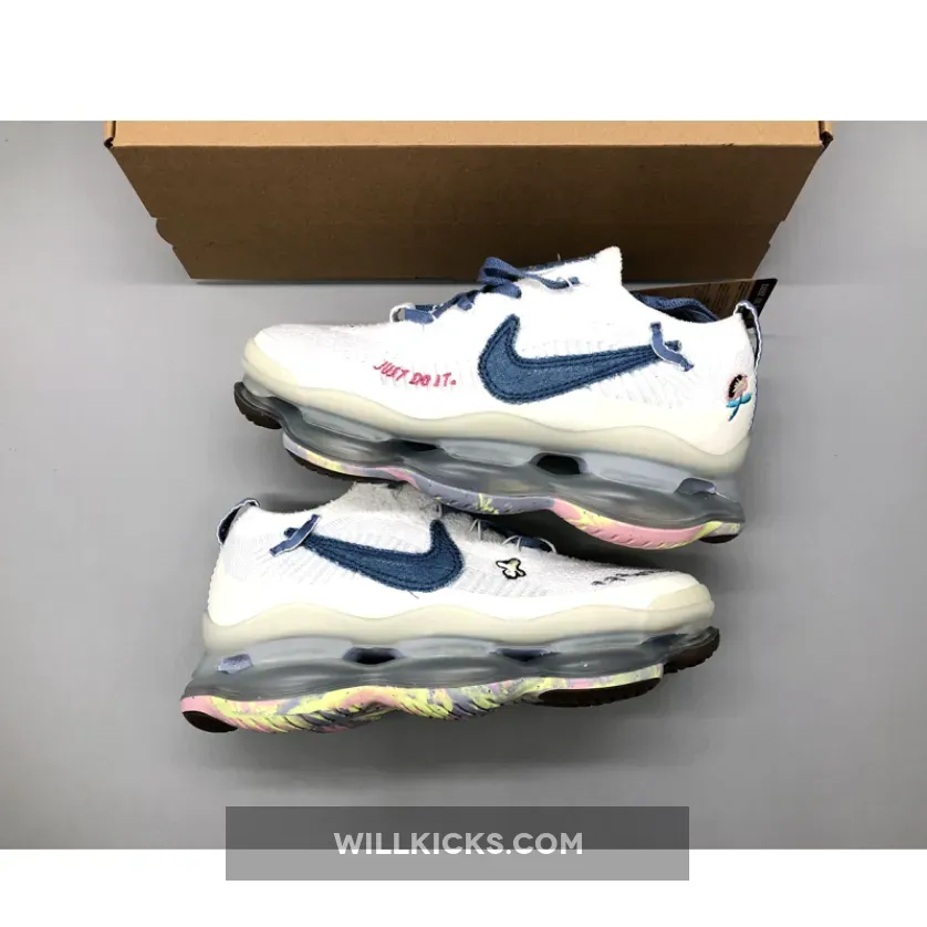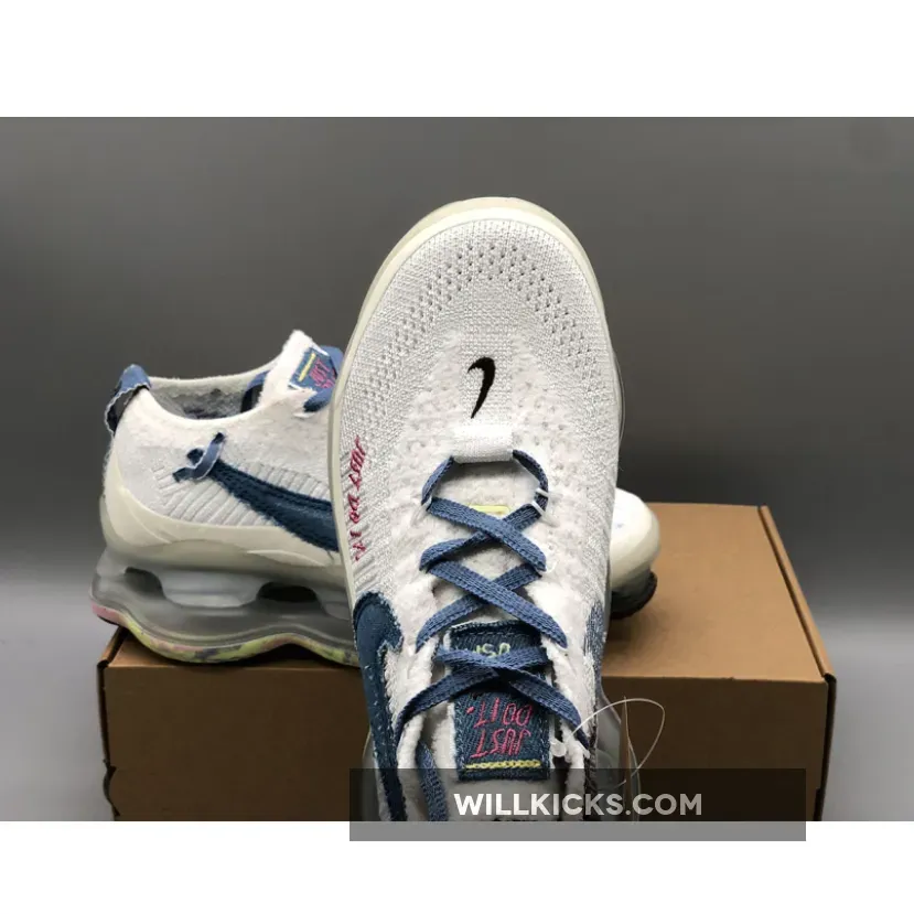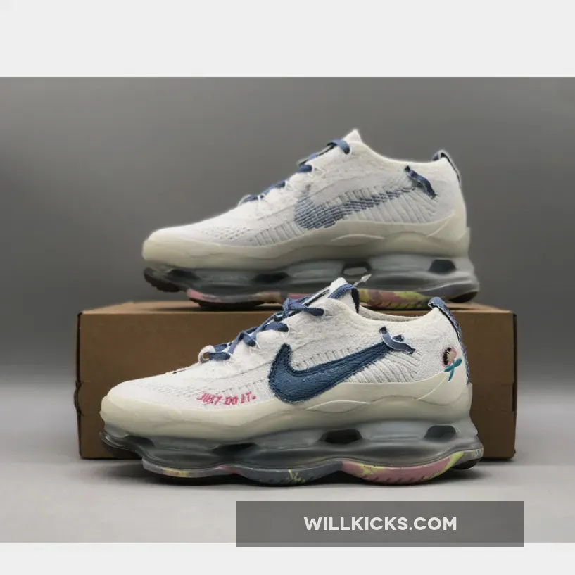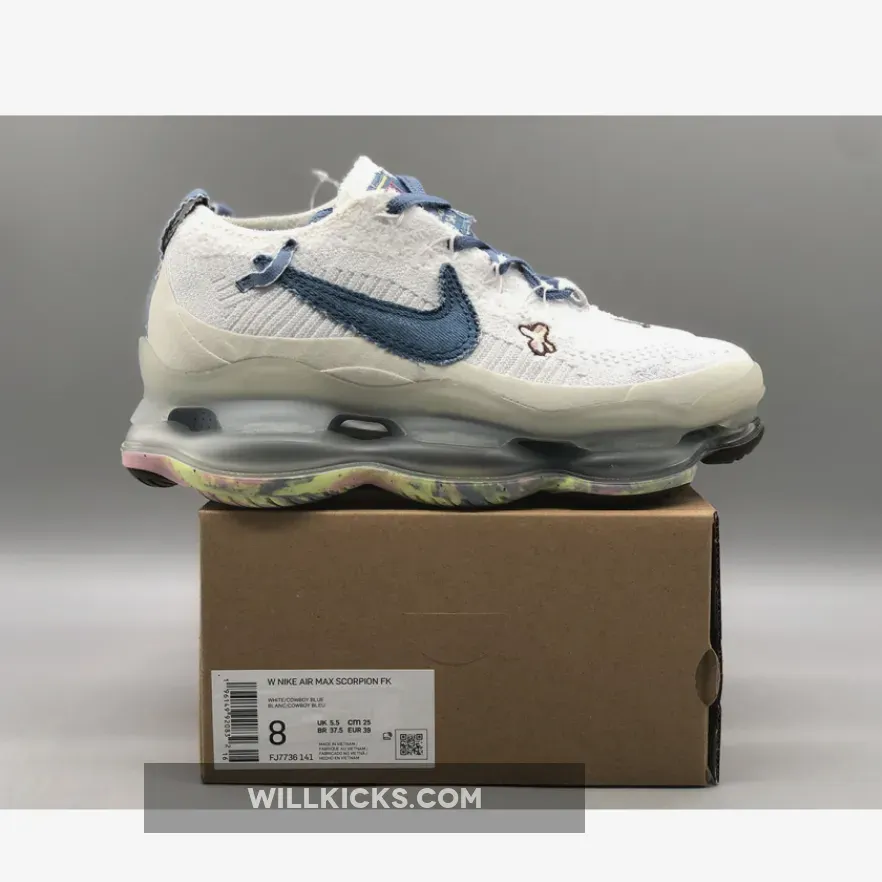 The “Just Do It” iteration of the Nike Air Max Scorpion comes dressed in a White and Blue Whisper color scheme. It features a Flyknit upper with Swooshes utilize blue with the lateral Swoosh taking on a new shape with layers of visible stitching..