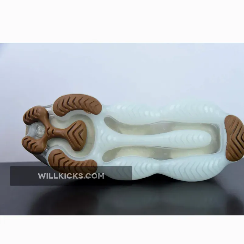 Underfoot, a darkened brush of marble outfits the midsole in tandem with its pillowed semi-translucent cushioning system and brown tread pucks below.