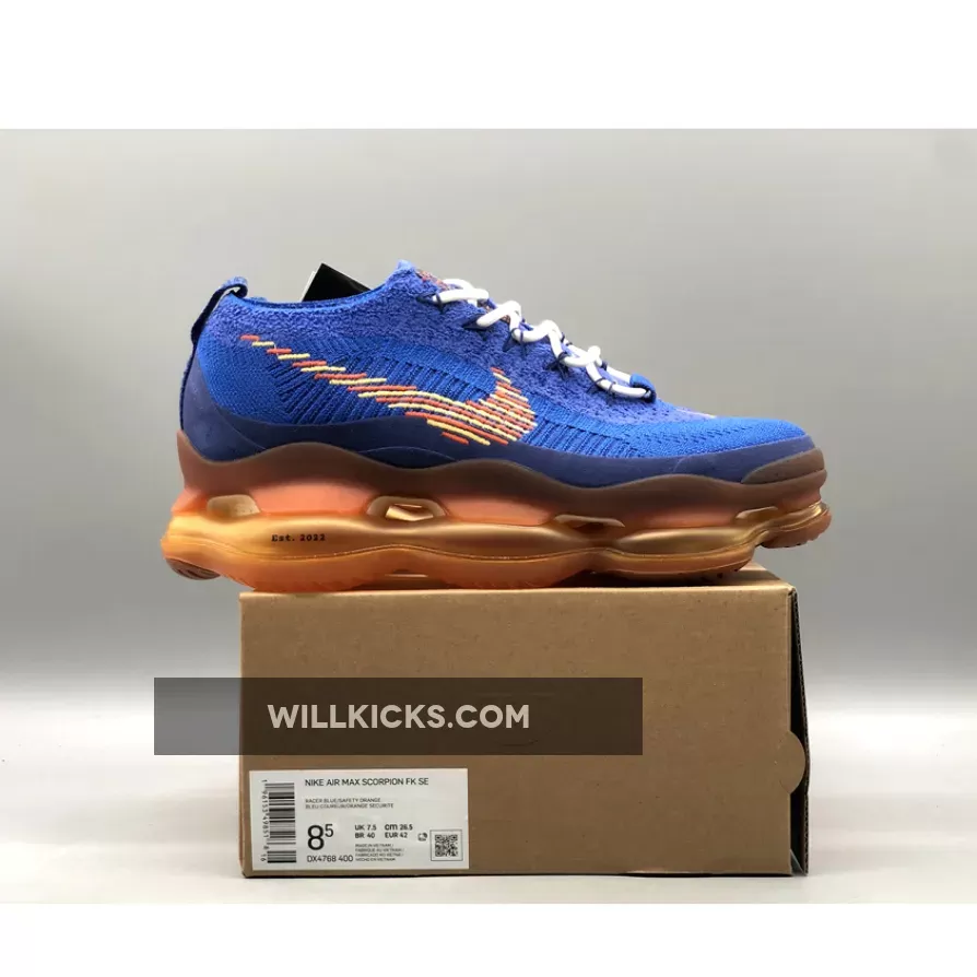 Thanks to great storytelling from Nike, we are aware of some of the legends behind the brand’s early found success. One of the men responsible for the Swoosh’s triumph is Marion “Frank” Rudy, an aeronautical engineer who patented the cushioning system based on encapsulated gas, or as we know it, Nike Air. Celebrating his achievements is this pair of Air Max Scorpion, one of a few Air Max silhouettes chosen as part of a dedicated M. Frank Rudy pack.The Scorpion’s chenille upper is draped in a blue, similar to the shade found on the barometer hang tag that comes attached to the shoe. It’s also a possible nod to Rudy’s former role within NASA, adopting the space-blue that decorates the iconic insignia. The dotted branding on the tongue and heel are present in an orange, resembling the blinking lights that would constantly flicker on the surface of wall-to-wall mega computers from the ’70s.Quality detailing and an exciting colourway make this an excellent first pair of Air Max Scorpion. If you haven’t got round to grabbing Nike’s latest Air Max silhouette then now could be your chance.