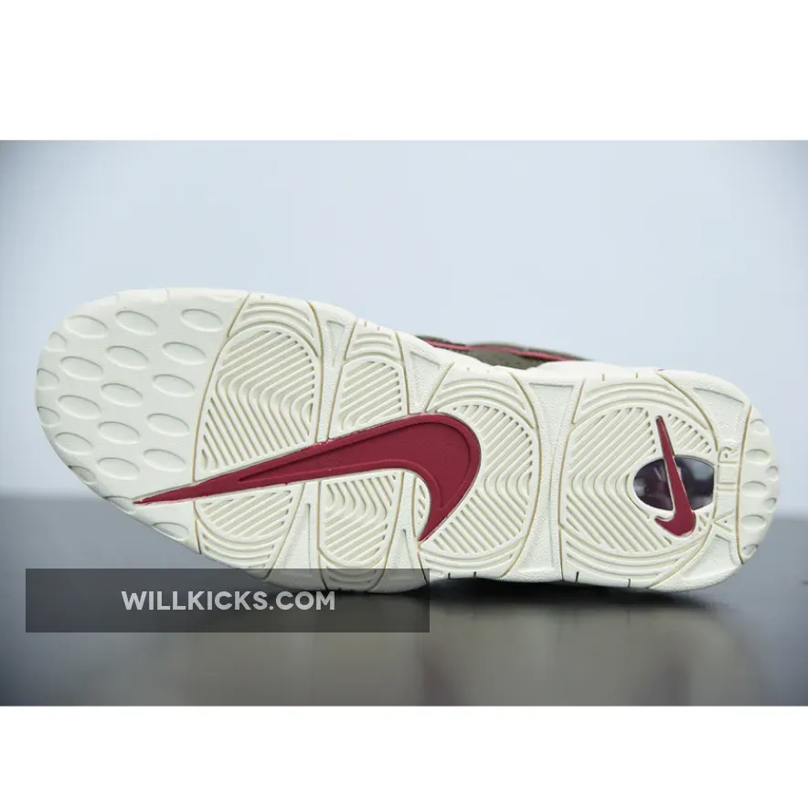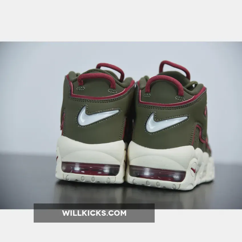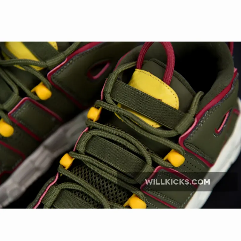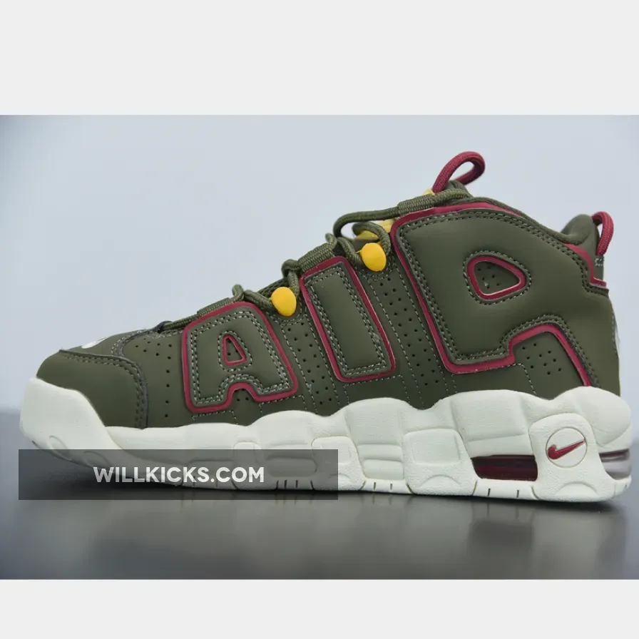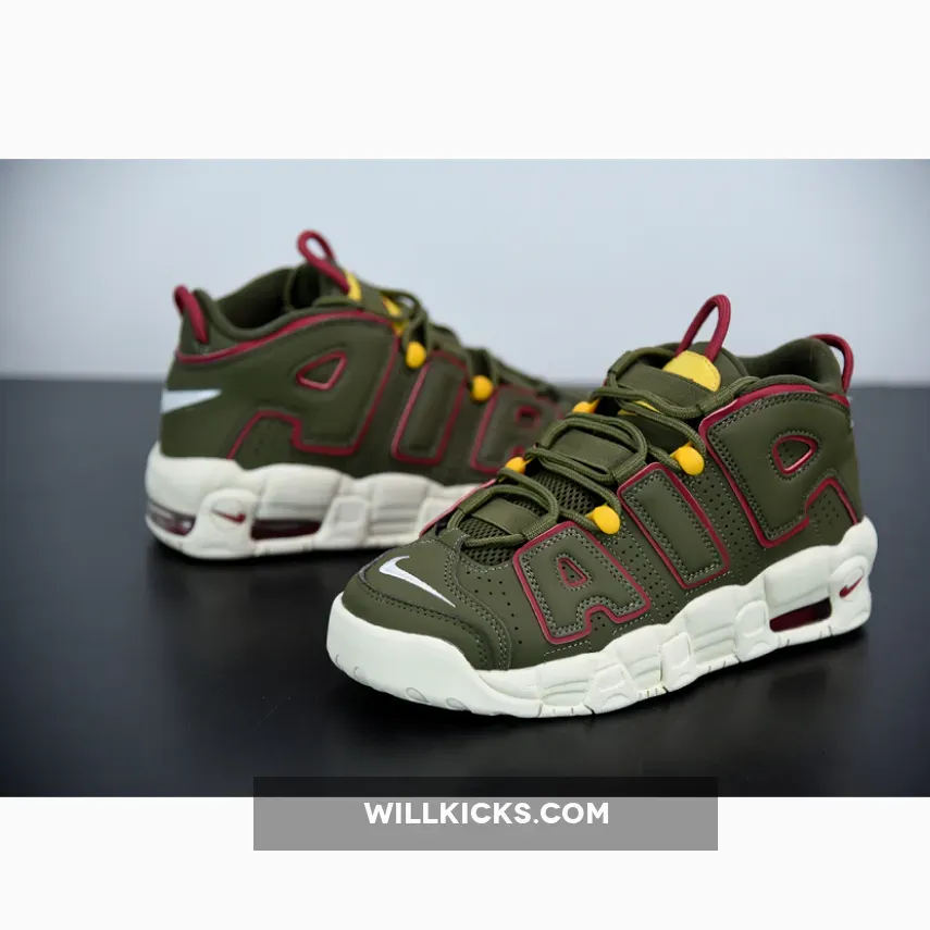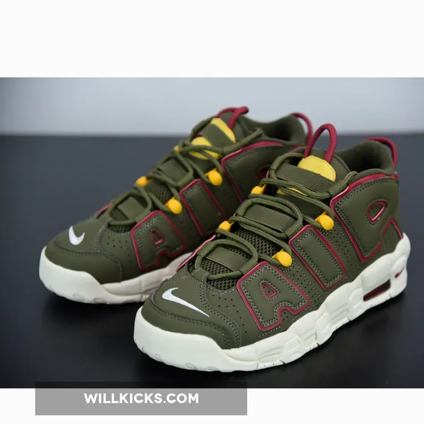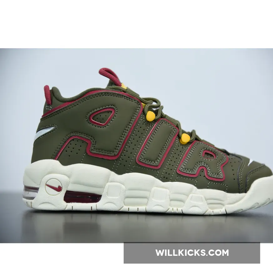 this Nike Air More Uptempo comes with Cargo Khaki across the upper along with Red which is applied to tongue and heel loops, outlining the large ‘AIR’ on the panels and placed within the Air Max unit. Following we have Yellow hinted on the tongue, White embroidered Swoosh on the toe while Sail covers the midsole and outsole to finish the look.
